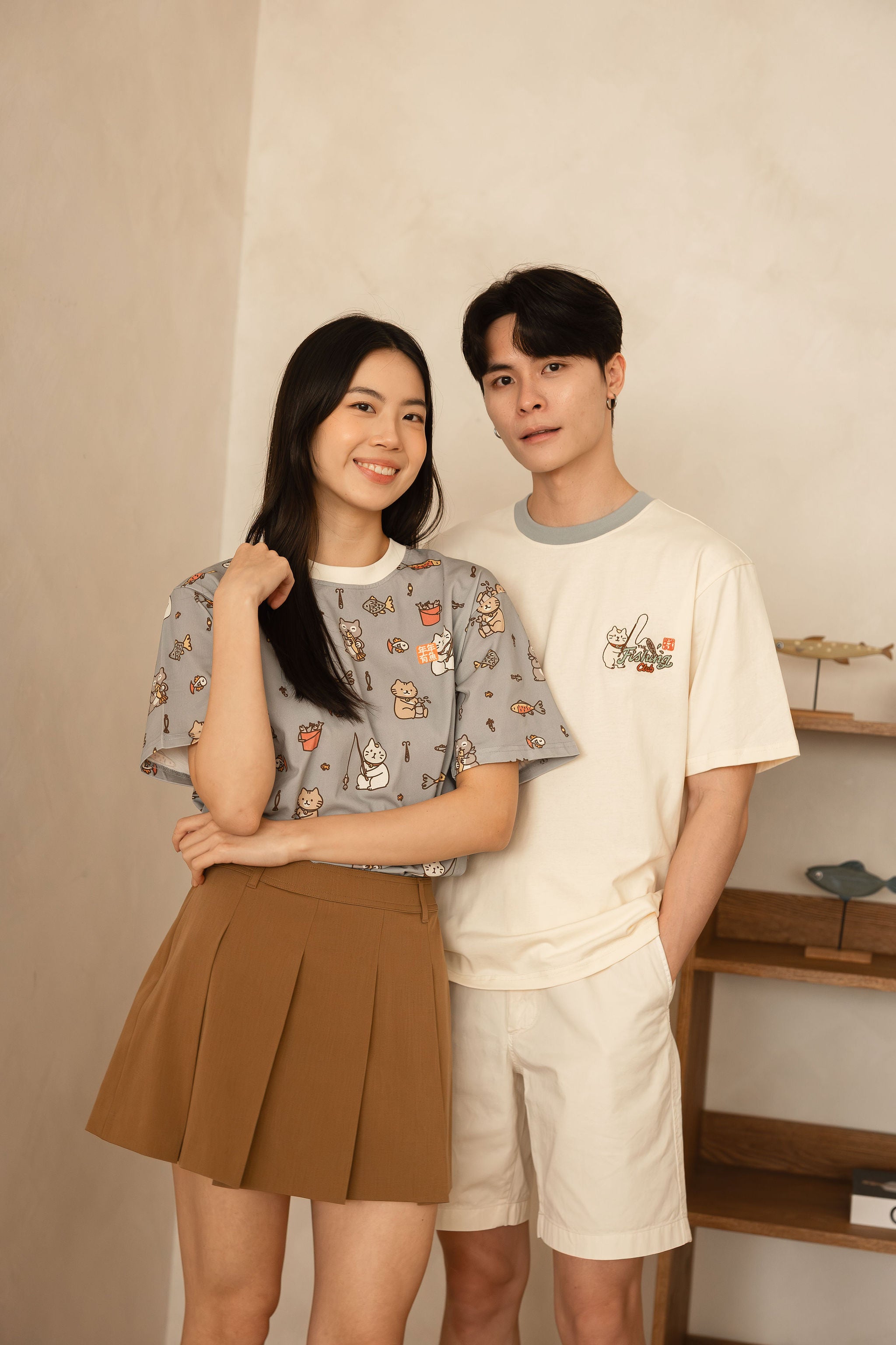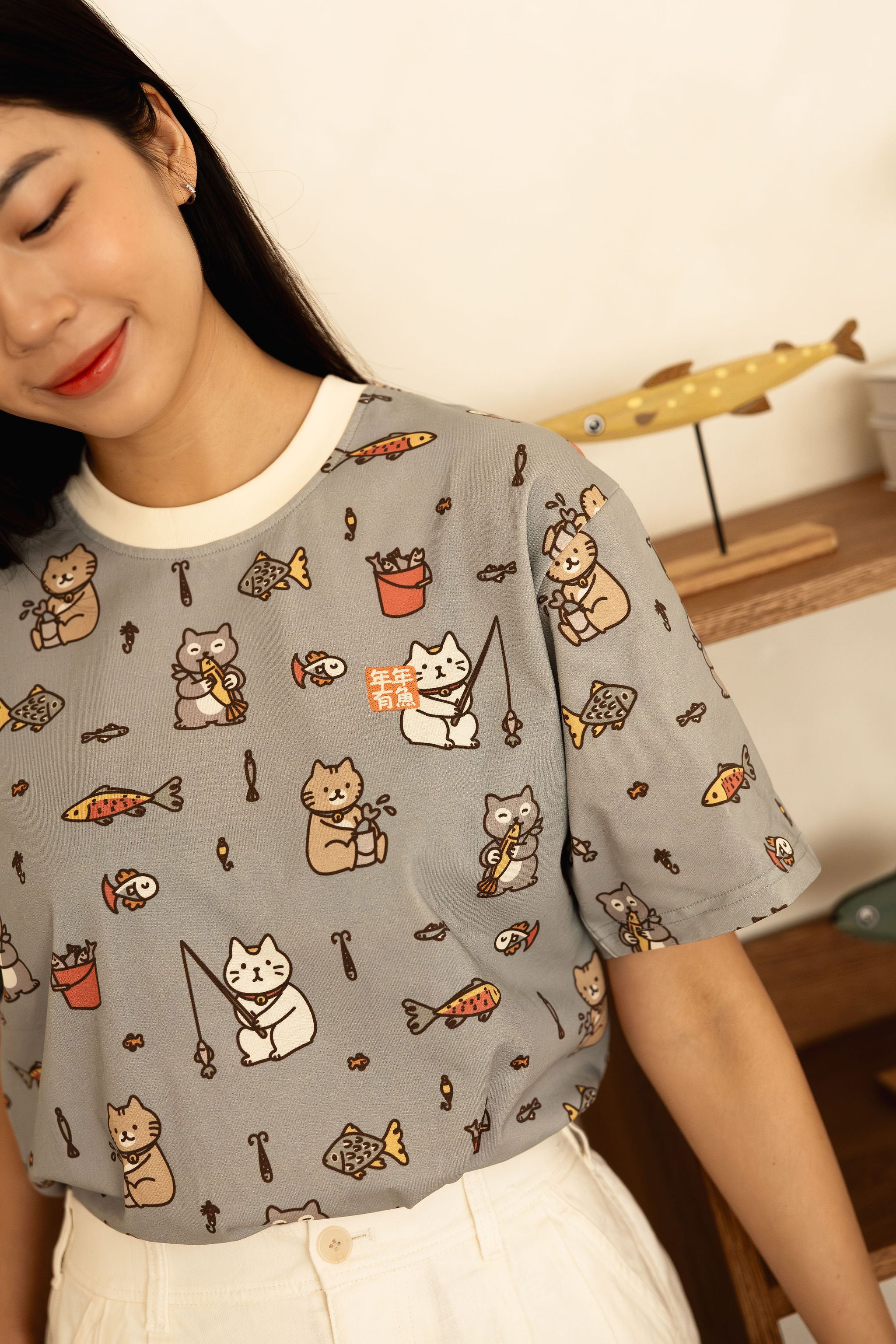 The Fishing Club Full Print Adult Tee features adorable cats fishing, splashing around, and reeling in 年年有鱼 luck. With an embroidered 年年有鱼 patch on the chest, this tee symbolises abundance for the new year while keeping things playful and photo-ready.