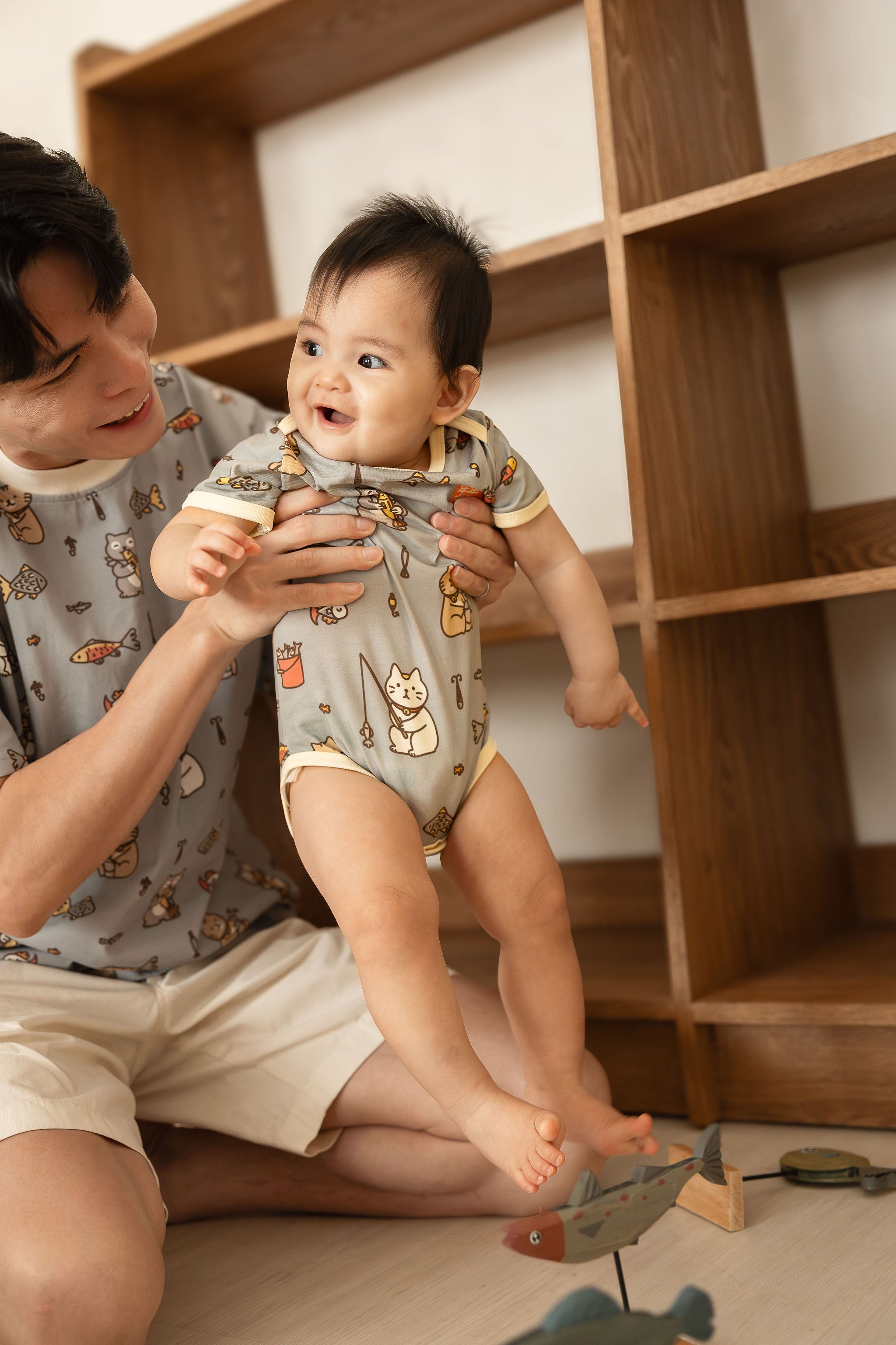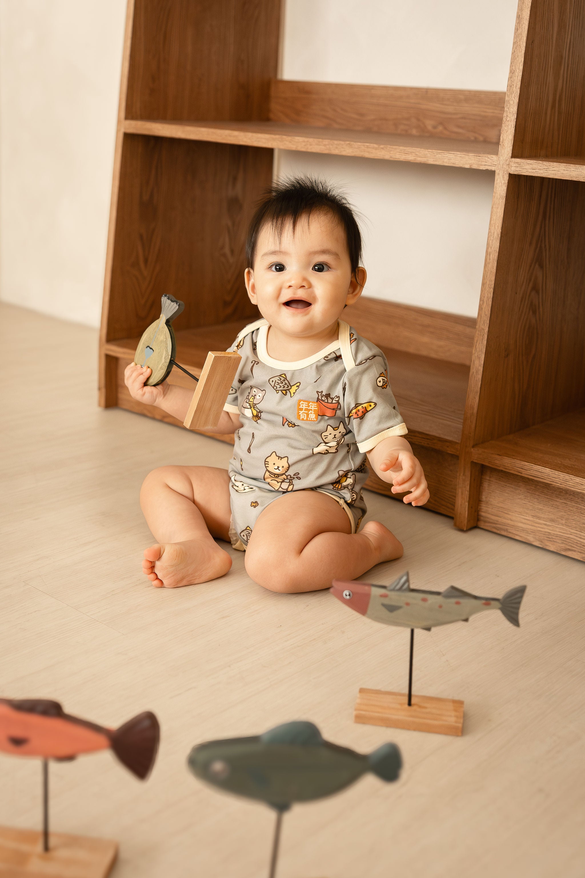 Our Fishing Club Baby Romper is made for tiny explorers — featuring an embroidered 年年有鱼 logo and full-print fishing cats. Gentle, breathable cotton keeps baby comfy during visiting, naps and photo sessions.