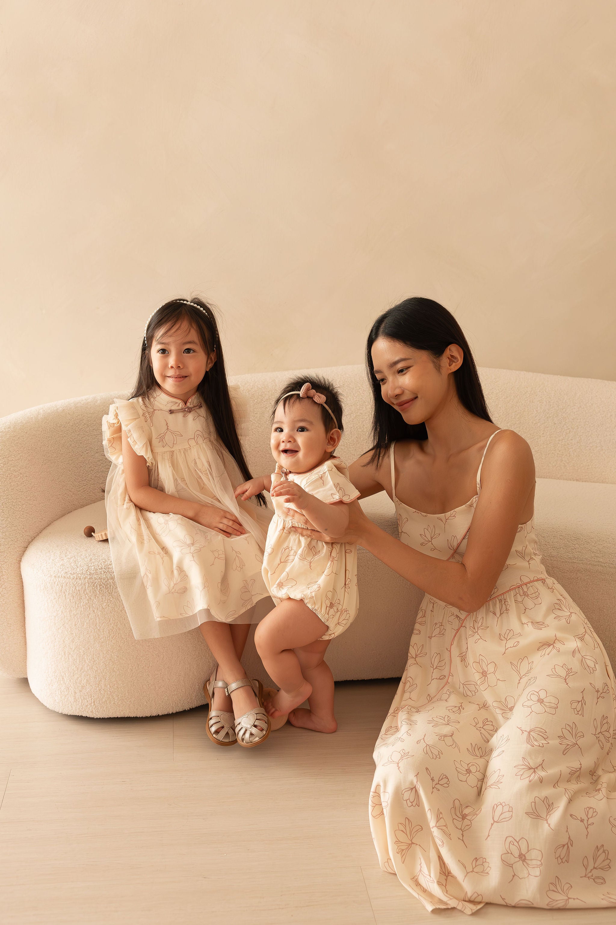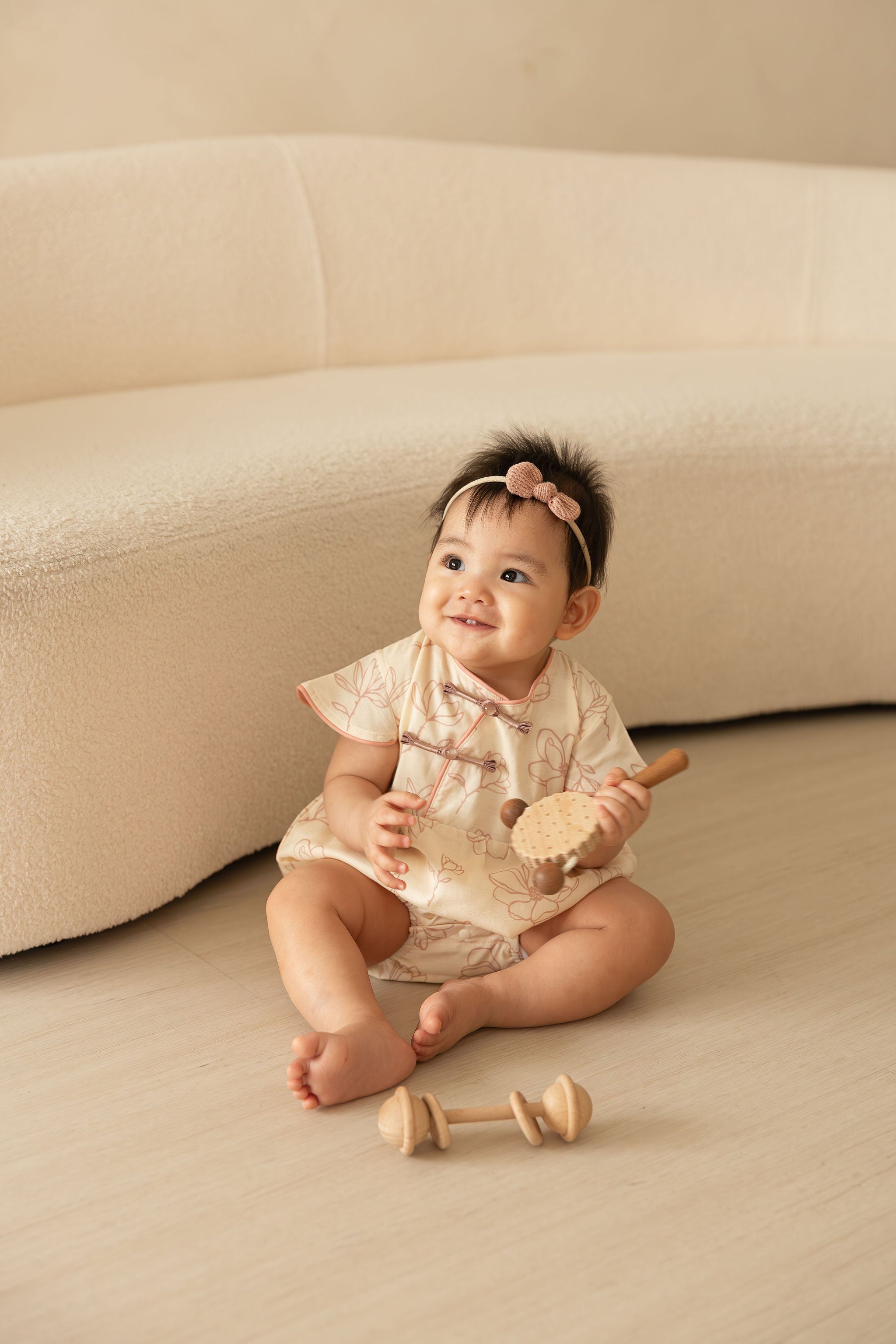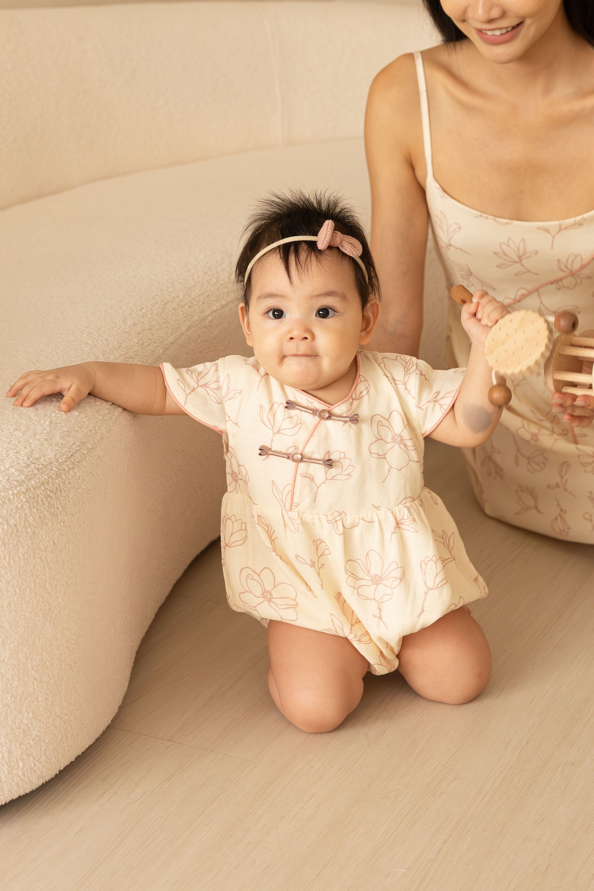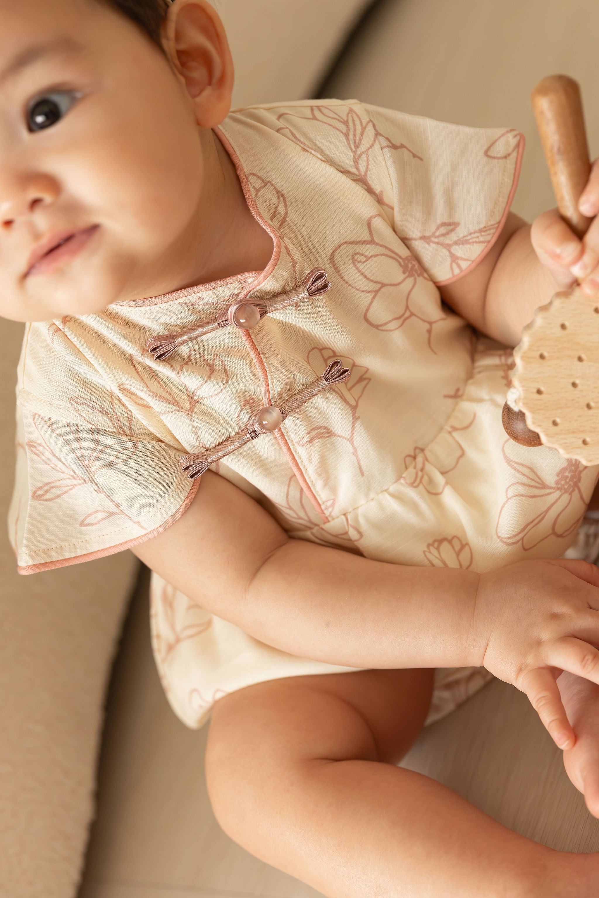 Le Fleur Magnolia Baby Cheongsam Bubble Romper in Crème Rosé features a traditional mandarin collar, delicate double knot buttons, and a soft bubble silhouette designed for comfort and movement. Made from breathable Tencel-Linen, gentle on baby skin — perfect for visiting, photos, and twinning moments this CNY2026.