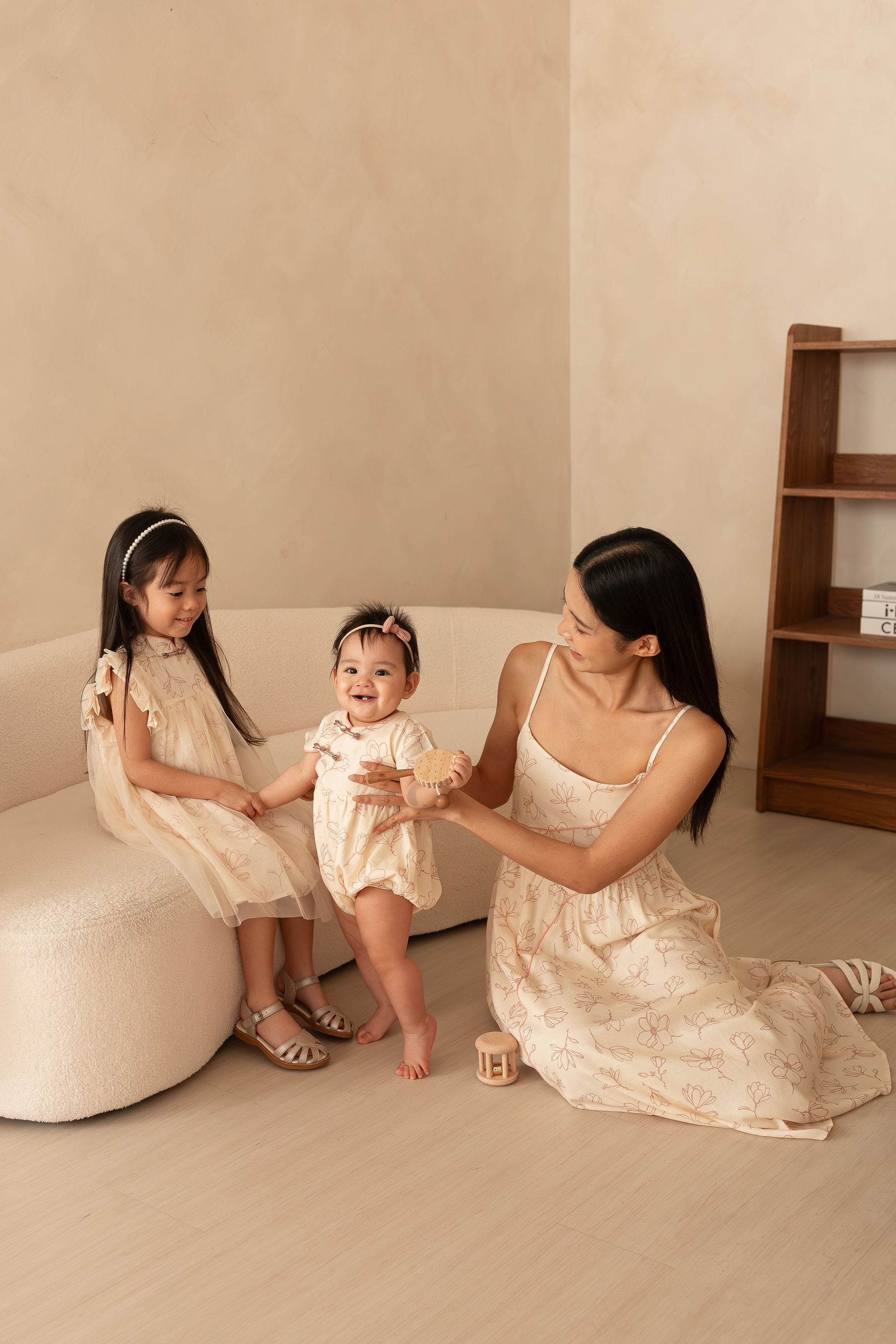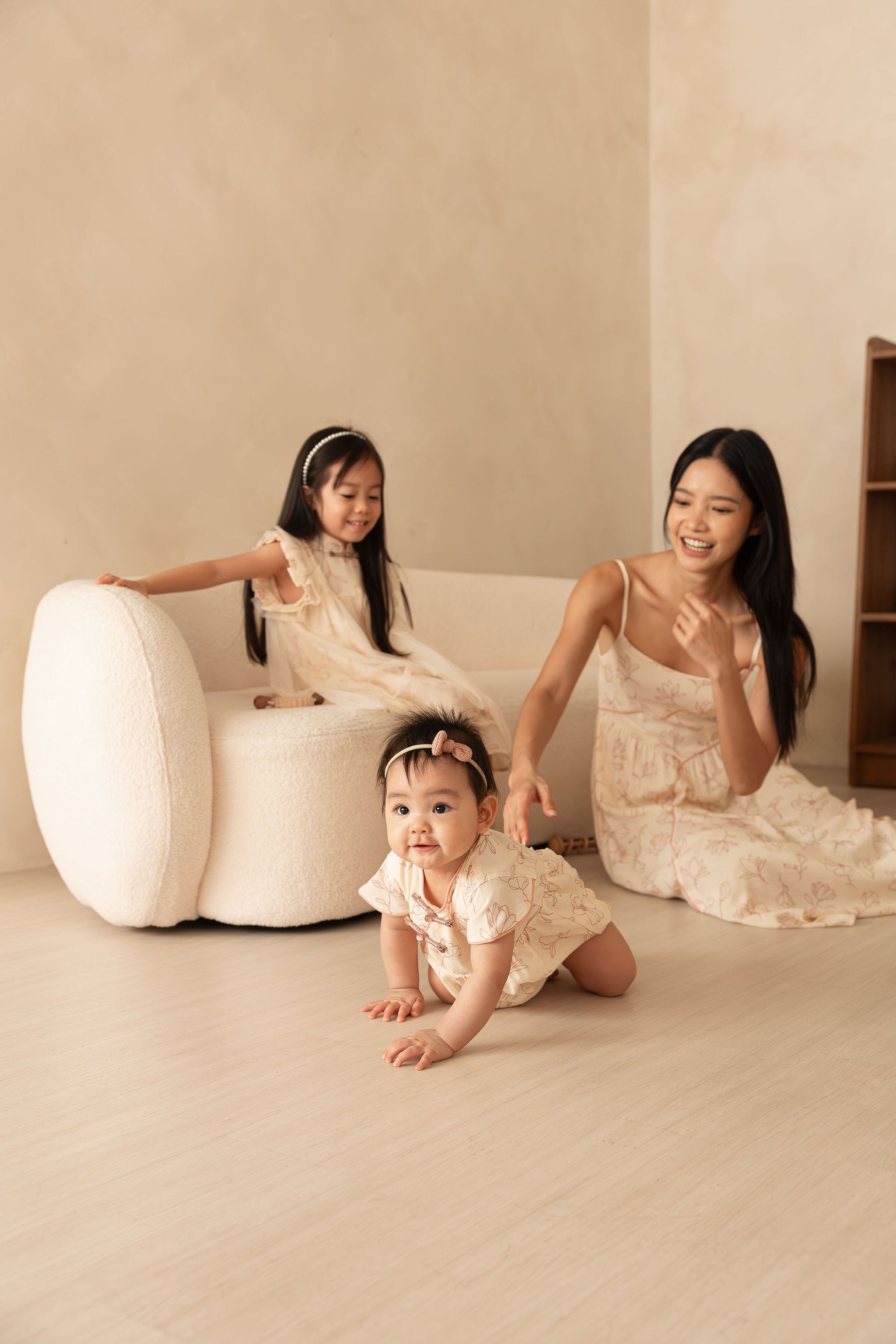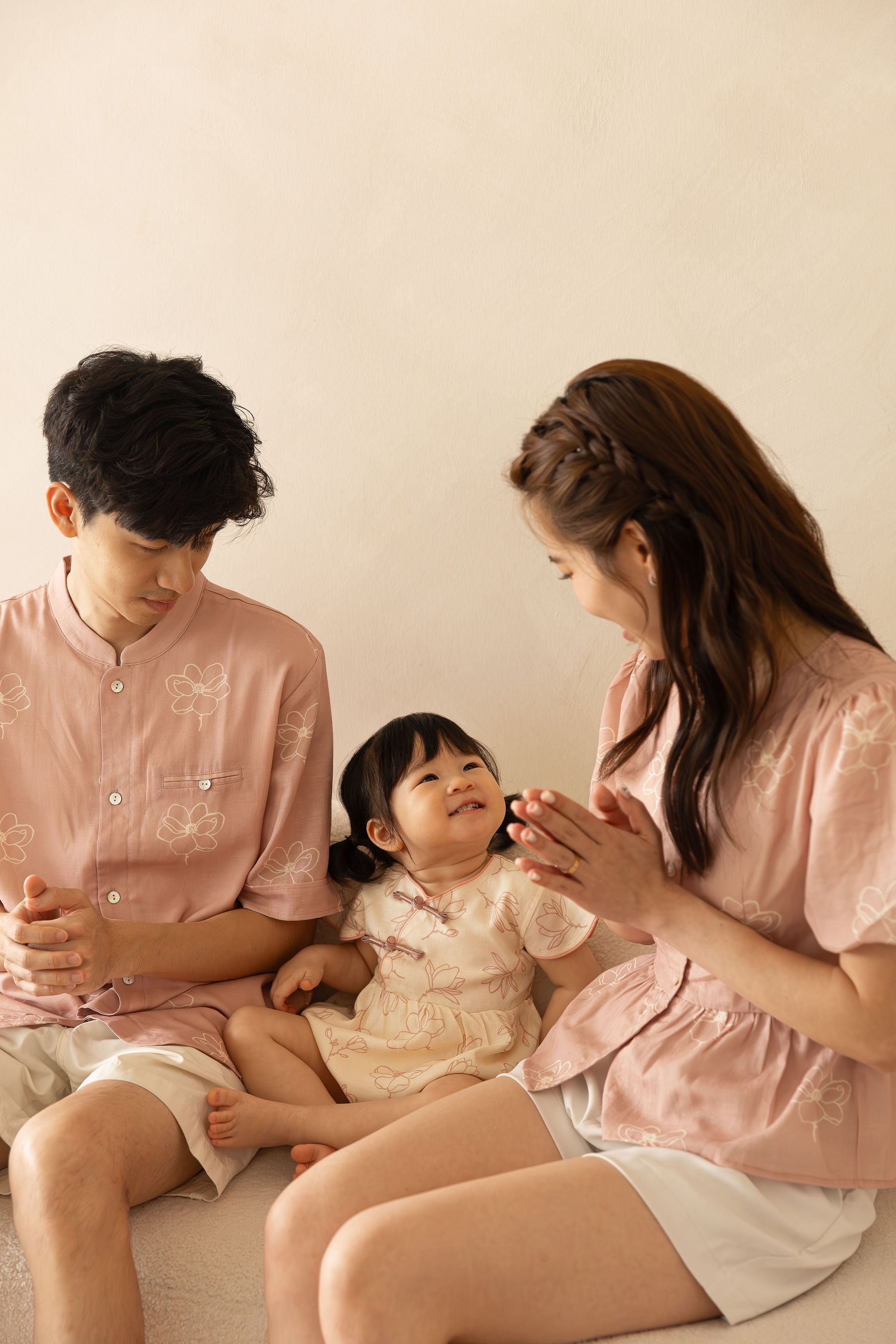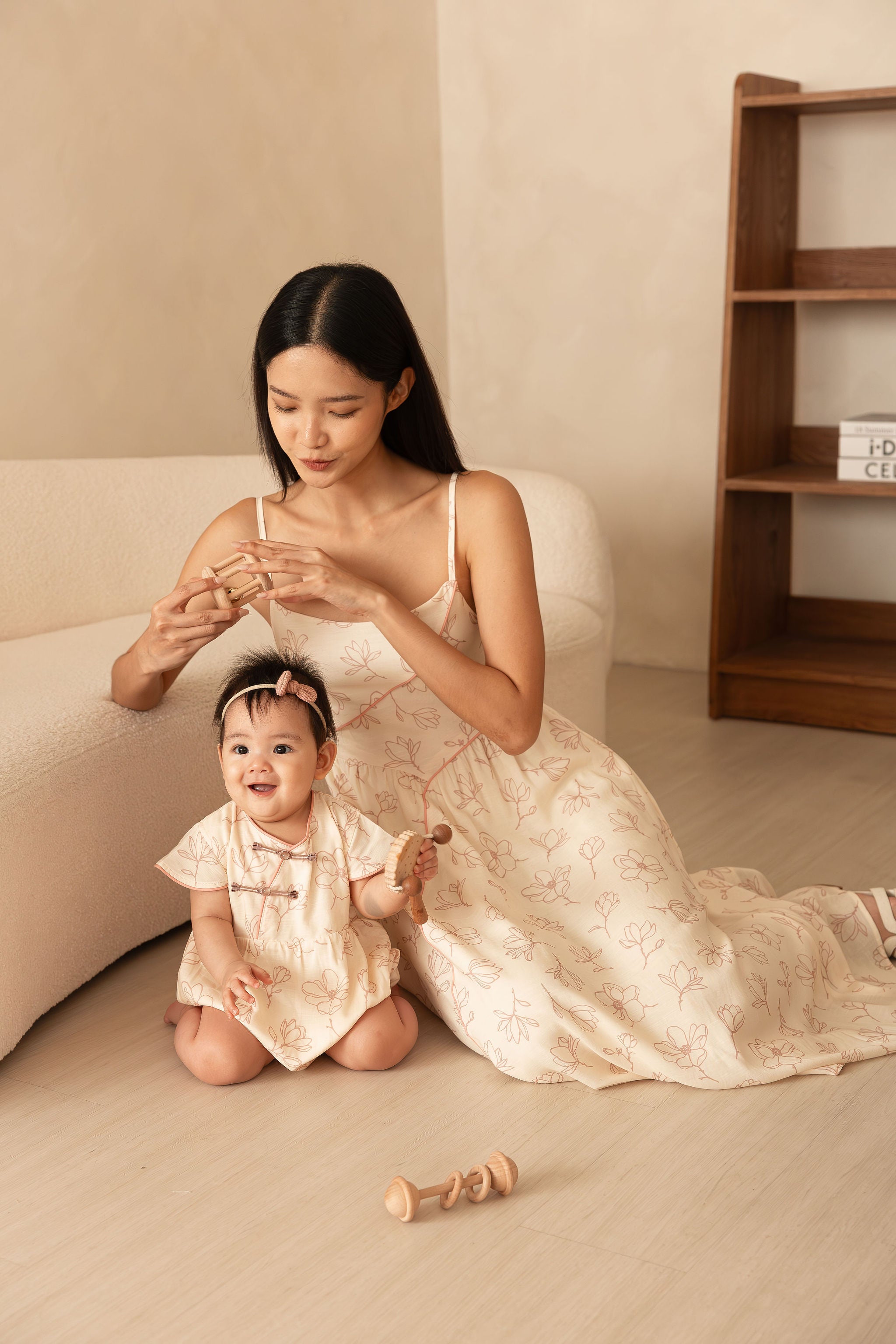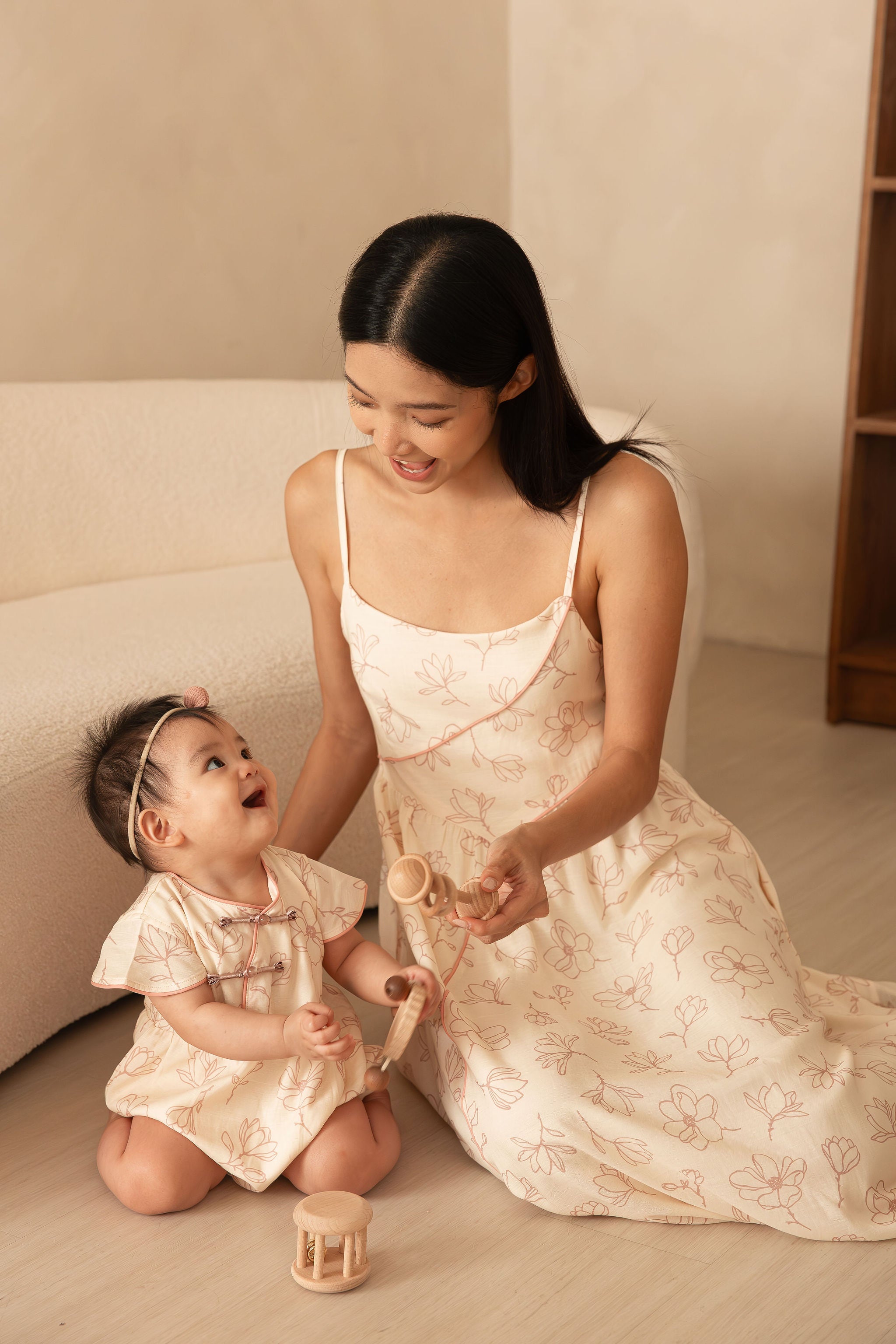Le Fleur Magnolia Baby Cheongsam Bubble Romper in Crème Rosé features a traditional mandarin collar, delicate double knot buttons, and a soft bubble silhouette designed for comfort and movement. Made from breathable Tencel-Linen, gentle on baby skin — perfect for visiting, photos, and twinning moments this CNY2026.