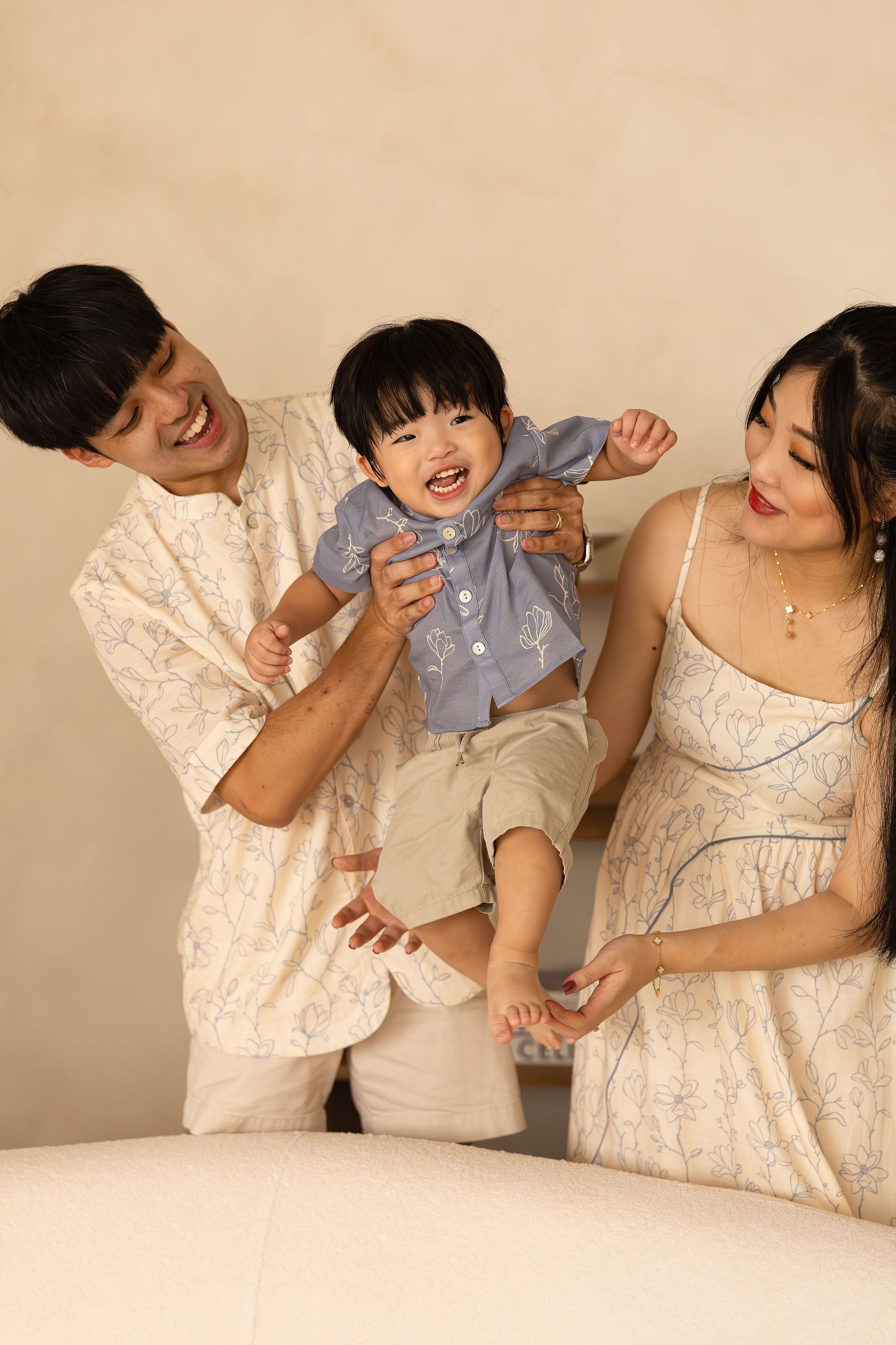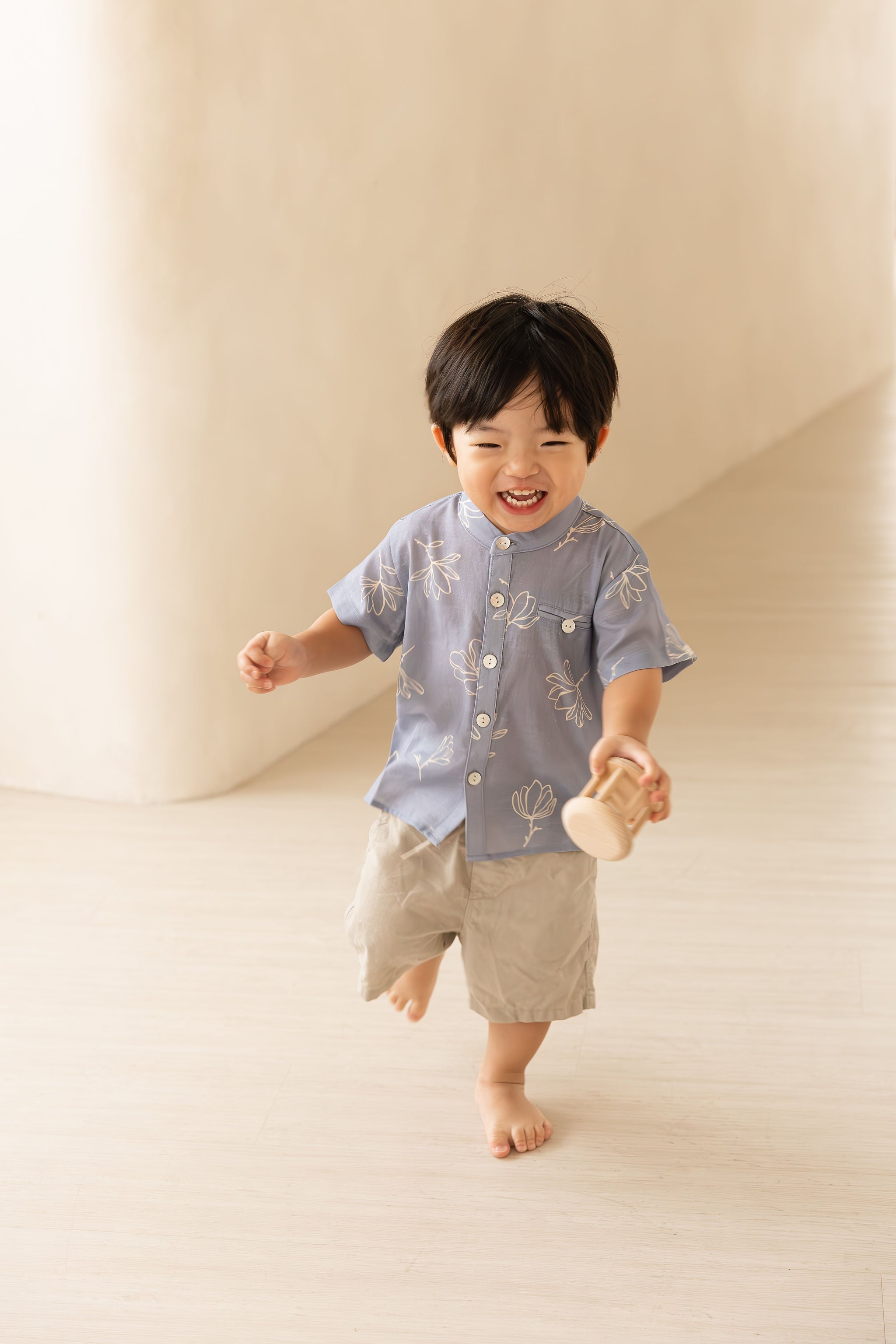 In a fresh Bleu Crème tone, this mandarin shirt brings a modern, polished touch for CNY 2026. Comfortable for little movers with a structured yet soft fit. A perfect sibling match with Magnolia dresses & rompers.
