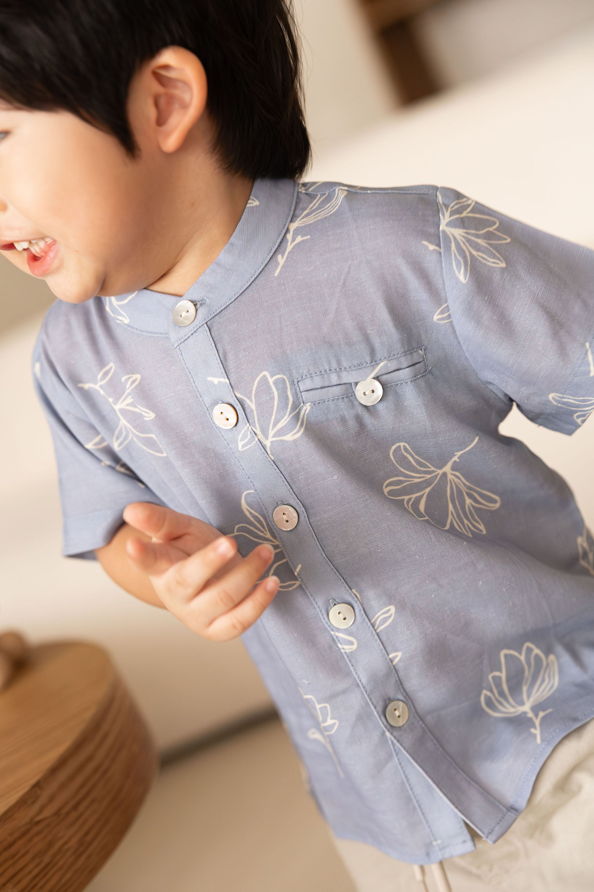 Le Fleur Magnolia - Boys’ Mandarin Collar Shirt in Bleu Crème