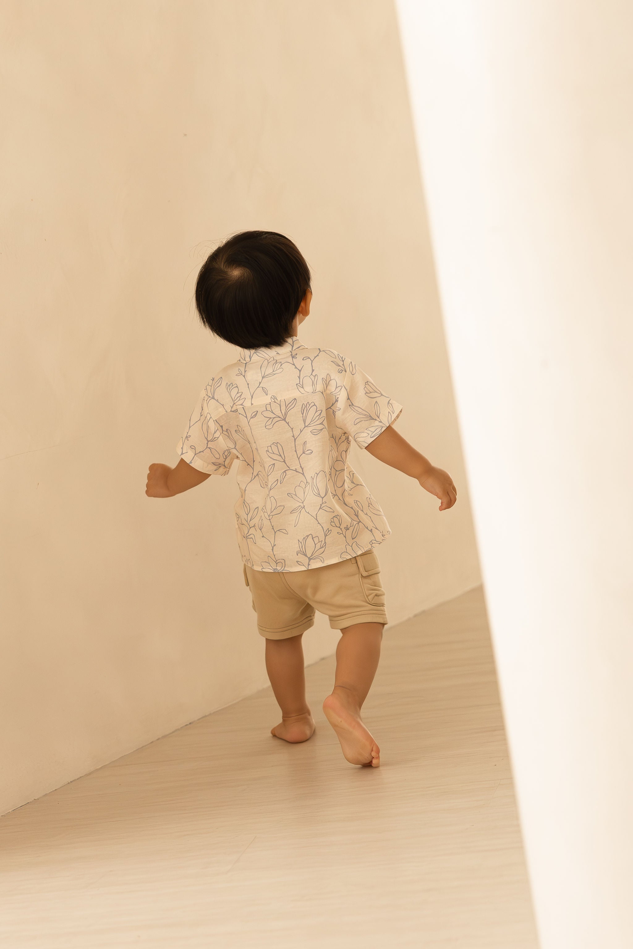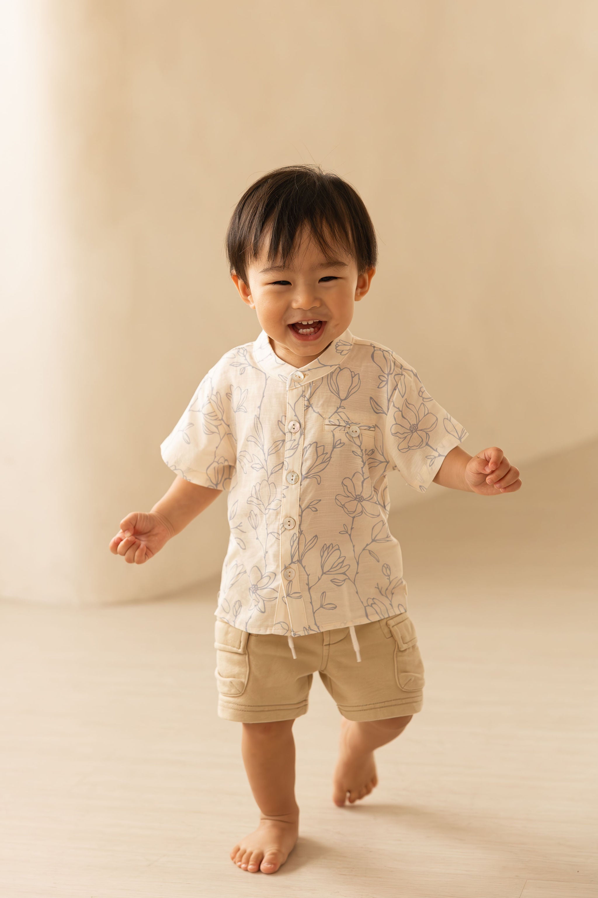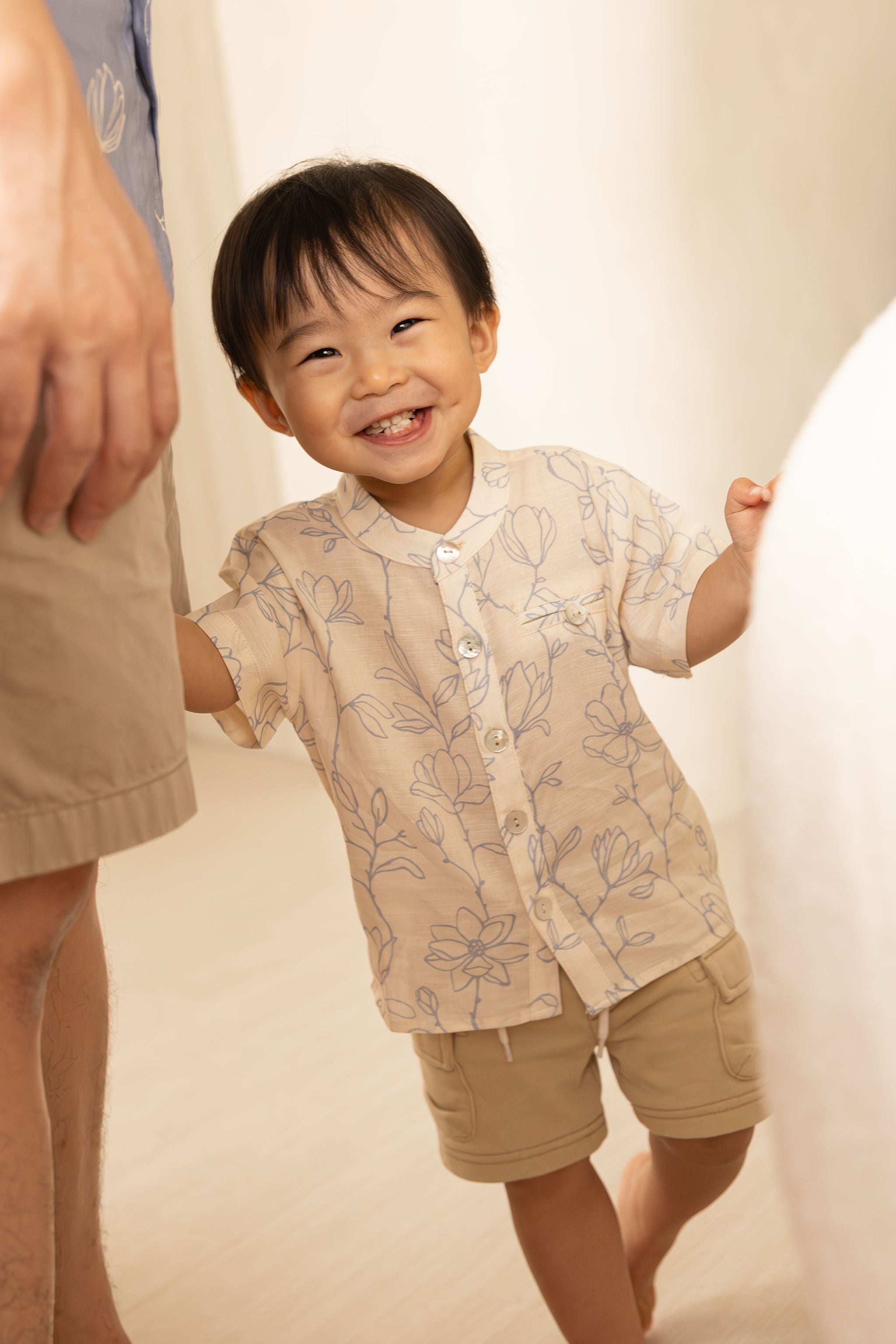 A classic festive shirt reimagined — Magnolia Boys’ Mandarin Collar Shirt in Crème Bleu features soft floral strokes and button-down ease. Breathable, comfortable and perfect for full-day wear. Pair with khaki shorts for an effortless CNY look that photographs beautifully.