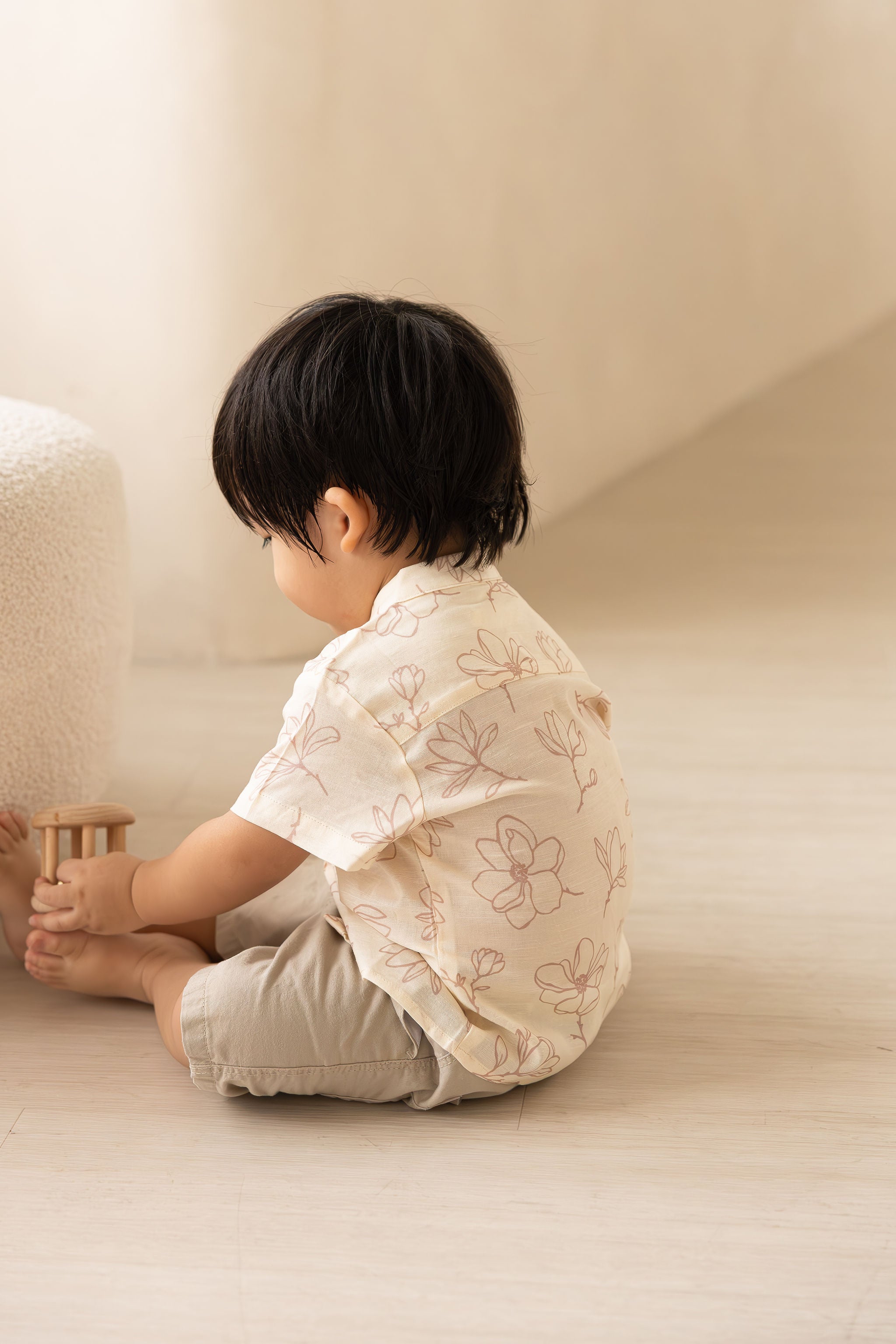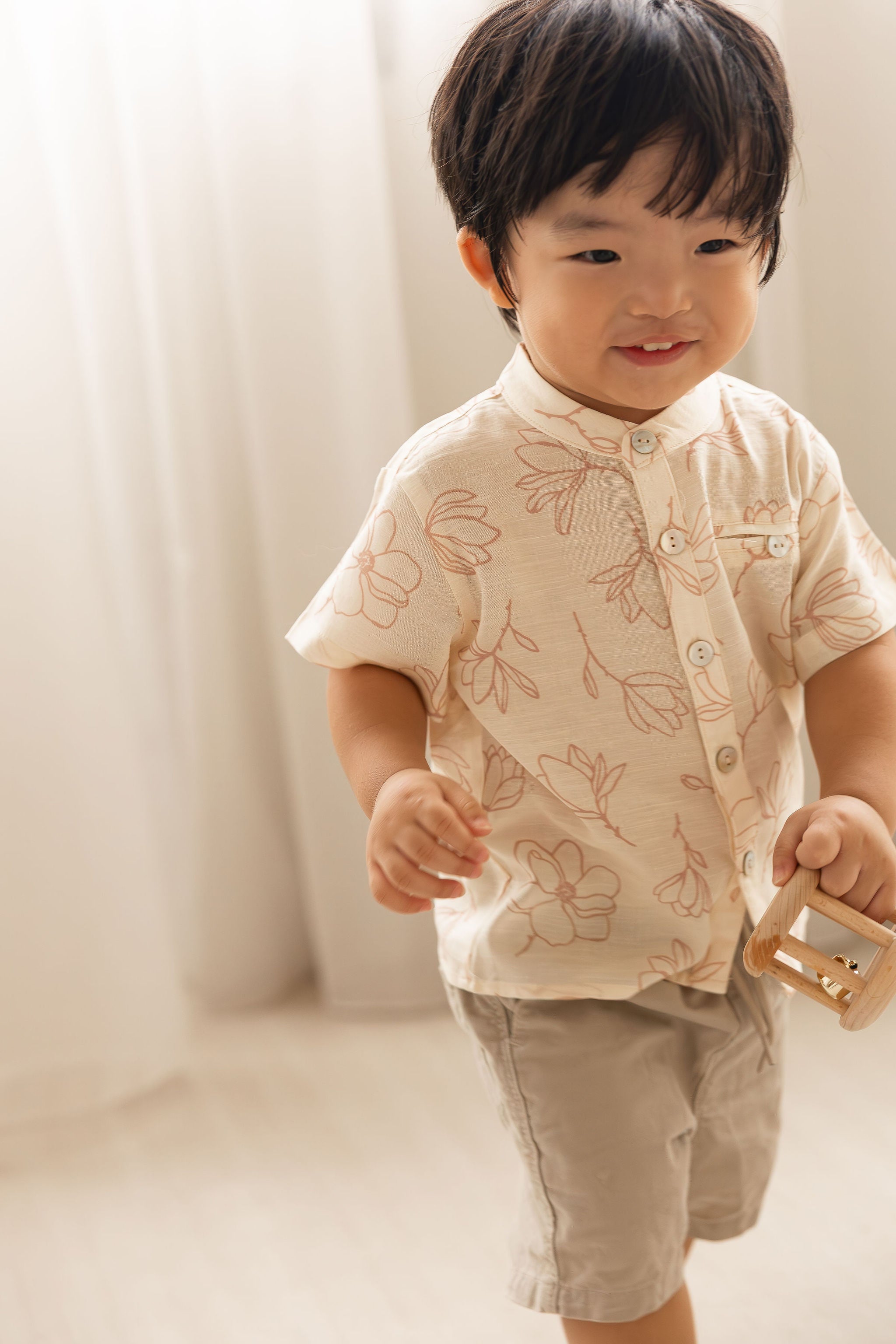 Le Fleur Magnolia - Boys’ Mandarin Collar Shirt in Crème Rosé