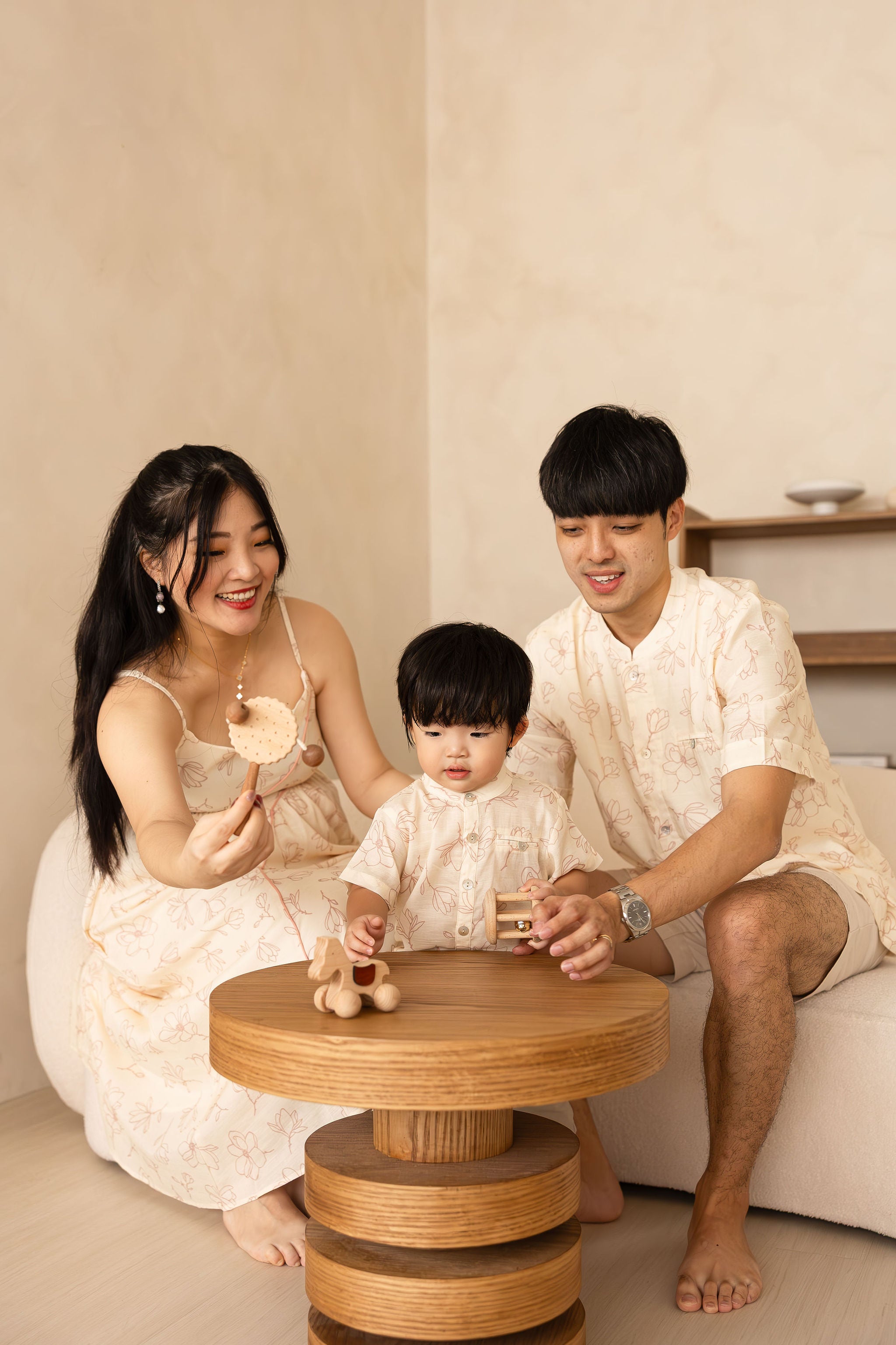 Le Fleur Magnolia Boys’ Mandarin Collar Shirt features a soft stand Mandarin collar, clean button-down front and our signature magnolia line-art print. Made in breathable Tencel-Linen, this piece keeps him cool and comfortable through house visits, photoshoots and reunion moments. Designed to pair effortlessly with our full family collection — picture-perfect twinning made easy.