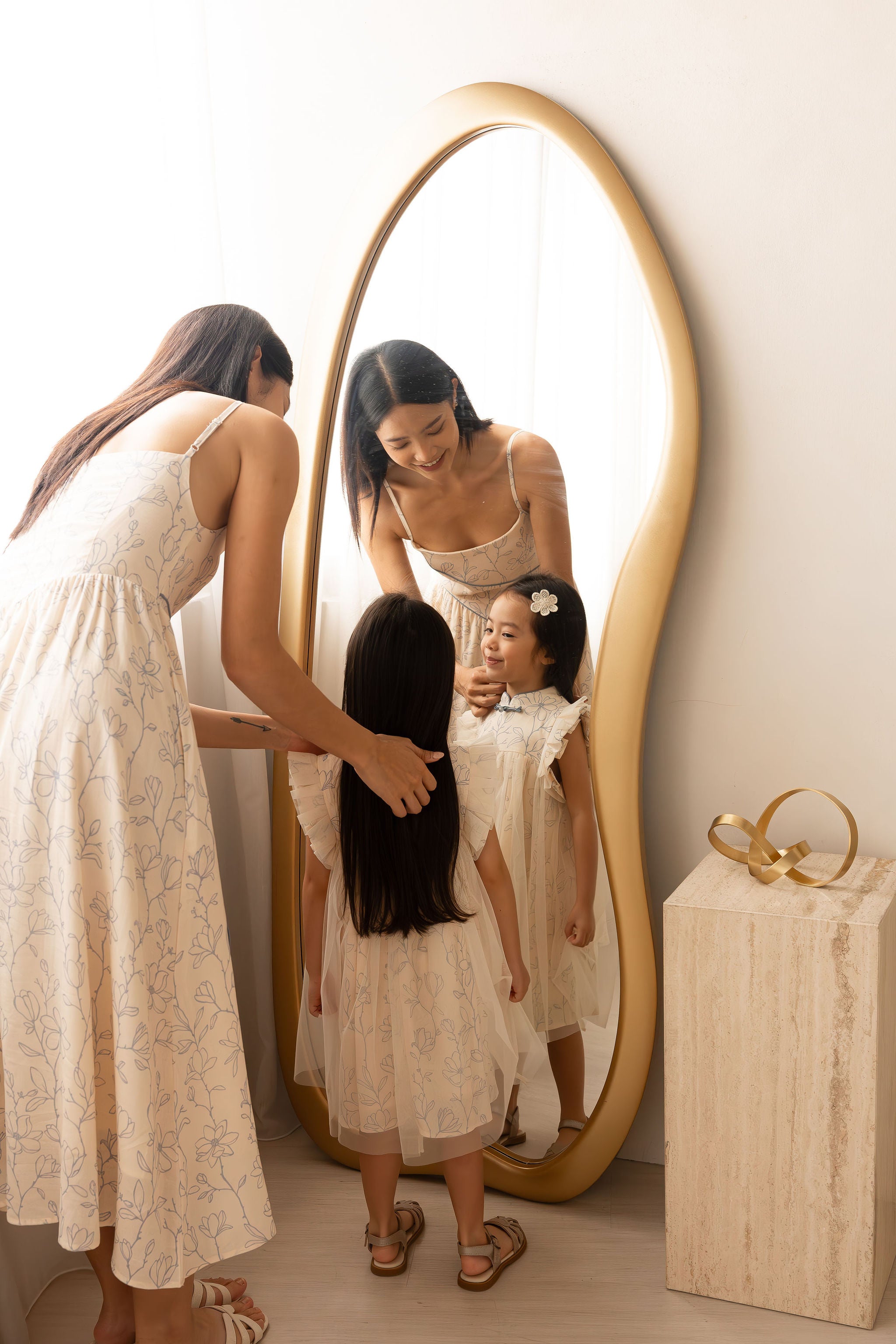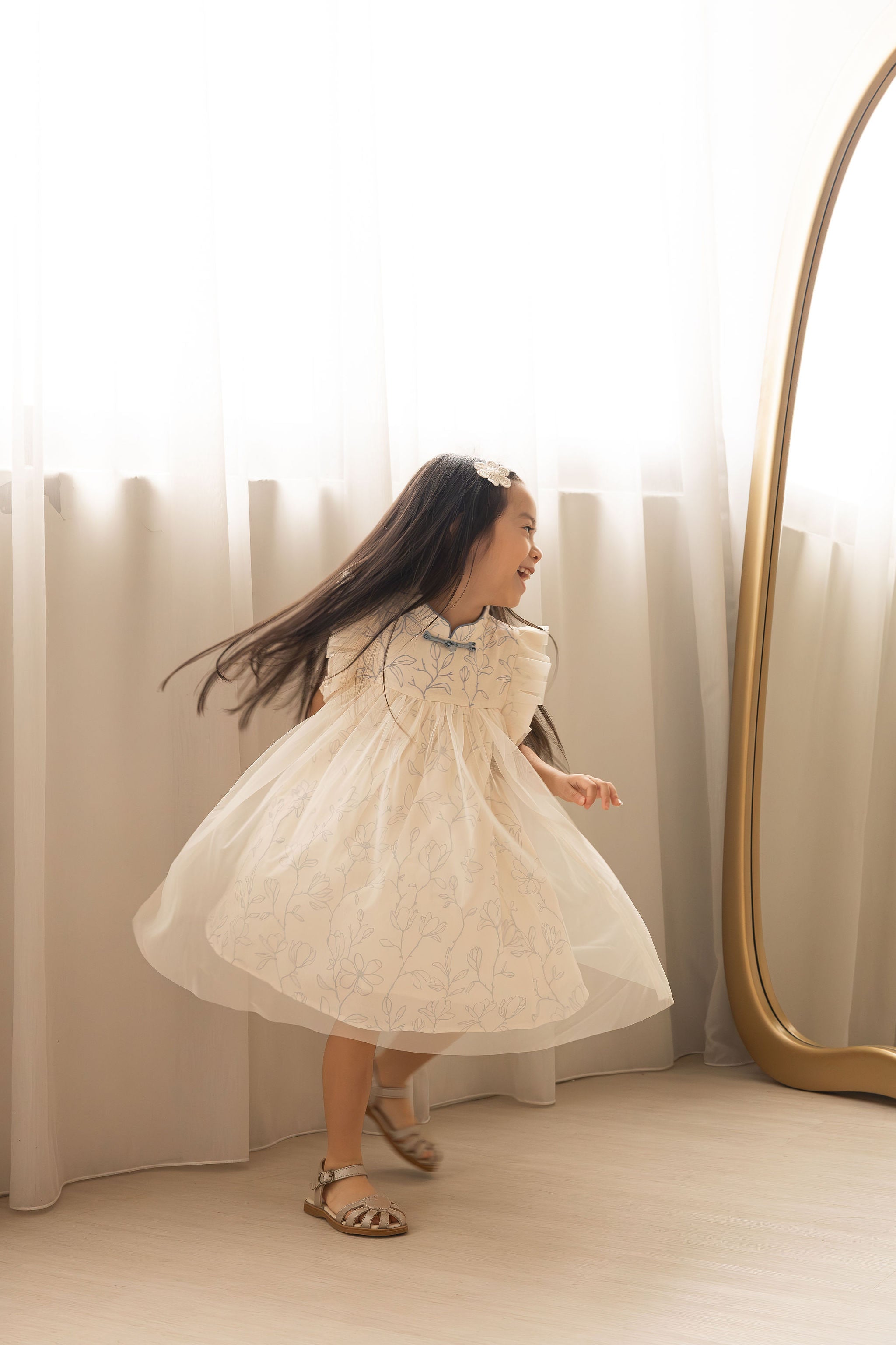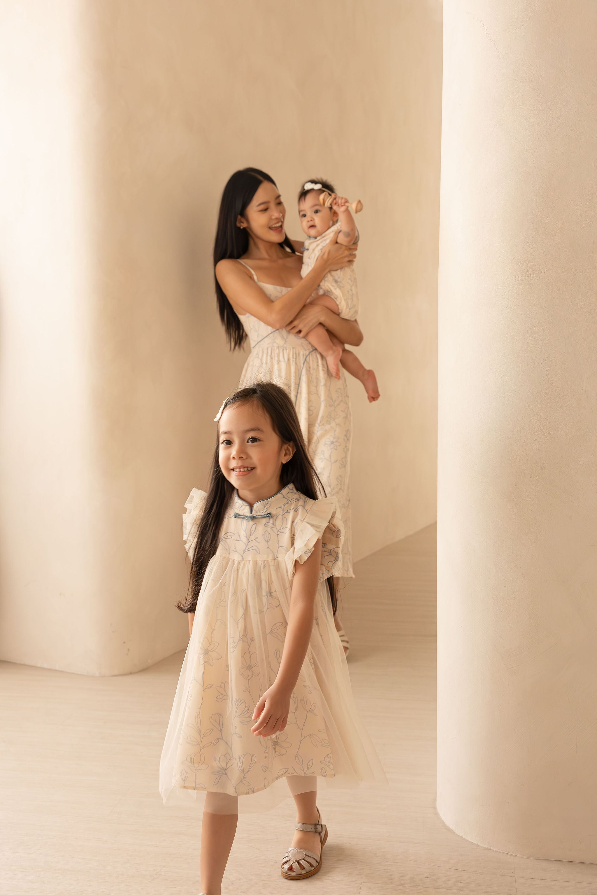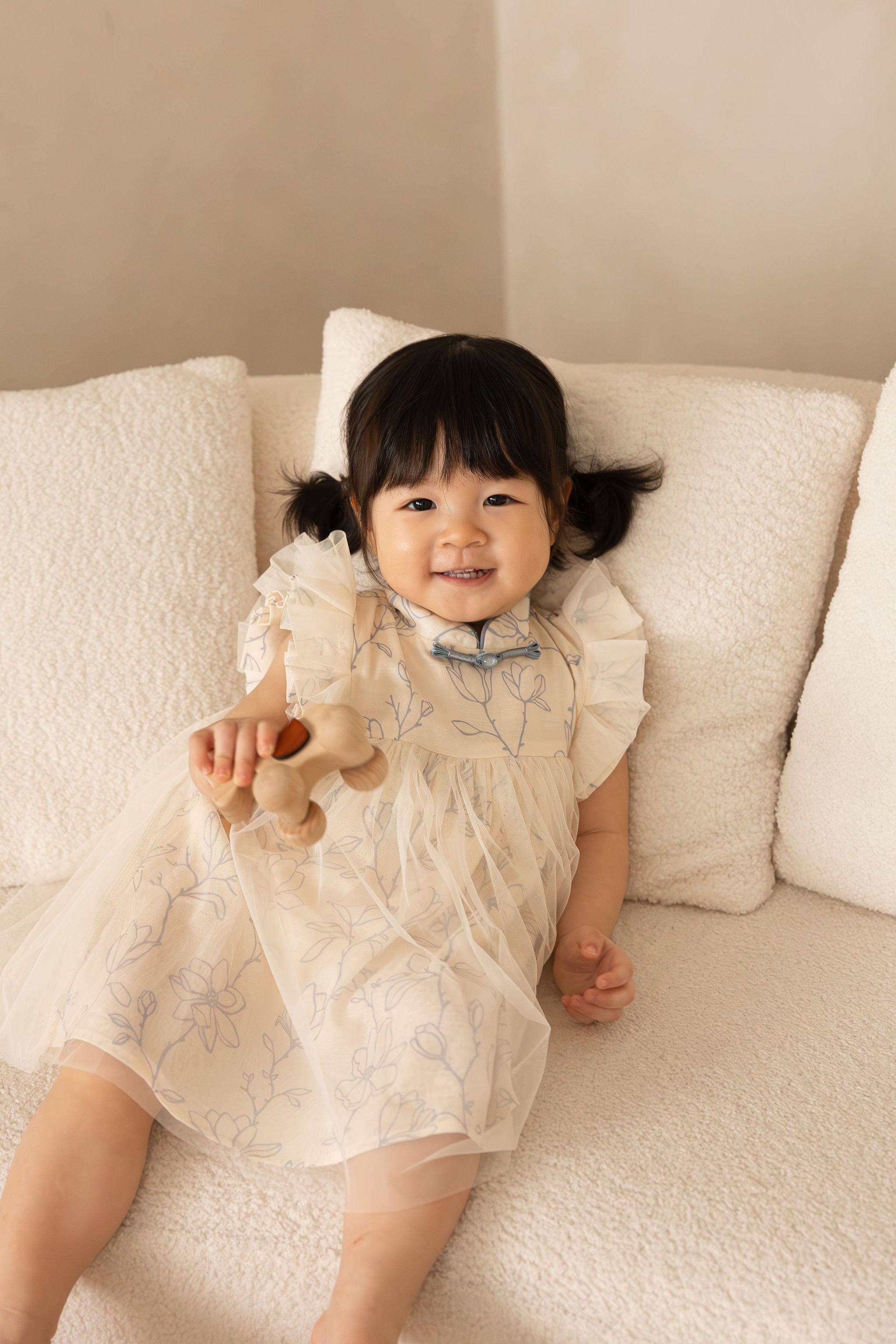 A sweet Cheongsam dream for little ones — Magnolia Flutter Tulle Dress in Crème Bleu features soft flutter sleeves, layered tulle skirt and a mandarin collar finished with mini knotted buttons. Lightweight, gentle on skin & perfect for twirls. Ideal for CNY, family shoots, birthdays and special days worth remembering.