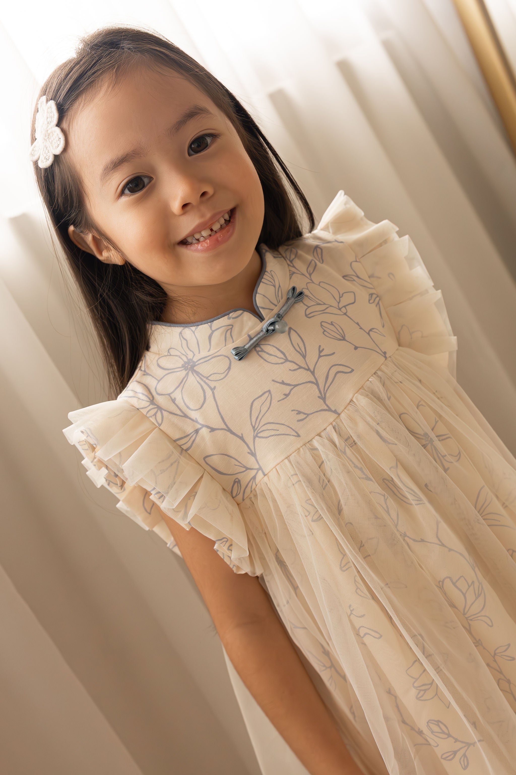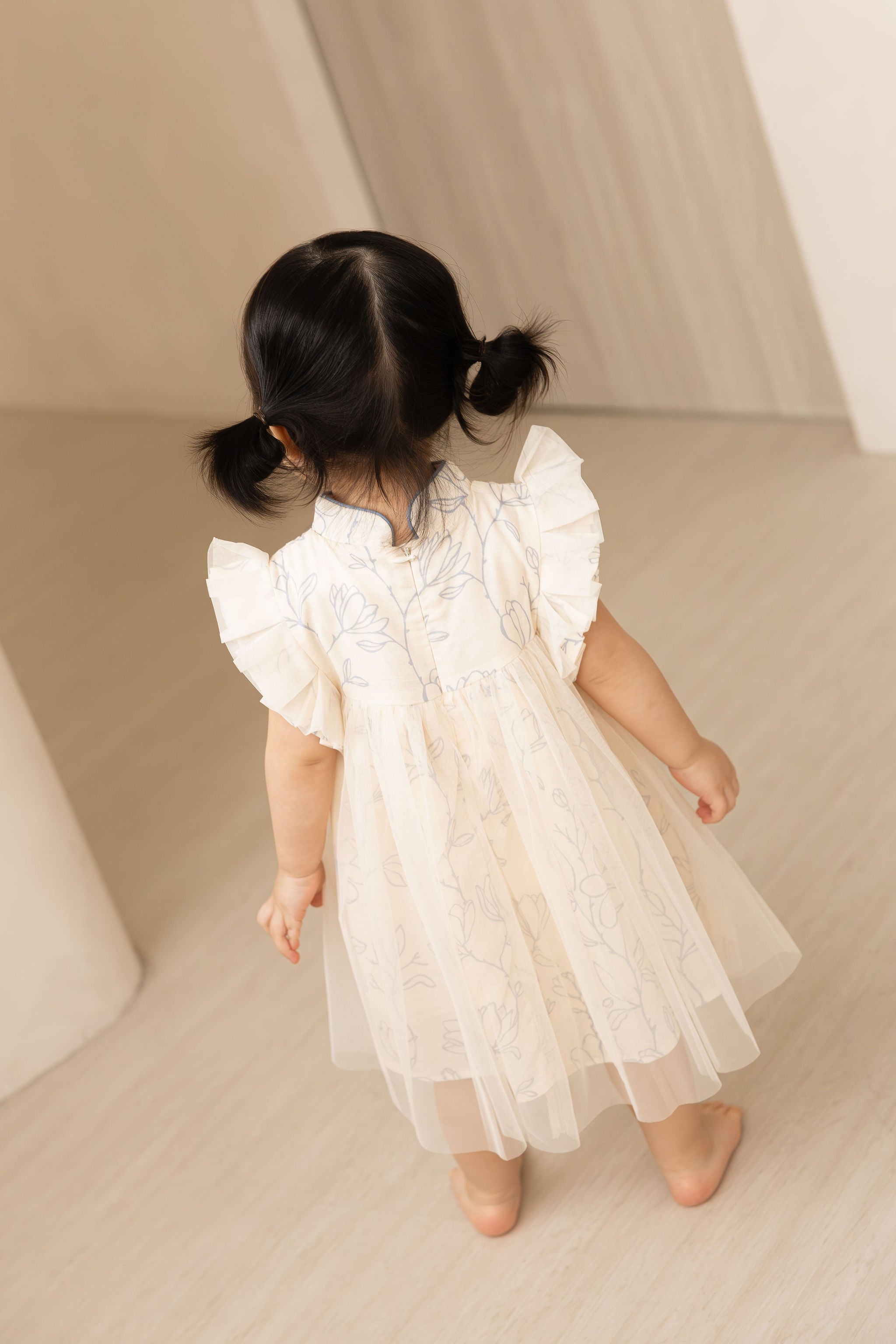Le Fleur Magnolia - Flutter Tulle Girl Cheongsam in Crème Bleu