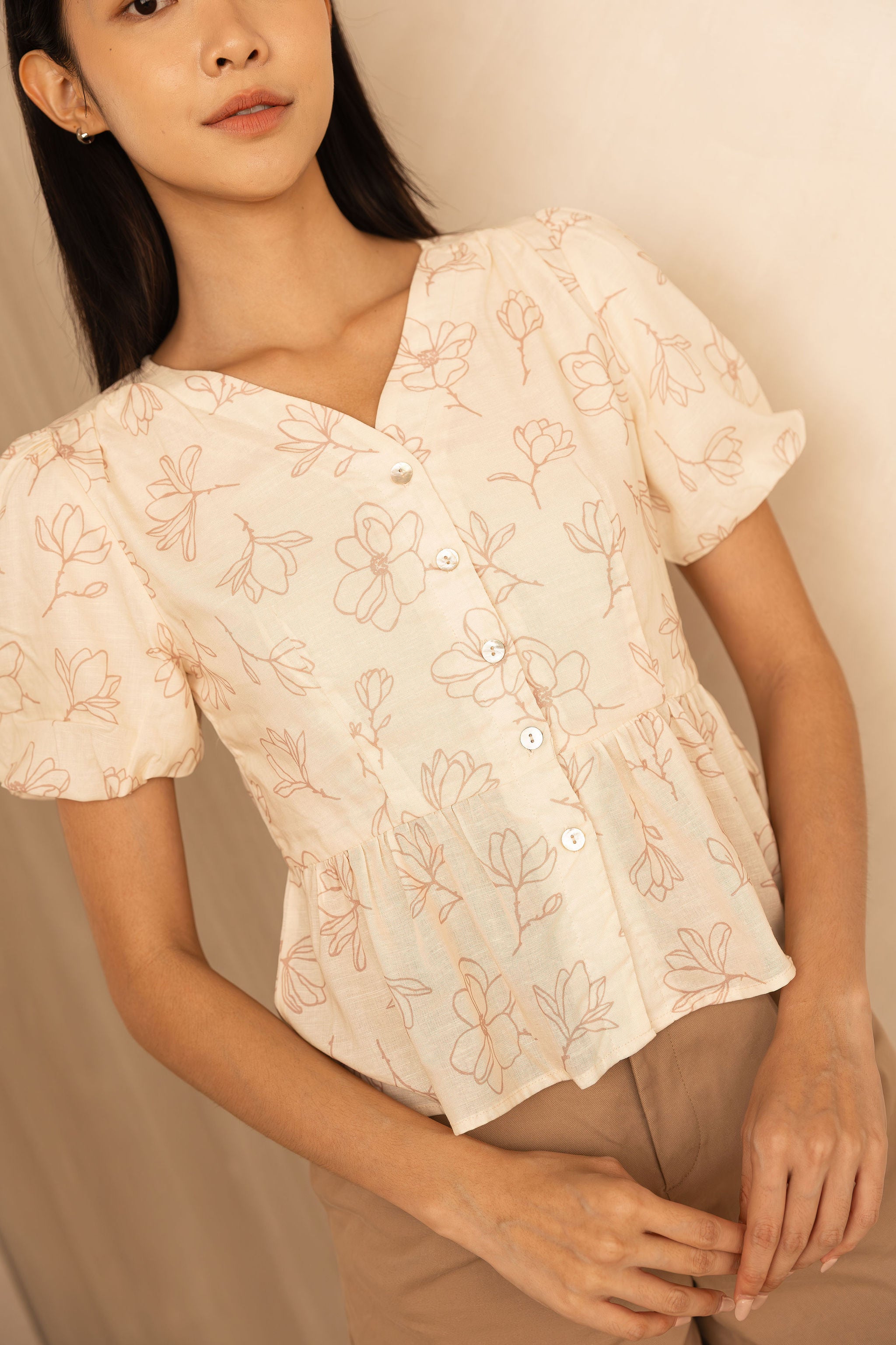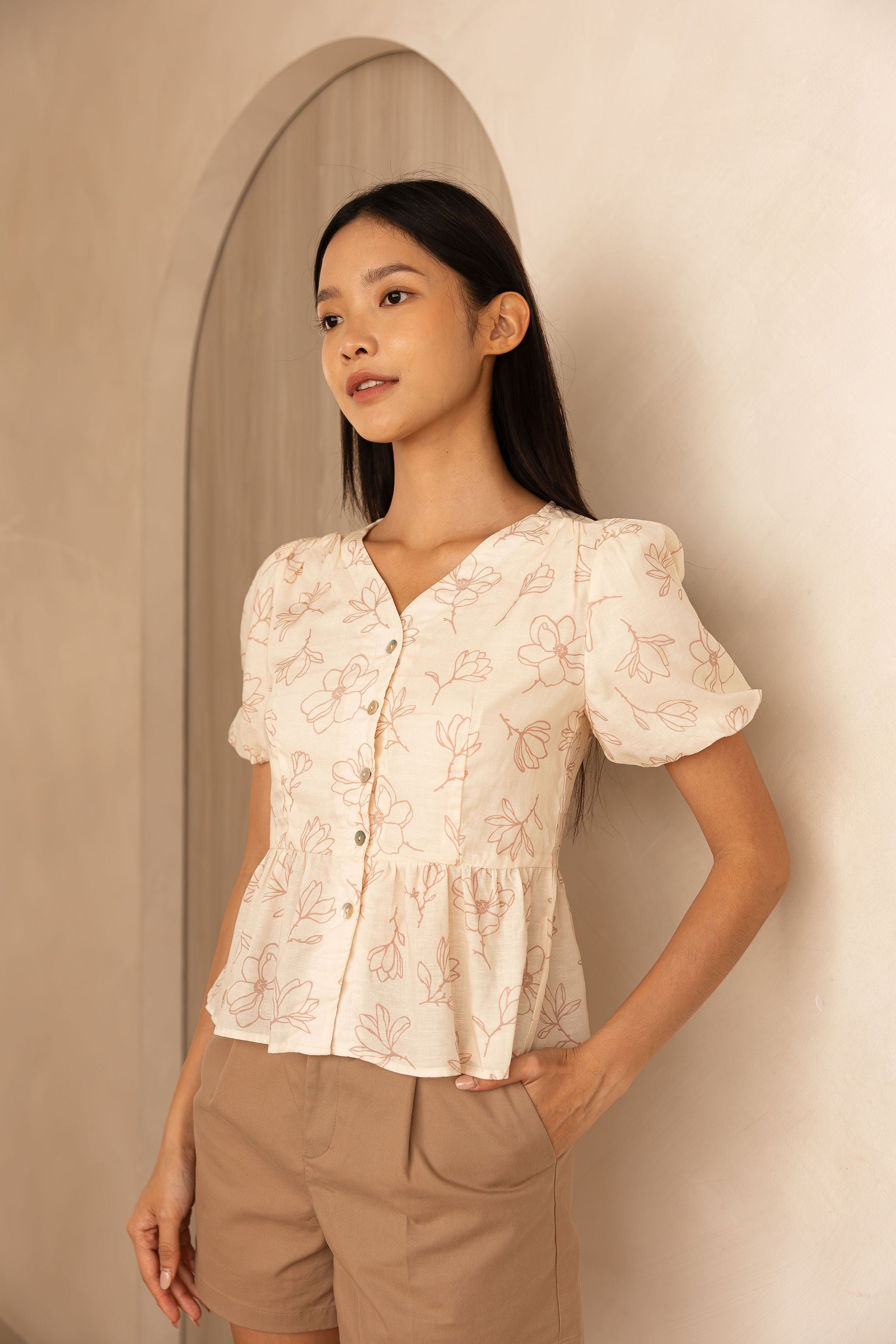 Le Fleur Magnolia - Tencel Linen Peplum Top in Crème Rosé