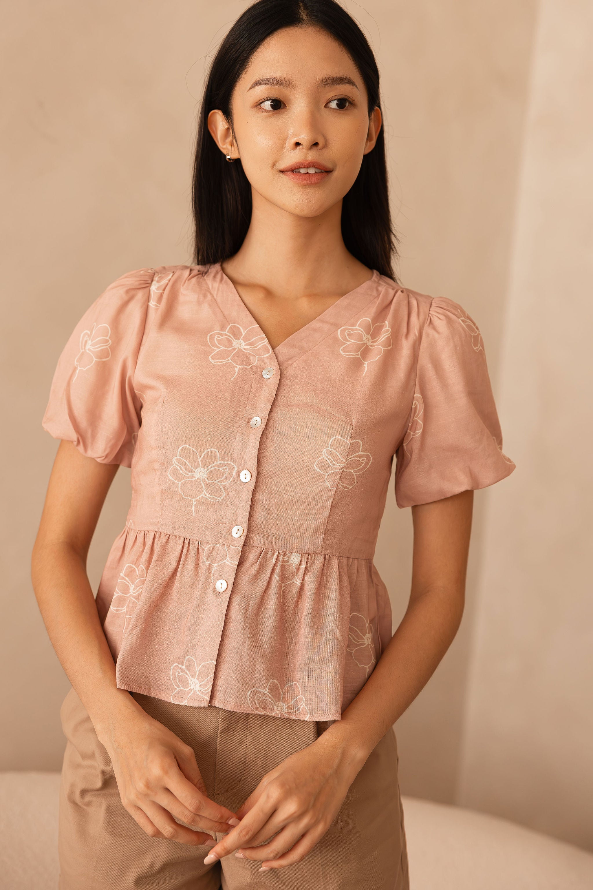Le Fleur Magnolia - Tencel Linen Peplum Top in Rosé Crème