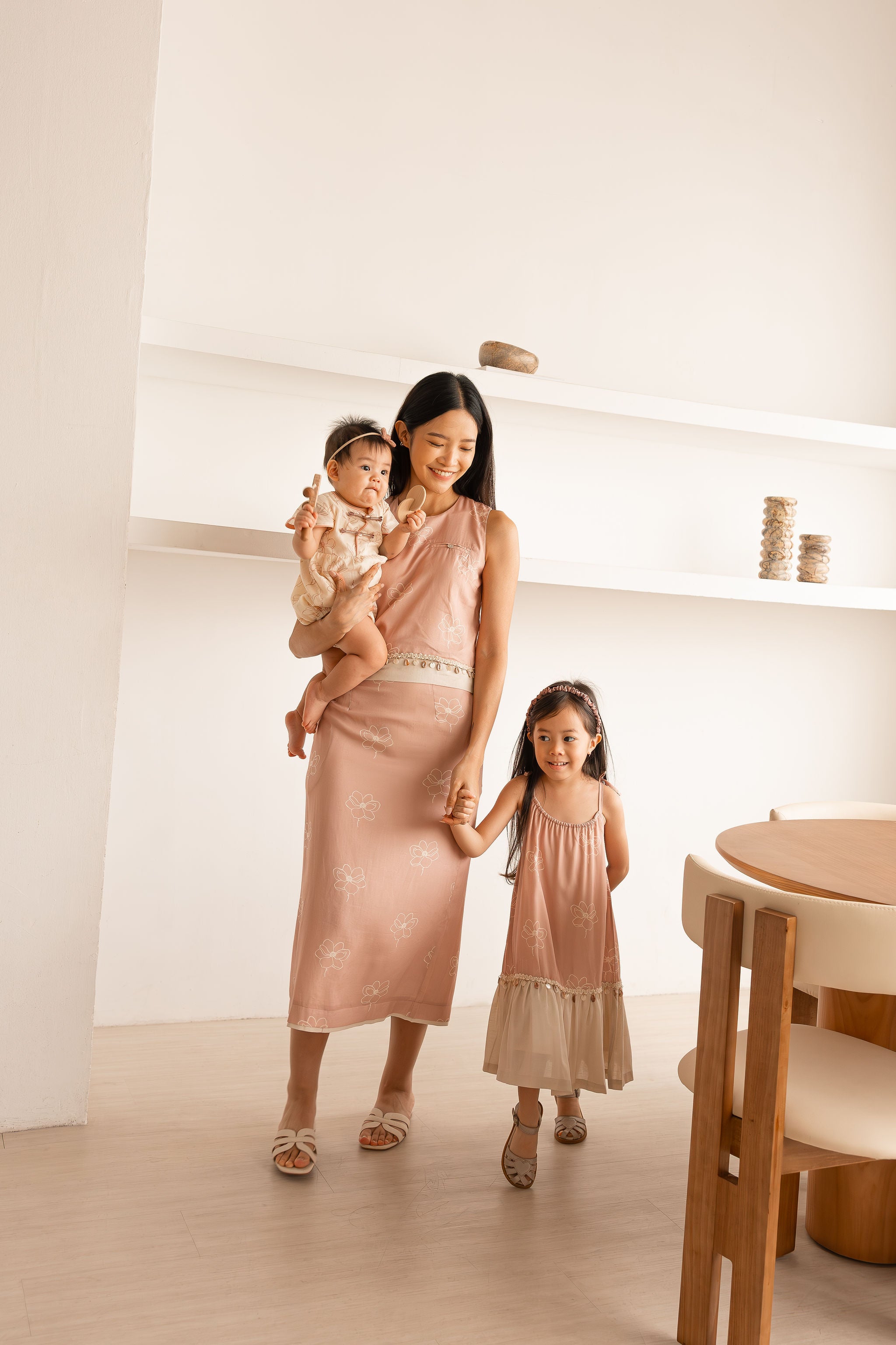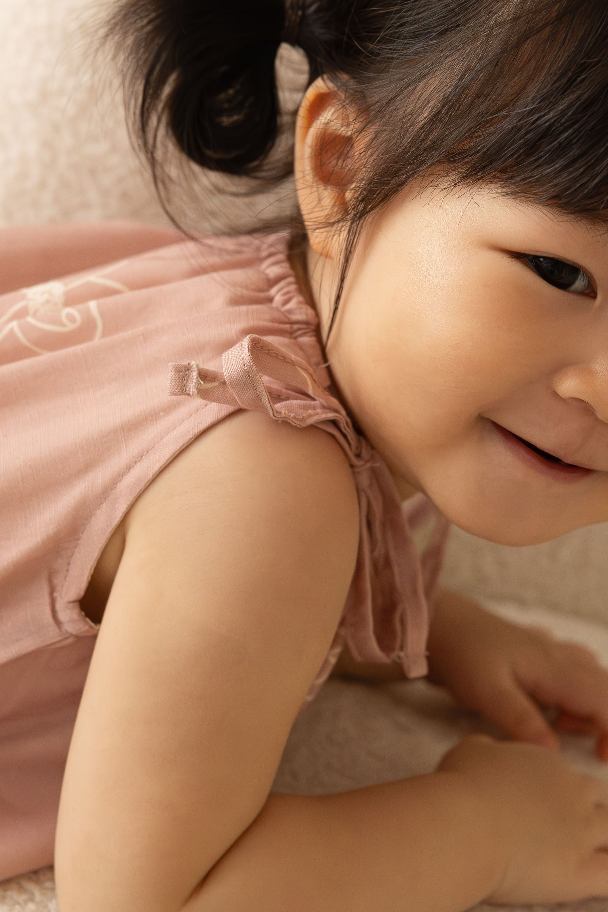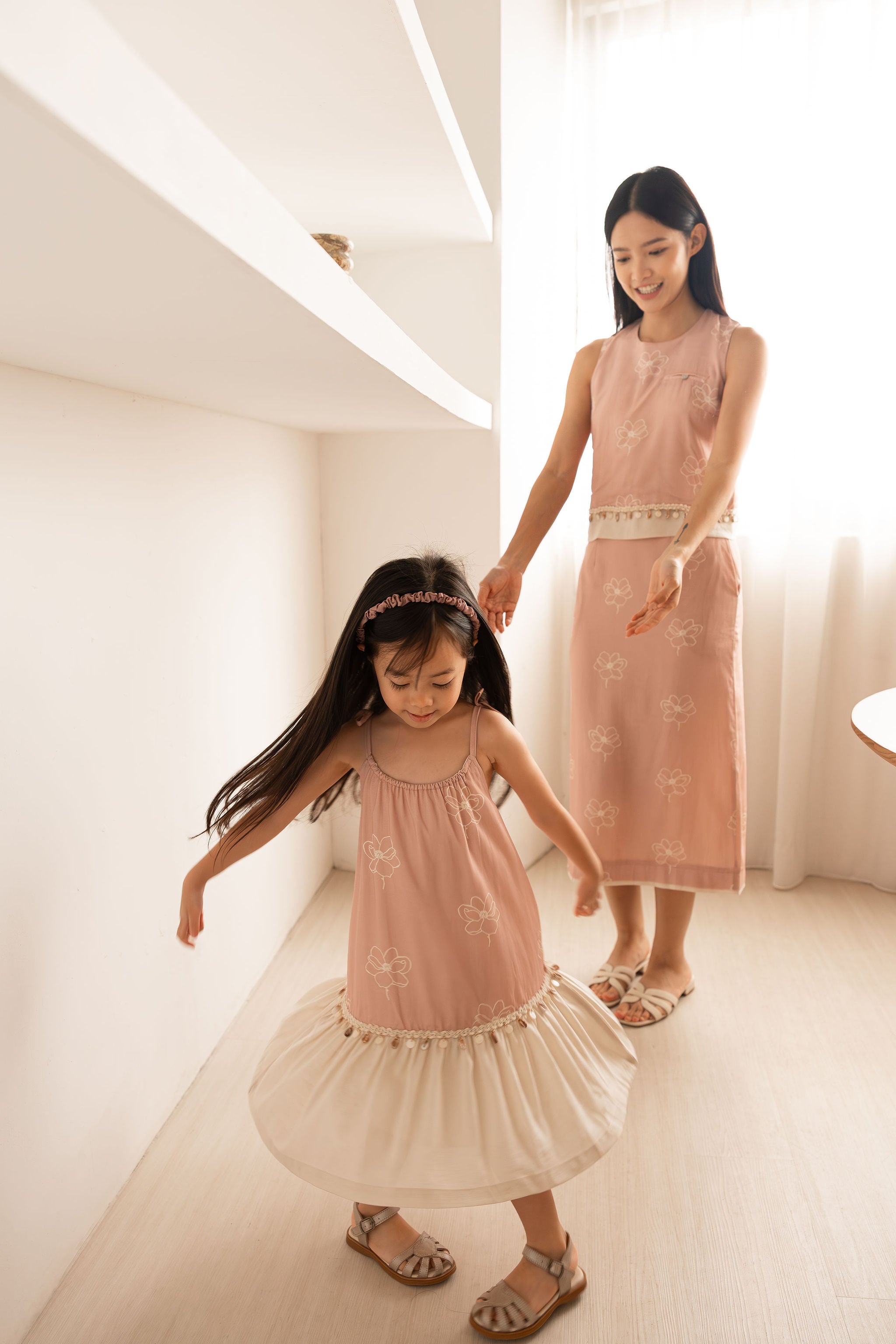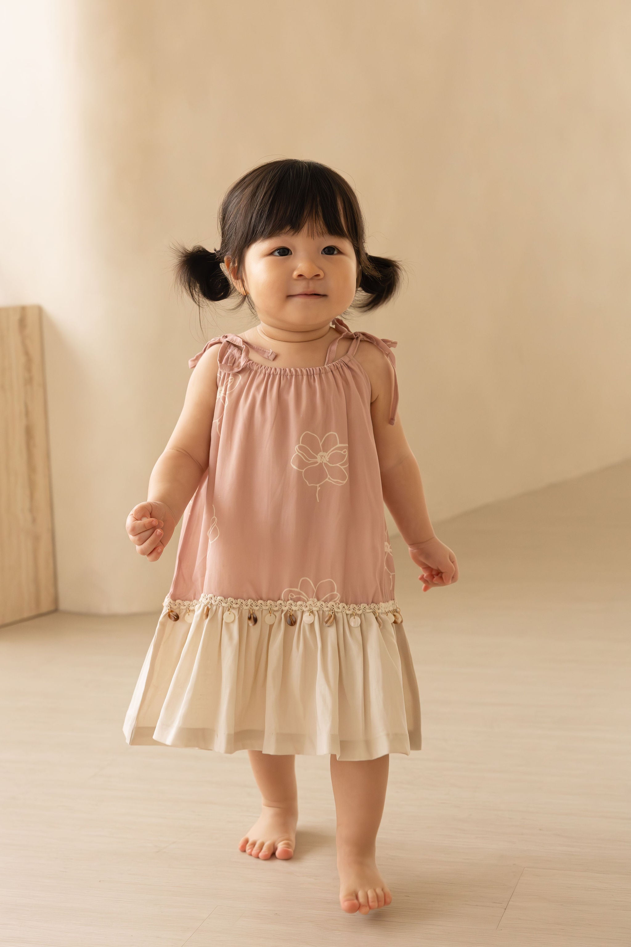 A sweet celebration of childhood charm — this ruffle dress in Rosé Crème is lovingly designed for festive moments and everyday play. Featuring our signature magnolia print on a lightweight Tencel Linen blend, it falls beautifully with a soft A-line sway. The contrast ruffle hem is hand-finished with real seashell trims, adding movement and gentle chimes as she walks — a tiny detail meant to be noticed.