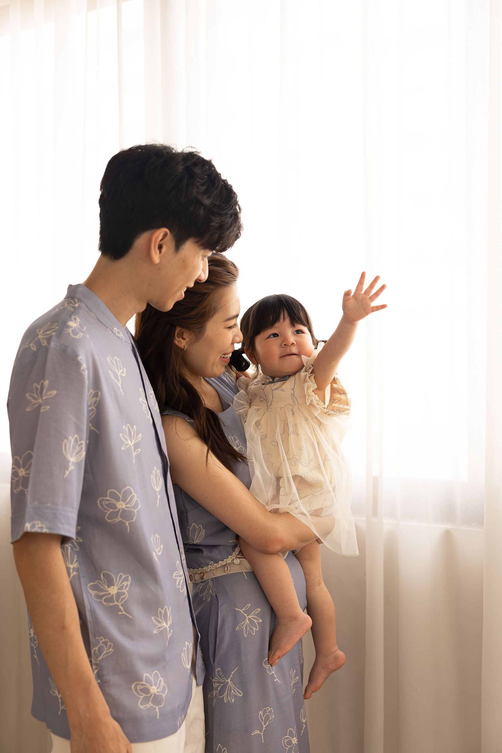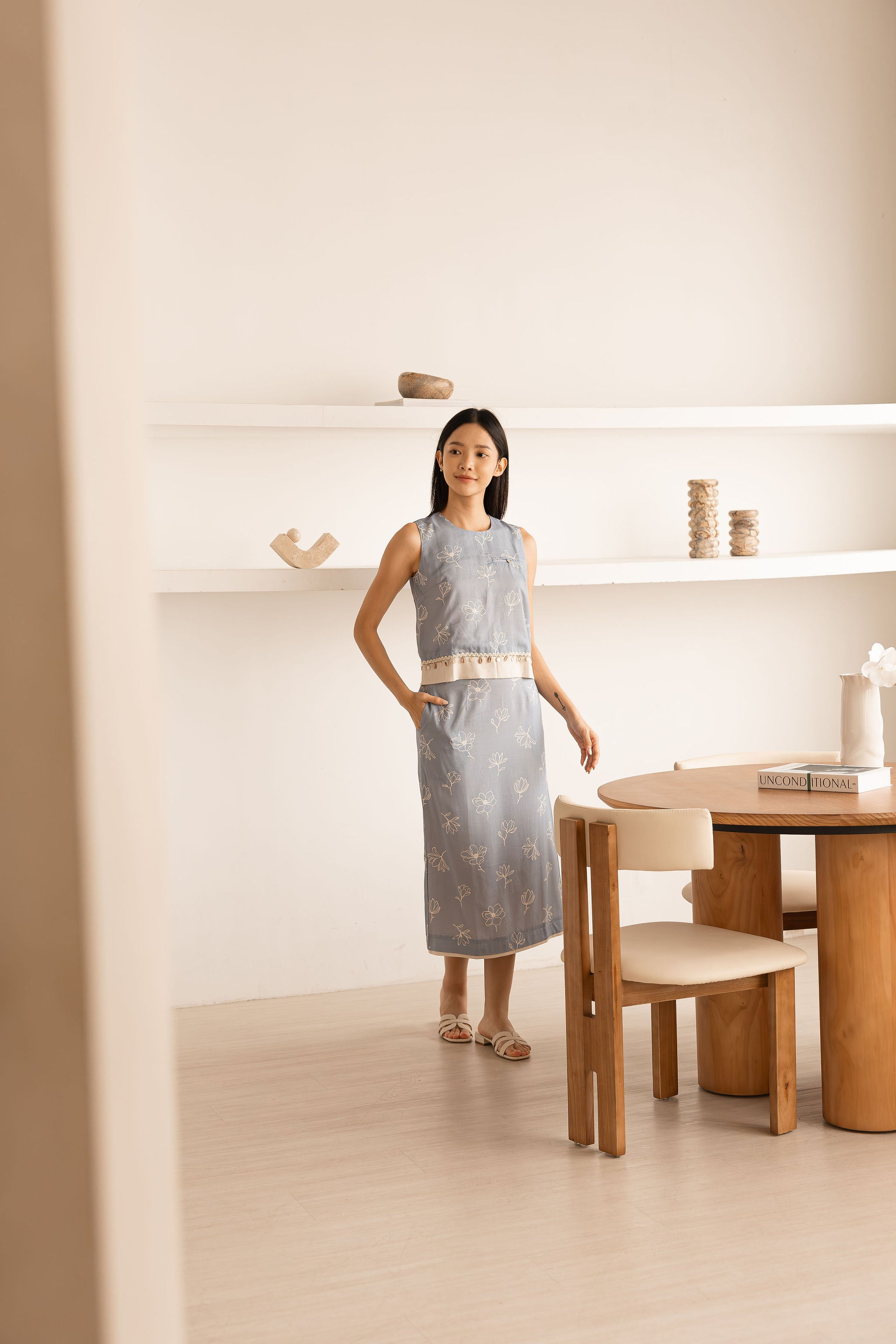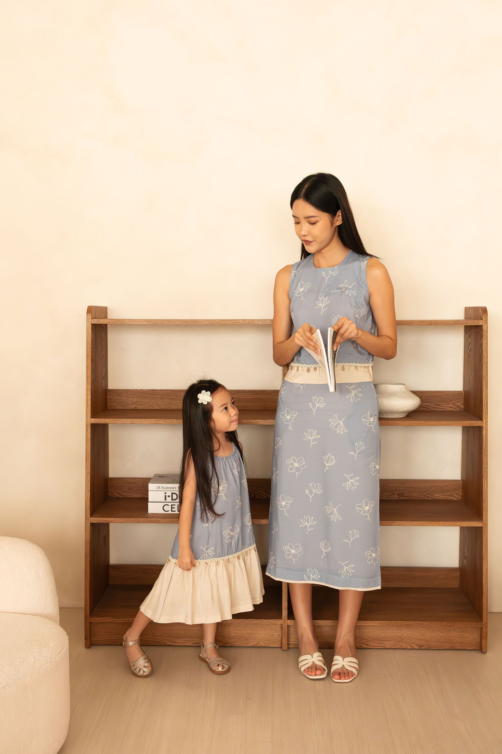 Where versatility meets timeless femininity — the Magnolia Two-Piece in Bleu Crème features a sleeveless top paired with a flowy midi skirt, detailed with ruffle trims and delicate floral linework. Wear together for an elevated look or mix & match for everyday style. Crafted from cooling Tencel–Linen, suitable for humid weather and long festive days. A match-ready look for CNY 2026, gatherings and multi-gen portraits.