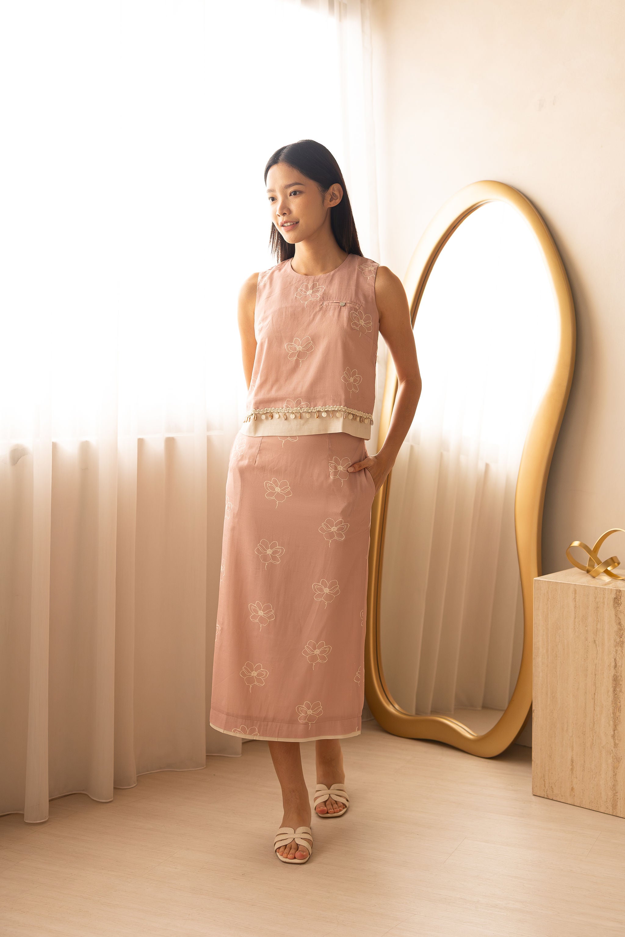 Crafted from a premium Tencel-Linen blend, this co-ord features a sleeveless top detailed with embroidery florals and finished with back buttons for a refined touch. Inspired by shoreline whispers, finished with seashell trims that sway in quiet elegance — a subtle highlight that sets this piece apart.