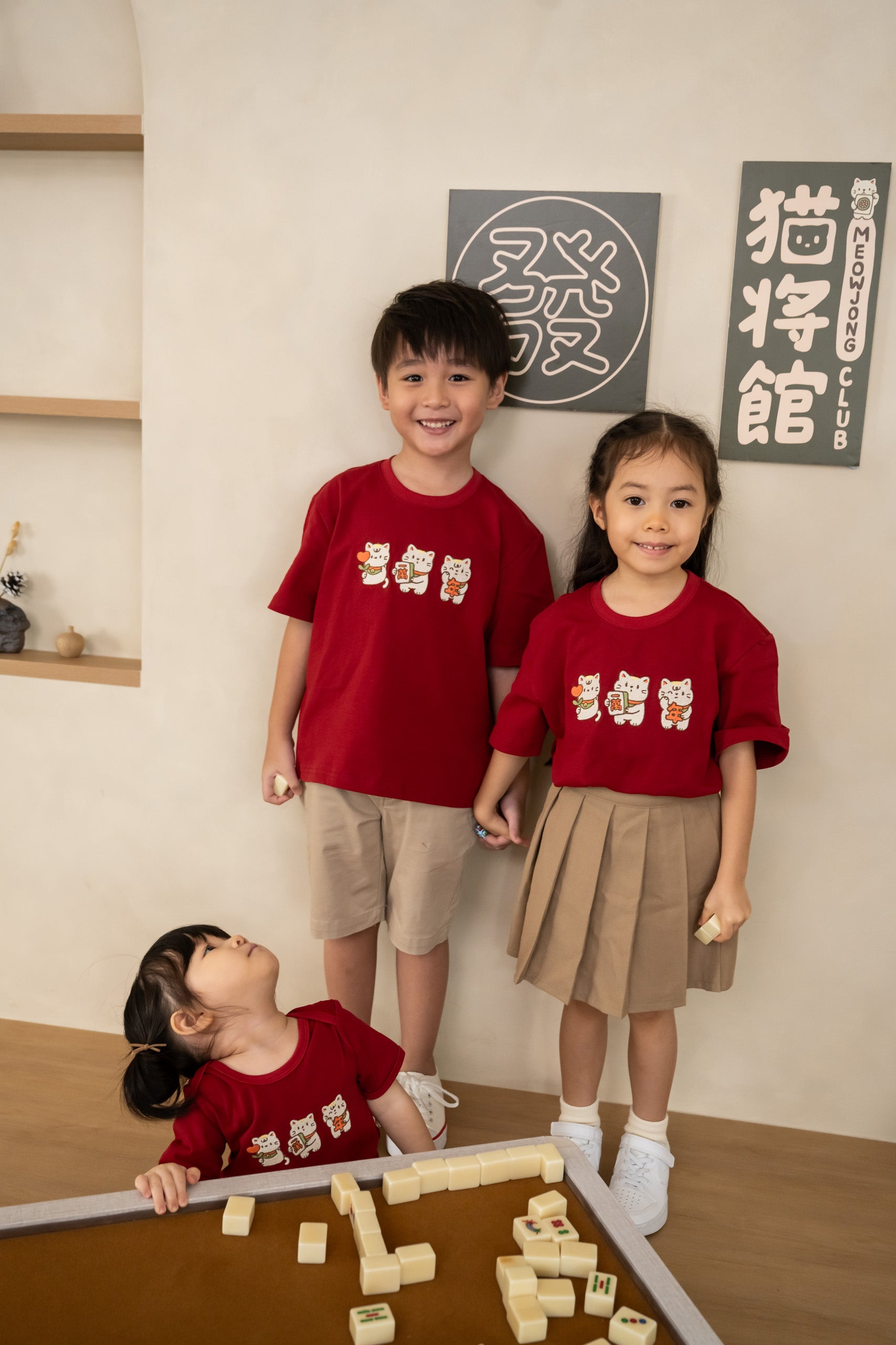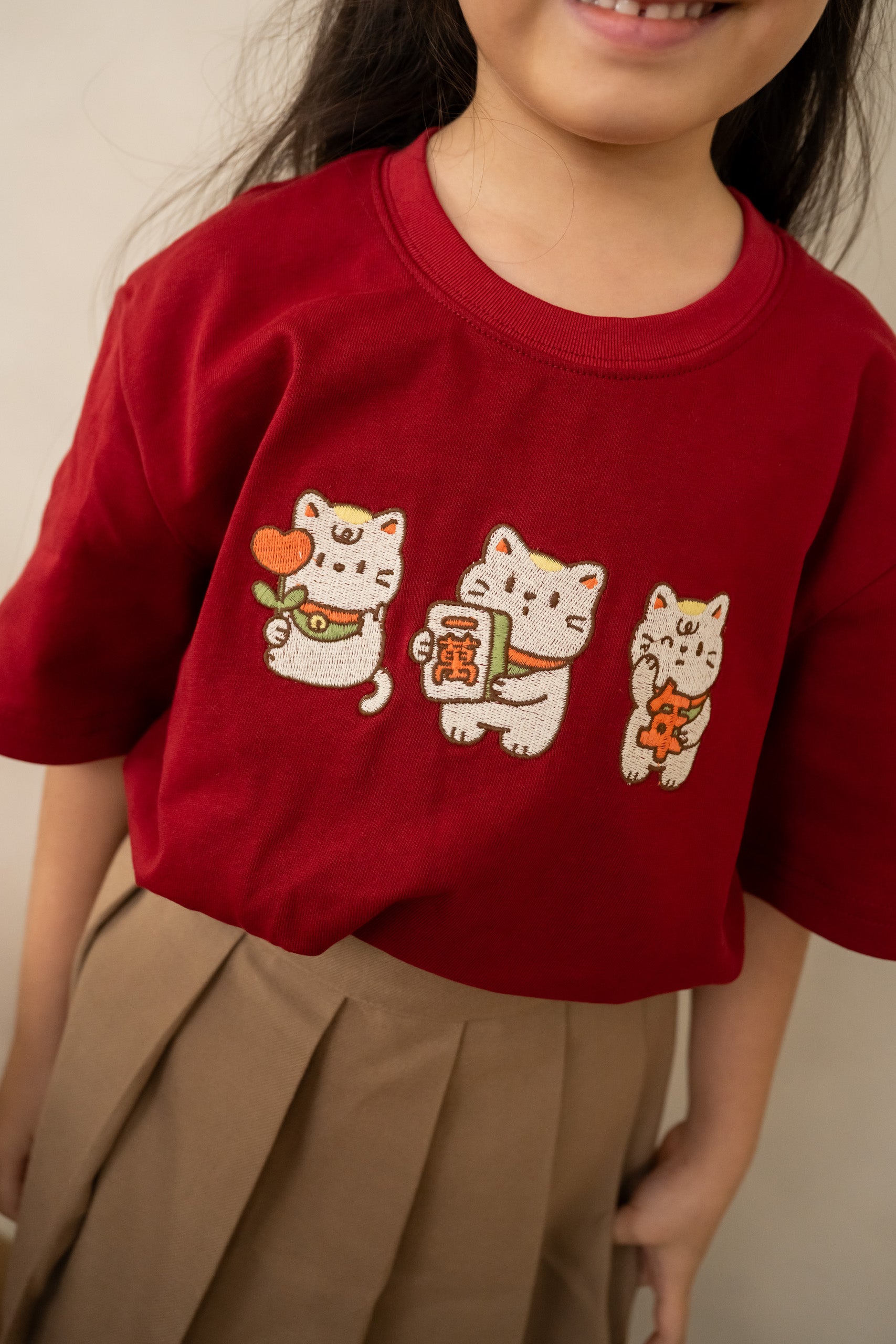 Meowjong Club - Love you 10000 years Embroidered Kid Tee in RED
