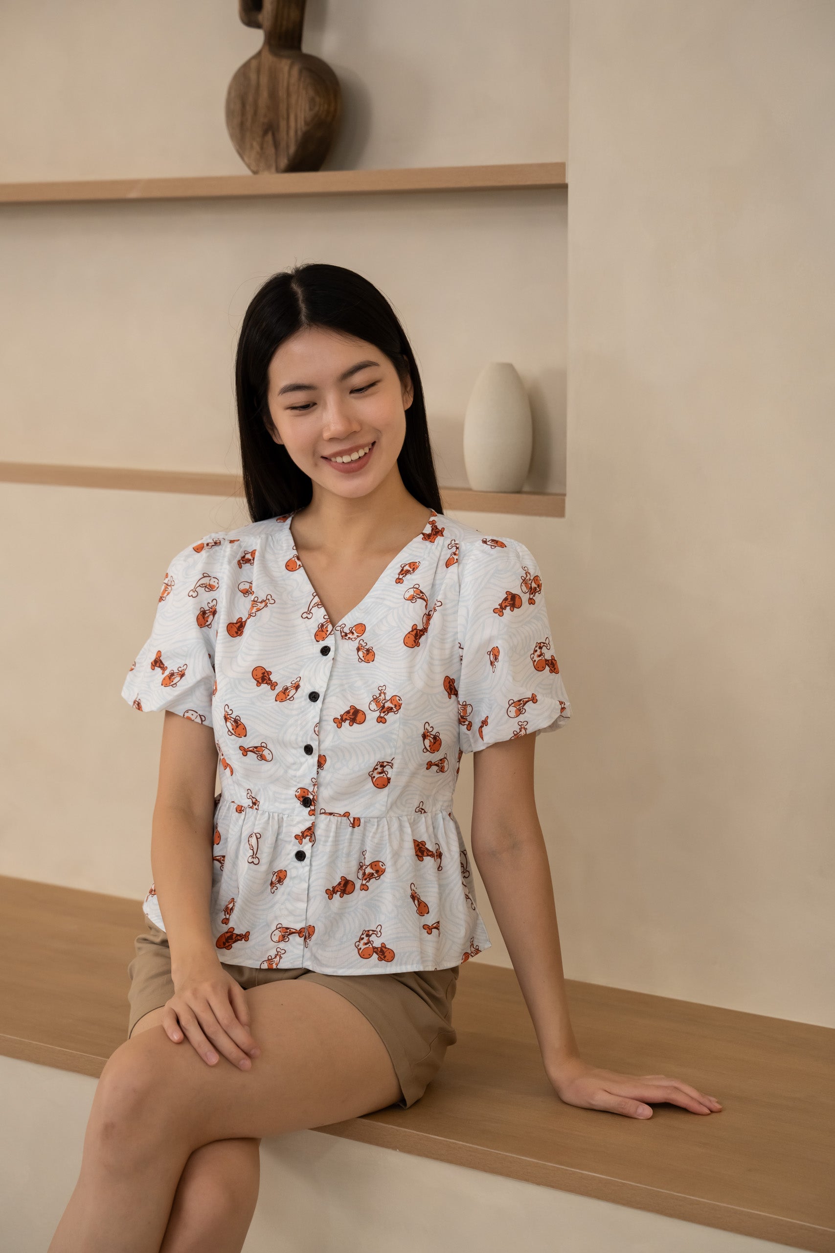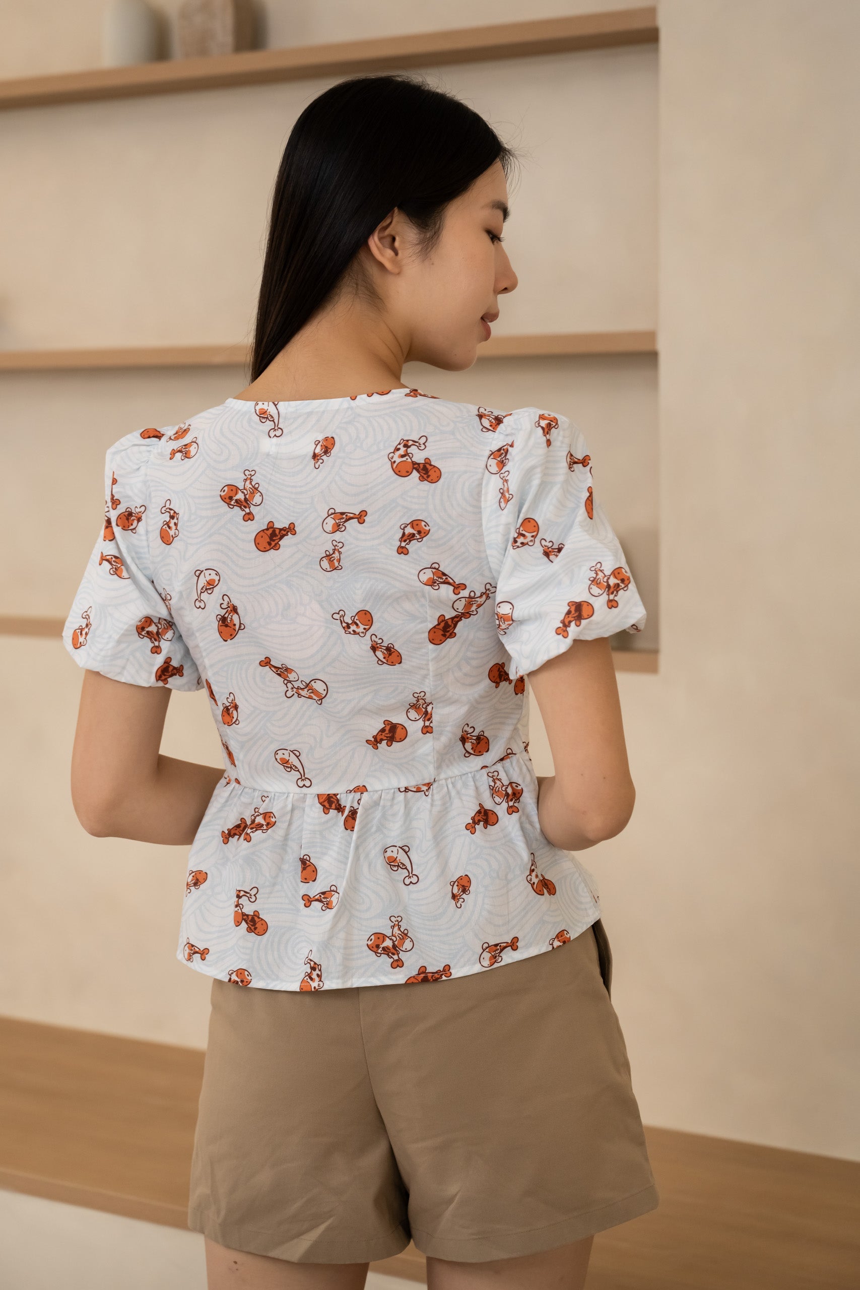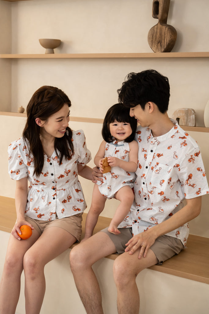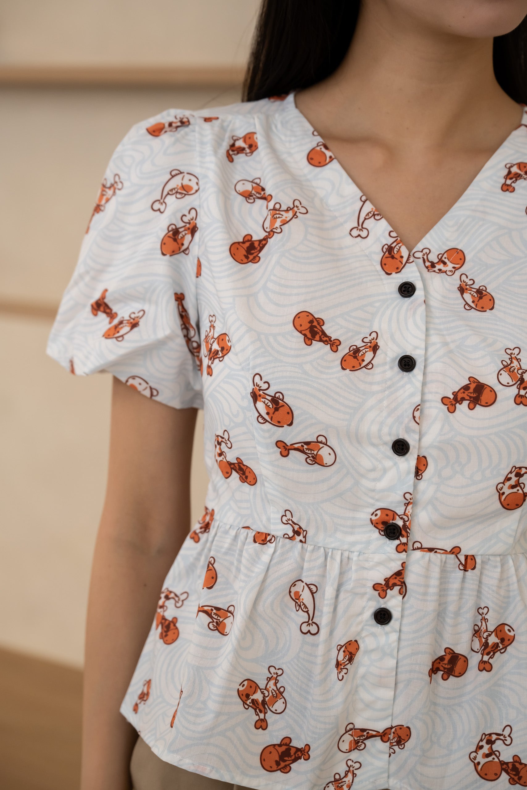 A feminine top for both CNY visits and daily wear. Designed with a V-neckline, structured peplum waist, functional buttons (nursing friendly), and airy puff sleeves. Crafted in our exclusive Koi Serenade print on 100% cotton.
