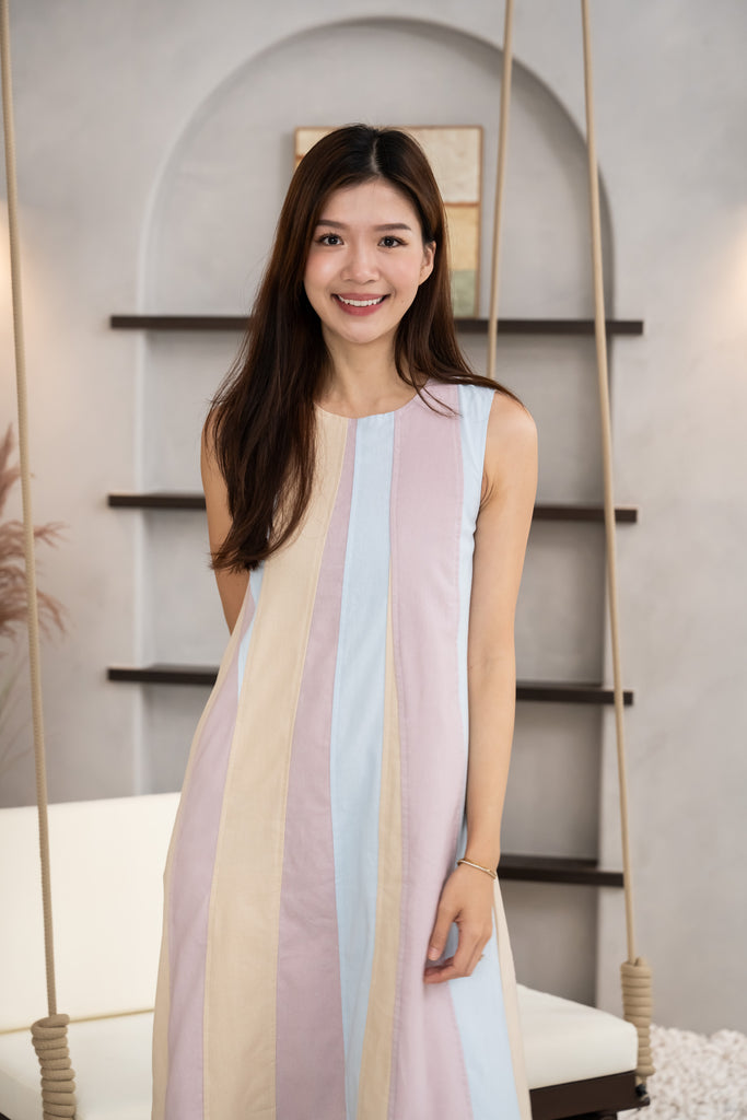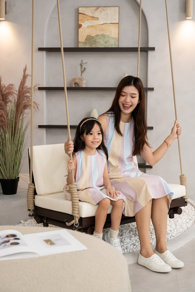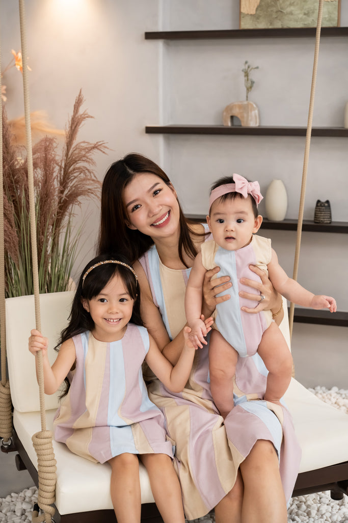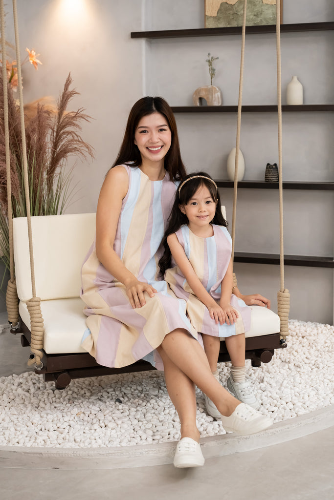 A timeless pastel dream in linen. This sleeveless midi dress is crafted from soft linen panels in blush, sand, and sky tones — each delicately sewn to create a graceful, elongated silhouette. Lightweight, flowy, and effortlessly elegant, it’s perfect for matching moments with your little one or for everyday comfort with a touch of charm.