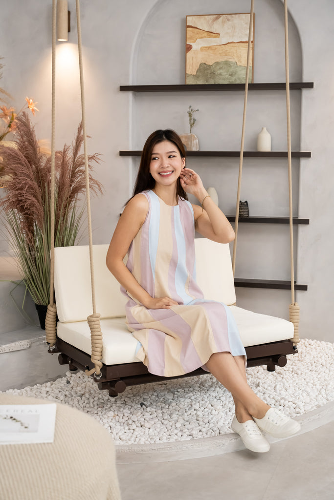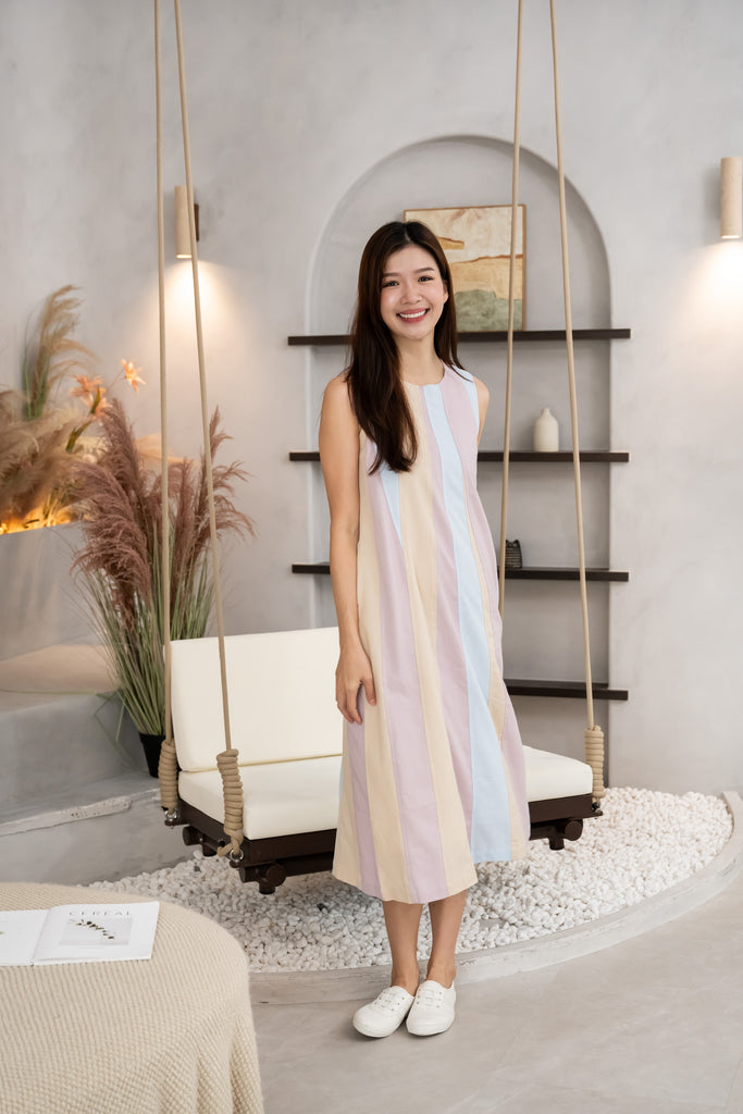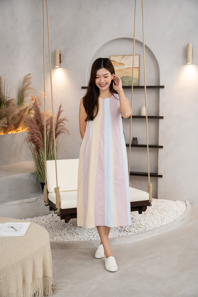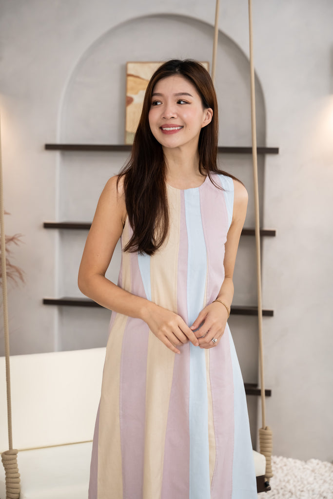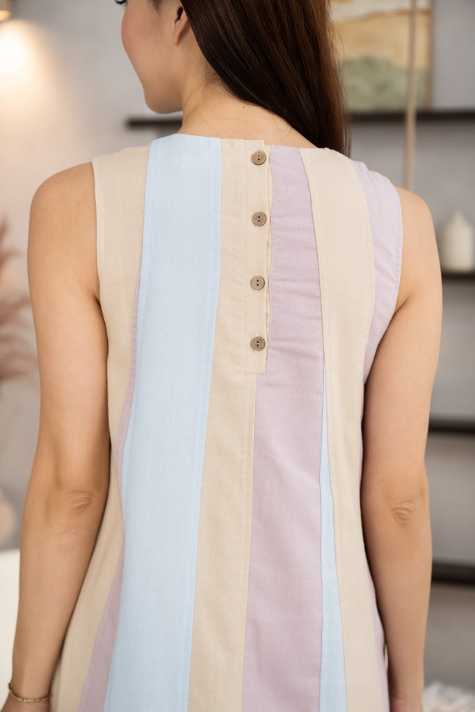A timeless pastel dream in linen. This sleeveless midi dress is crafted from soft linen panels in blush, sand, and sky tones — each delicately sewn to create a graceful, elongated silhouette. Lightweight, flowy, and effortlessly elegant, it’s perfect for matching moments with your little one or for everyday comfort with a touch of charm.