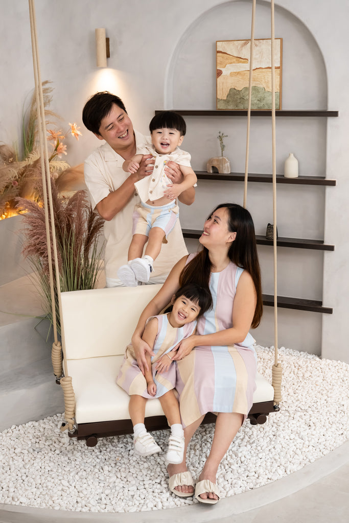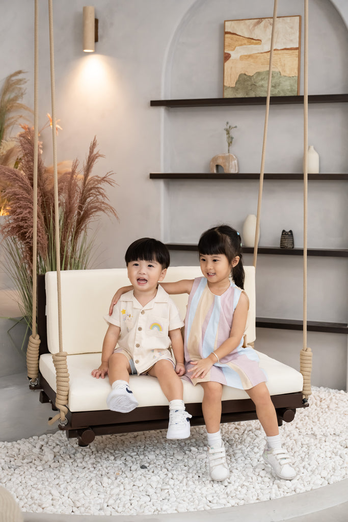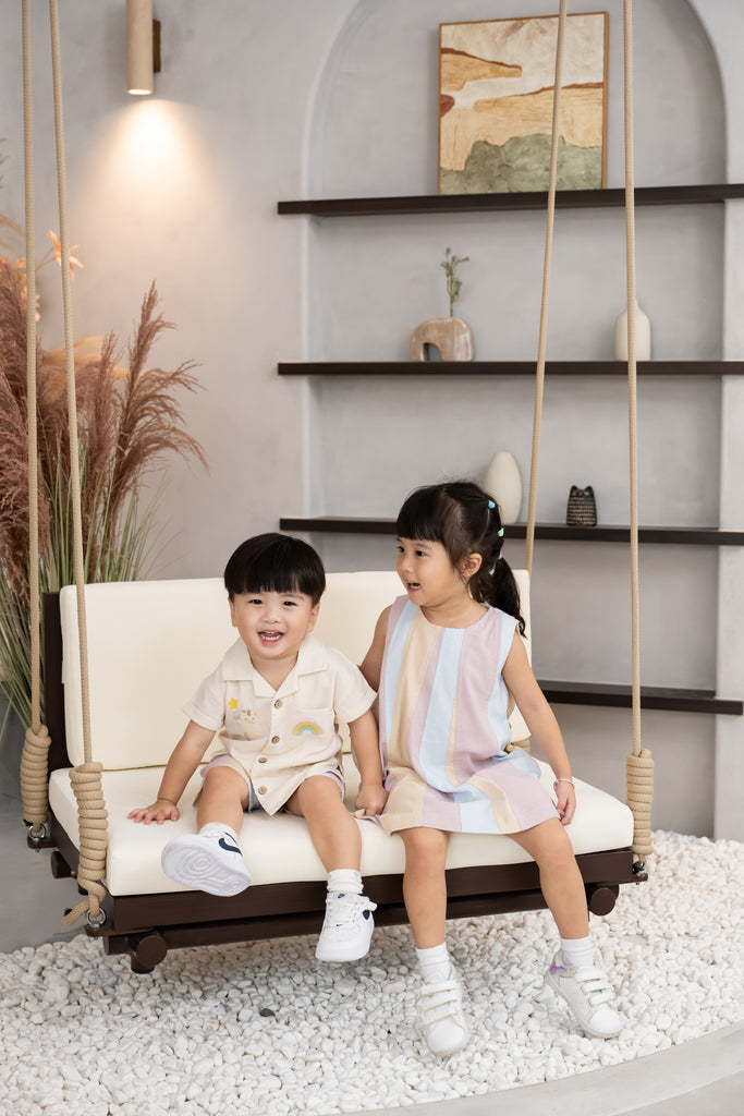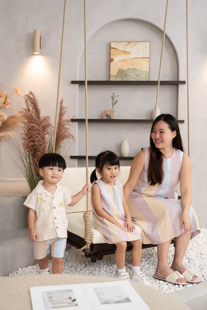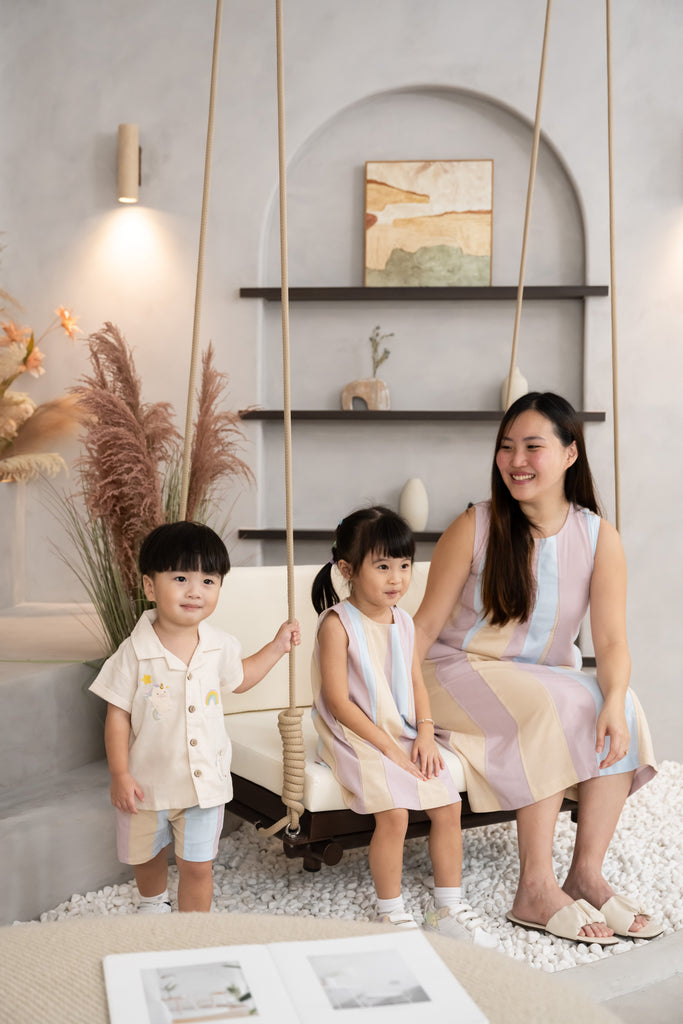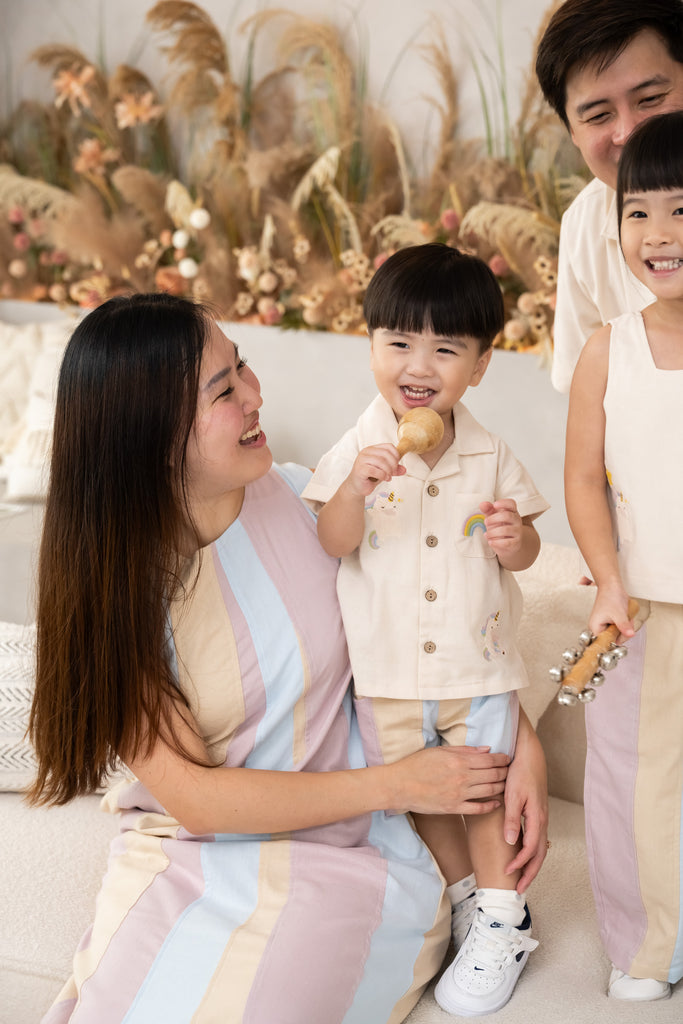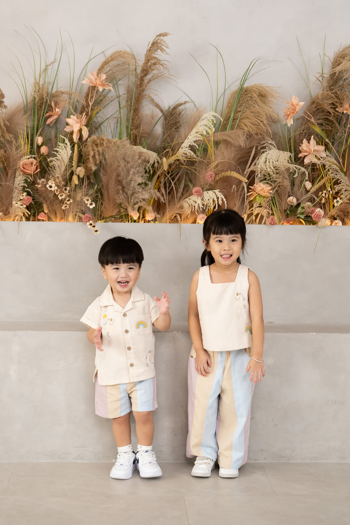 This adorable 2-piece set features a button-down linen shirt with whimsical unicorn and rainbow embroidery, paired with pastel-panelled shorts in blush, sand, and sky hues. Made from our new premium linen blend, it’s soft, breathable, and perfect for sunny playdates or matching family shoots.