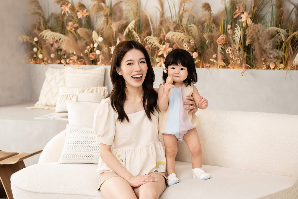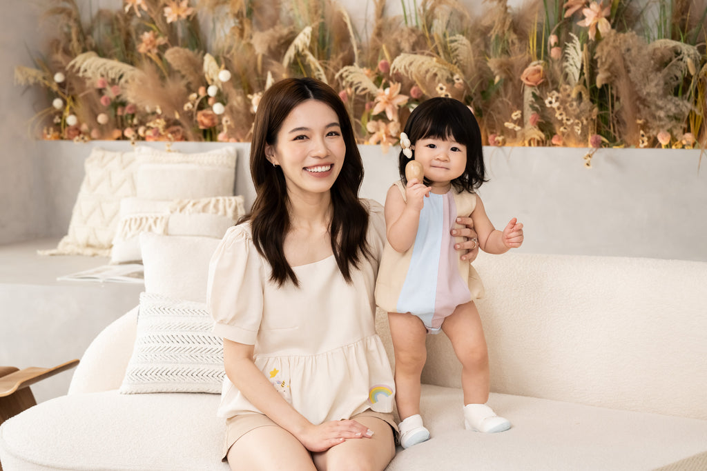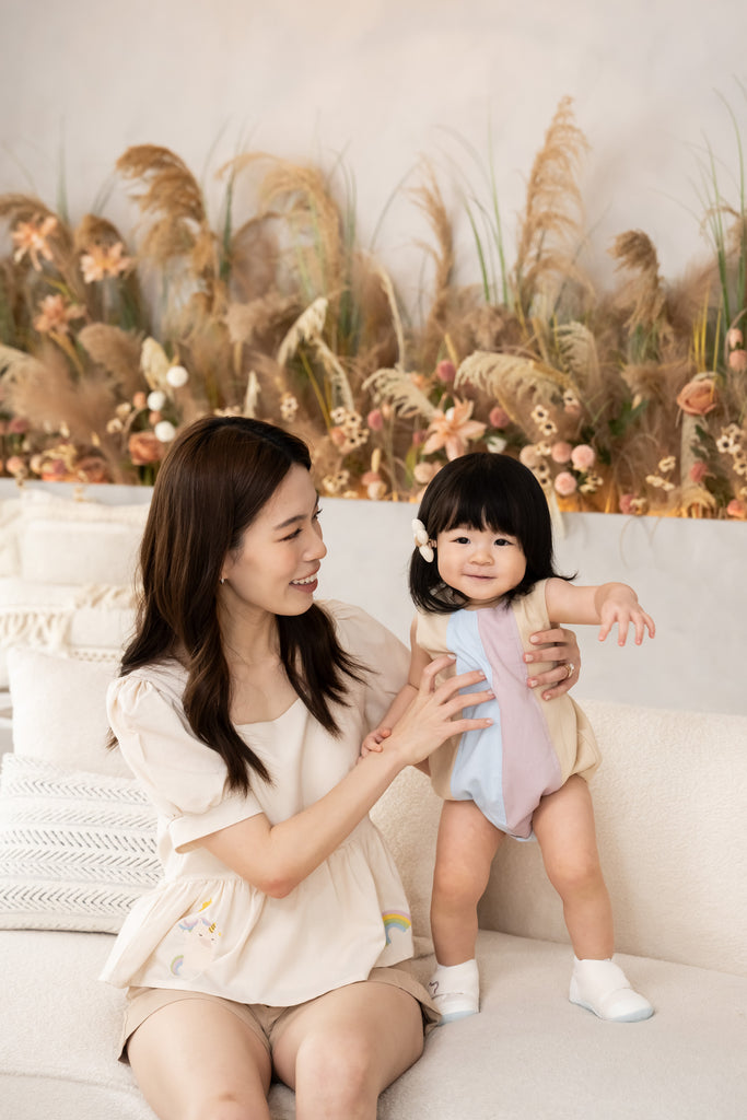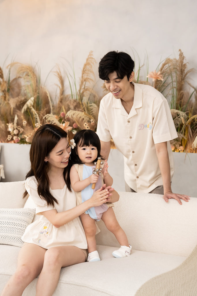 The peplum silhouette flatters effortlessly while adding a touch of feminine grace — perfect for family shoots, weekends, or cozy twinning days.