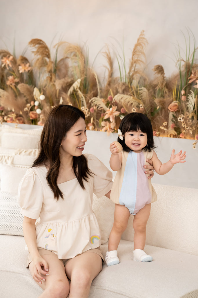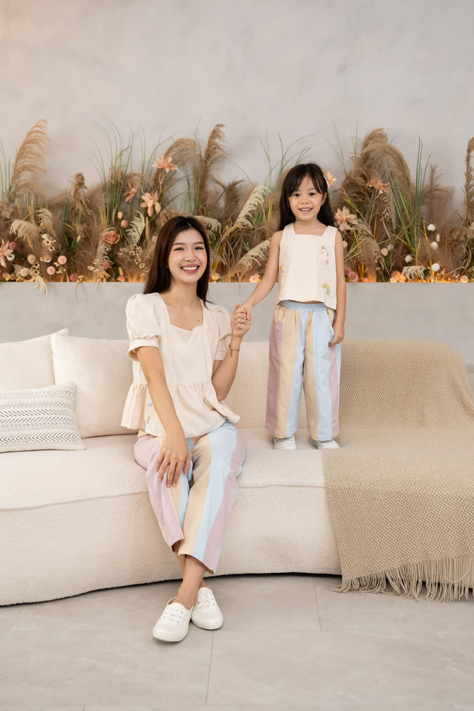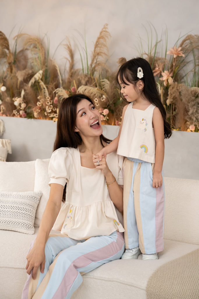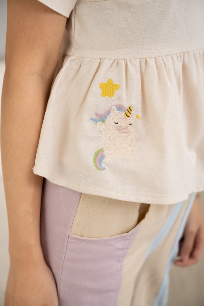 The Sweet Cuddleè Peplum Top features a dainty peplum top adorned with delicate unicorn and rainbow embroidery, paired with soft pastel panelled linen pants in blush, sand, and sky hues.