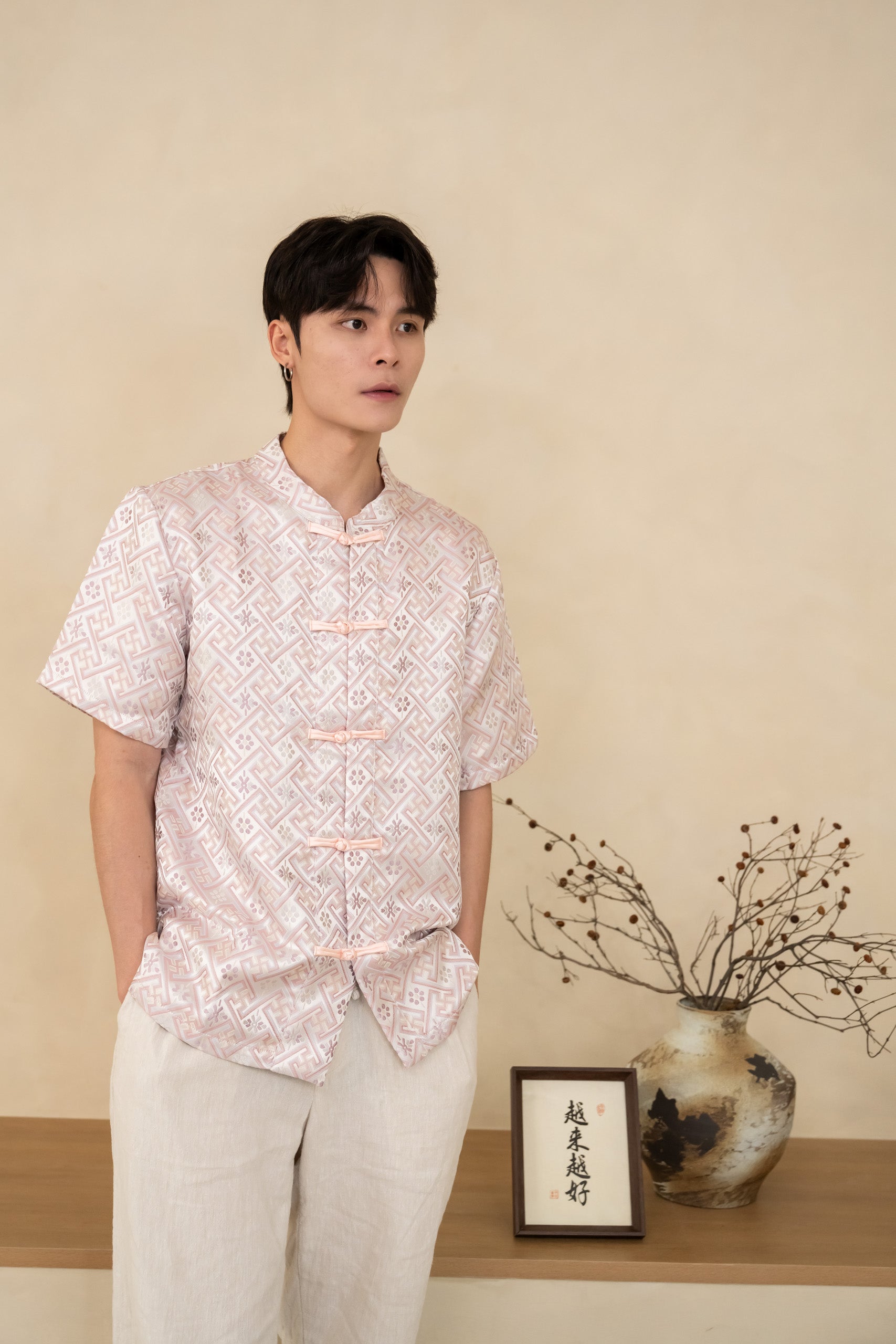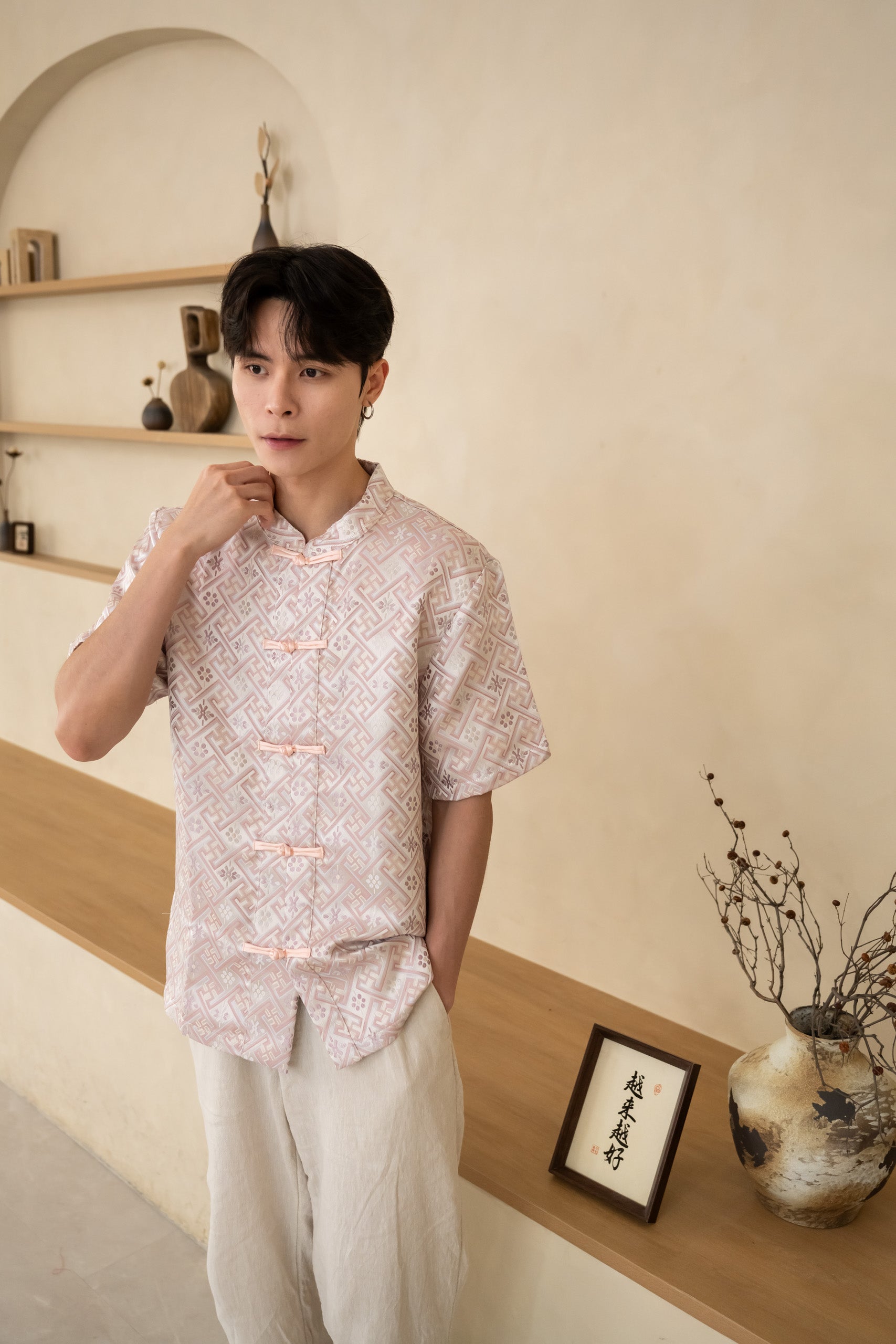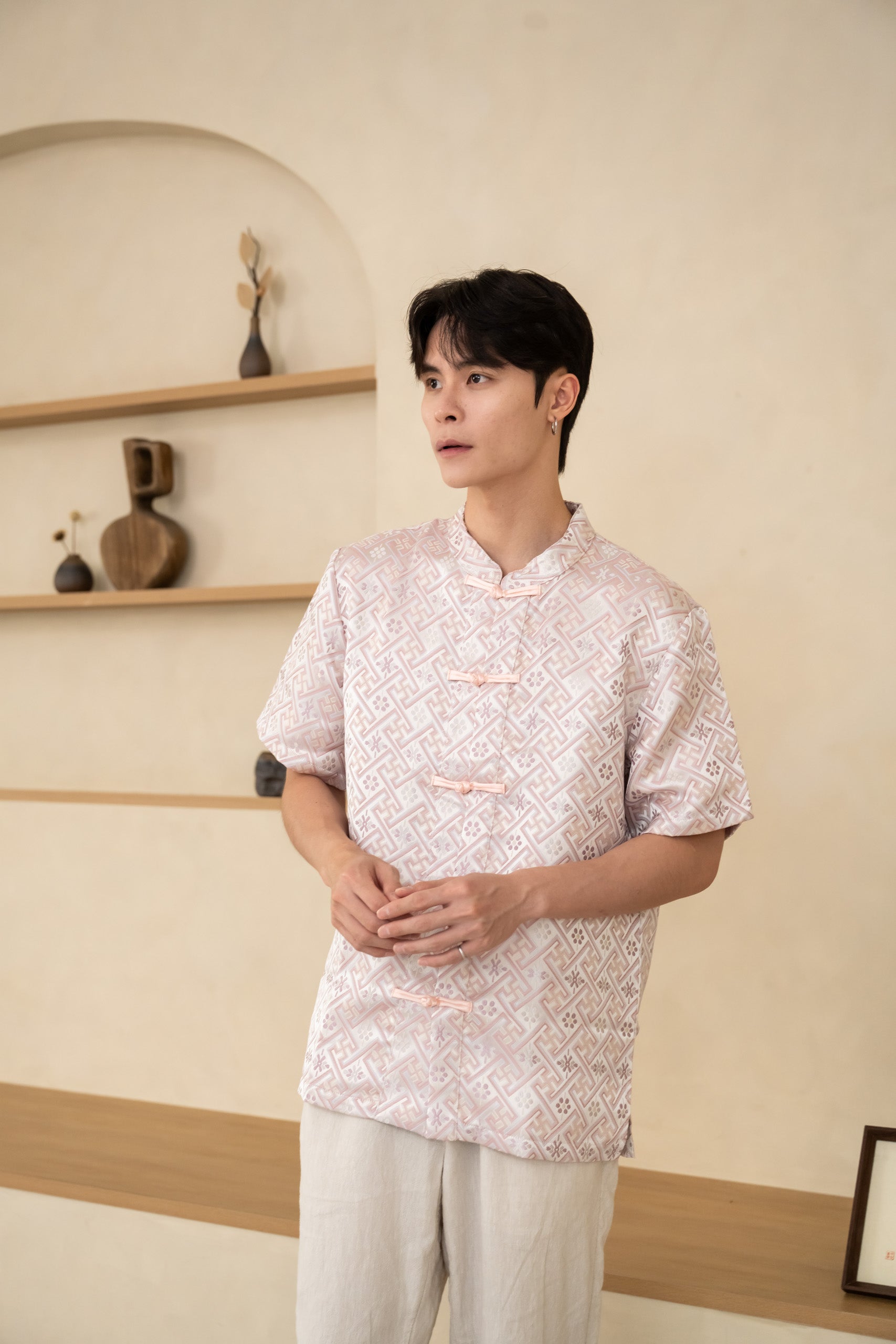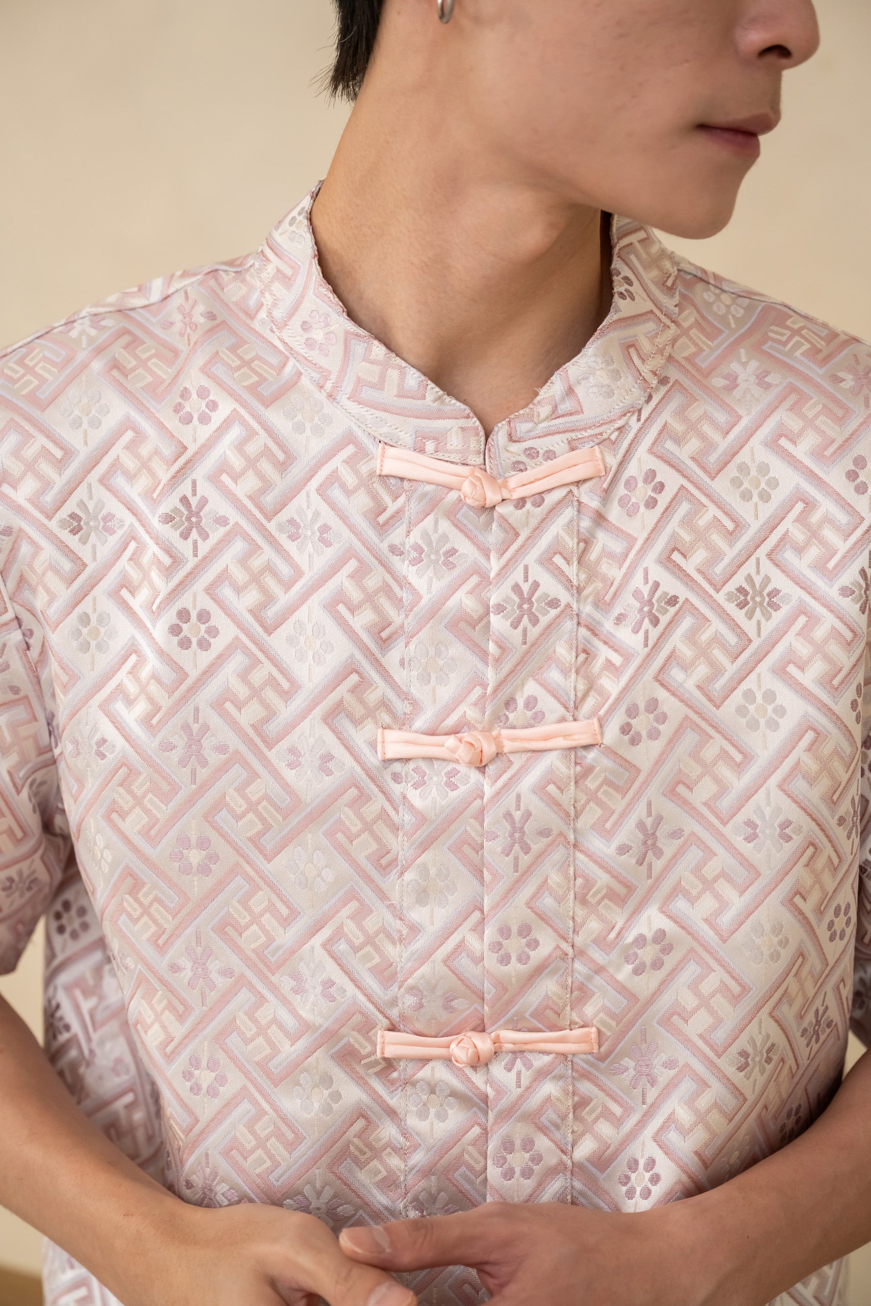 The Blush Men’s Cheongsam Shirt blends classic elements with a relaxed contemporary cut. Crafted in blush silk jacquard, it features a mandarin collar and traditional knot buttons while remaining lightweight and comfortable for all-day wear.