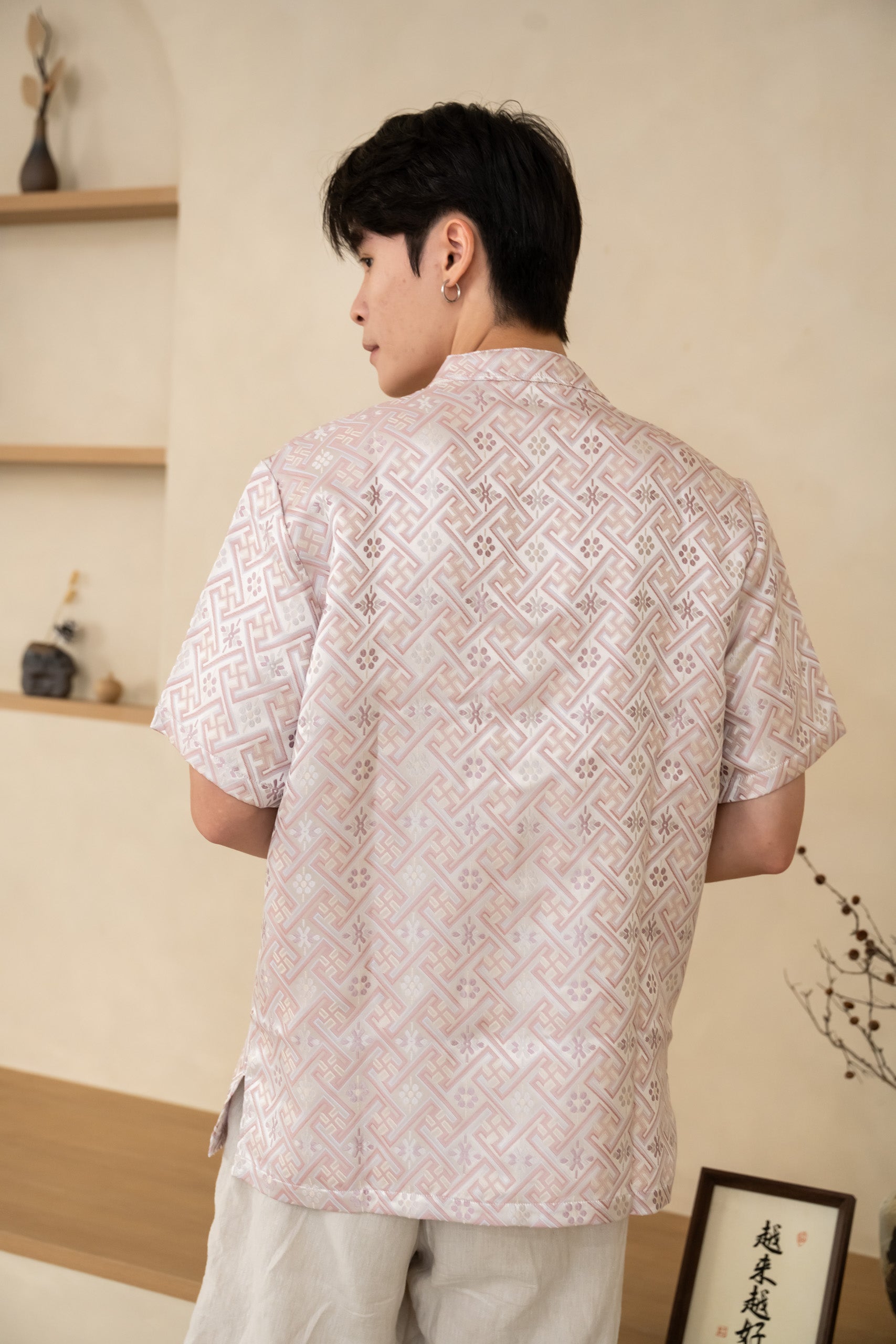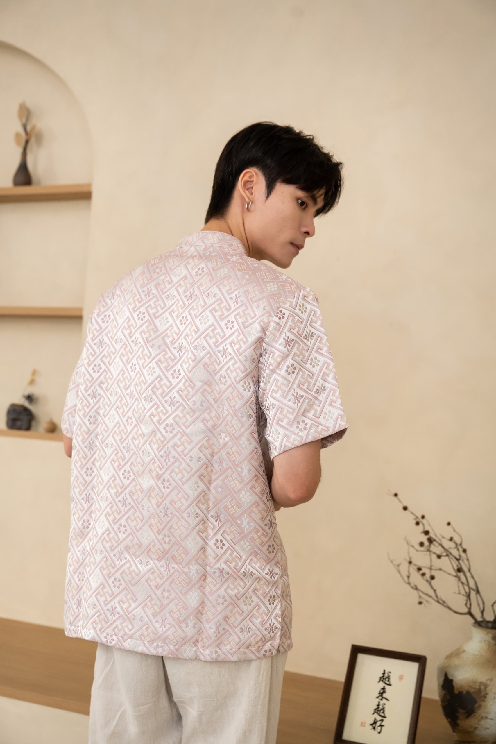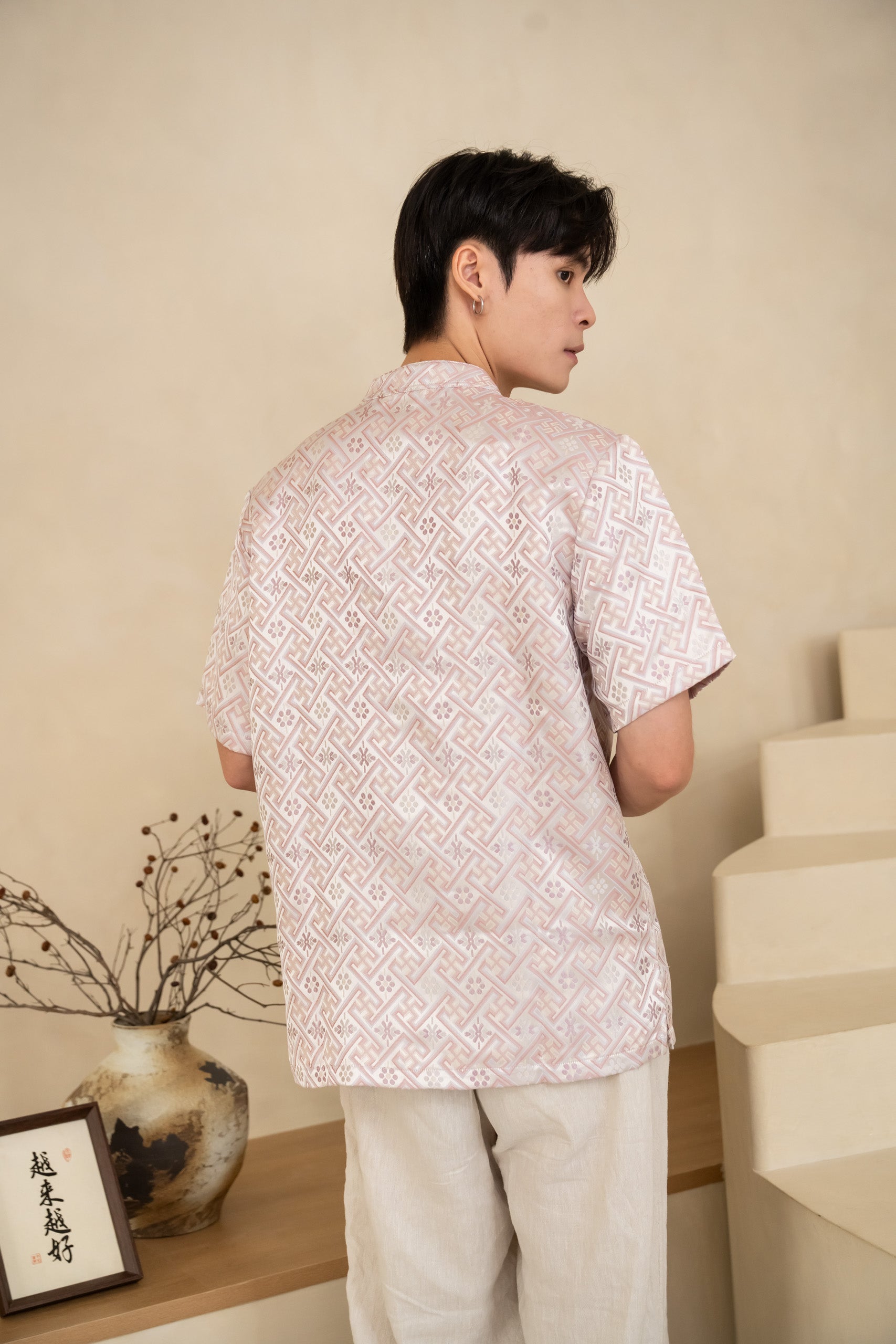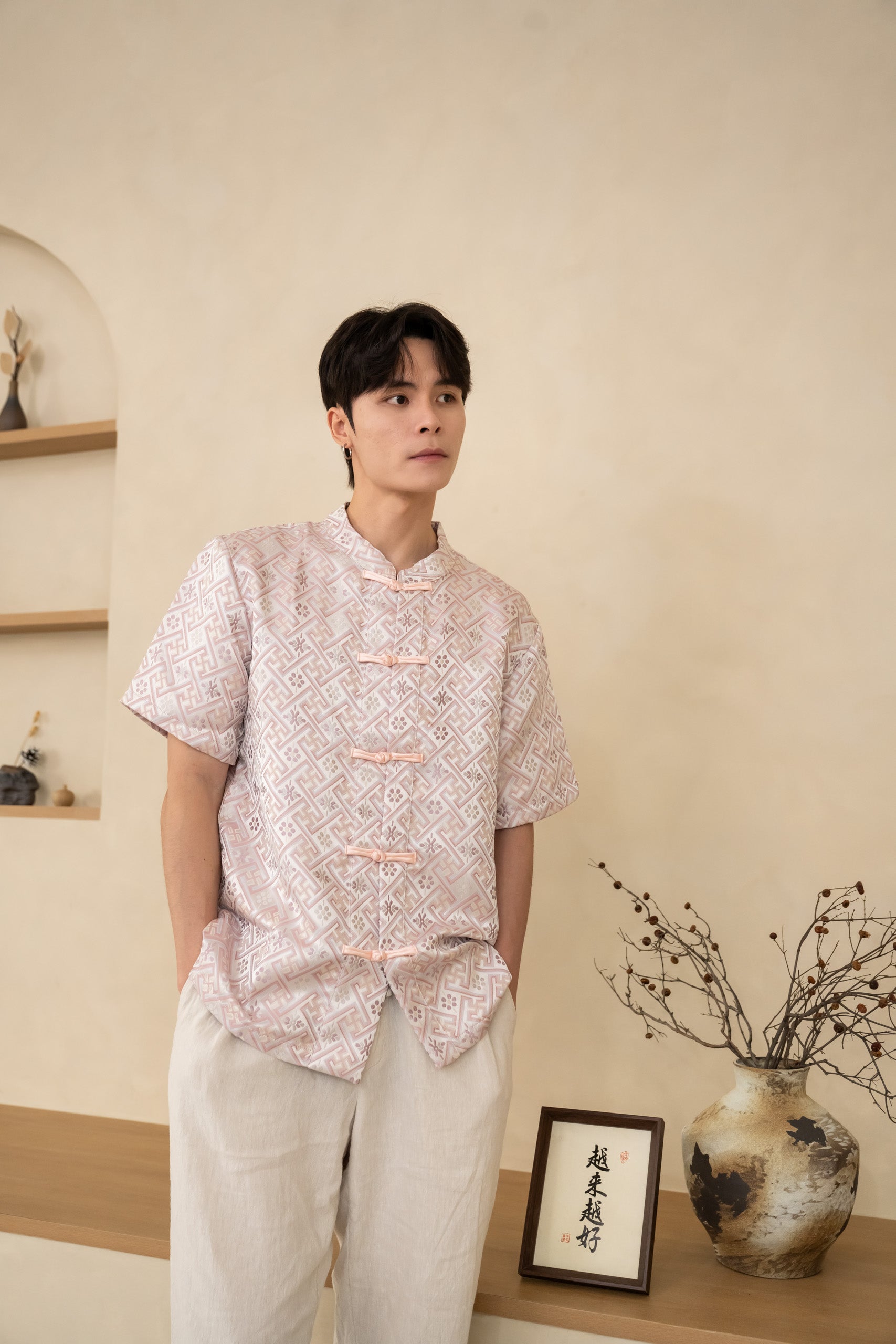 The Blush Men’s Cheongsam Shirt blends classic elements with a relaxed contemporary cut. Crafted in blush silk jacquard, it features a mandarin collar and traditional knot buttons while remaining lightweight and comfortable for all-day wear.