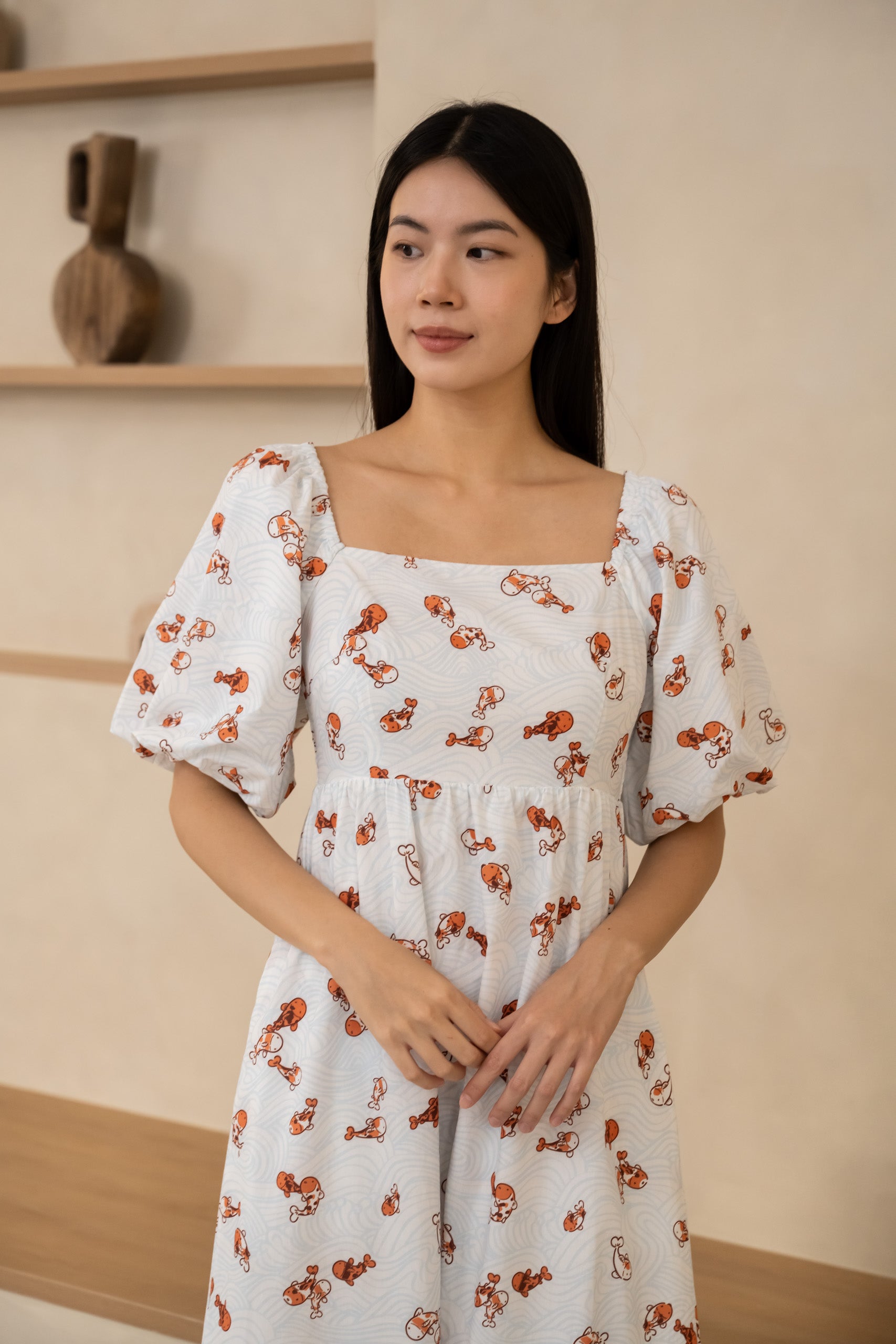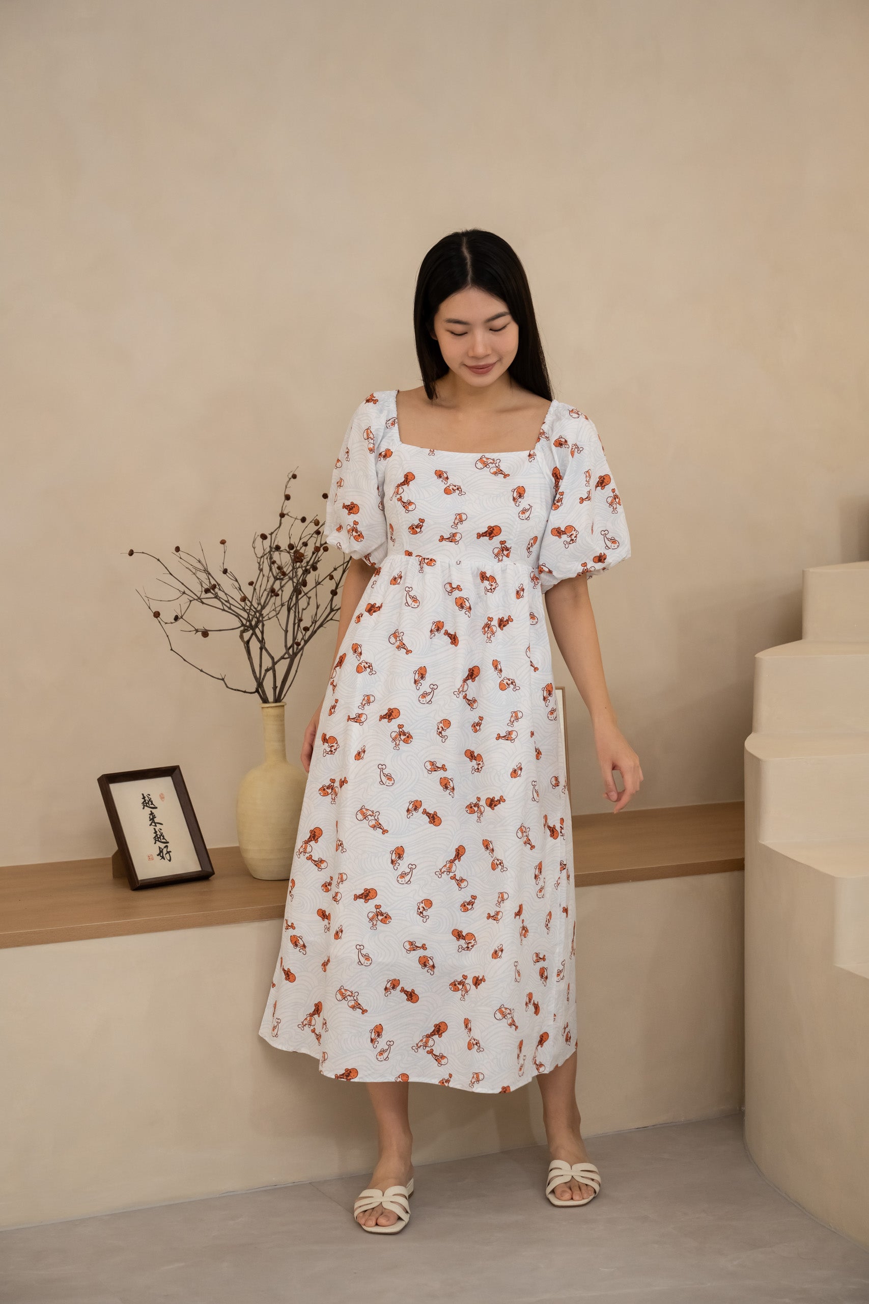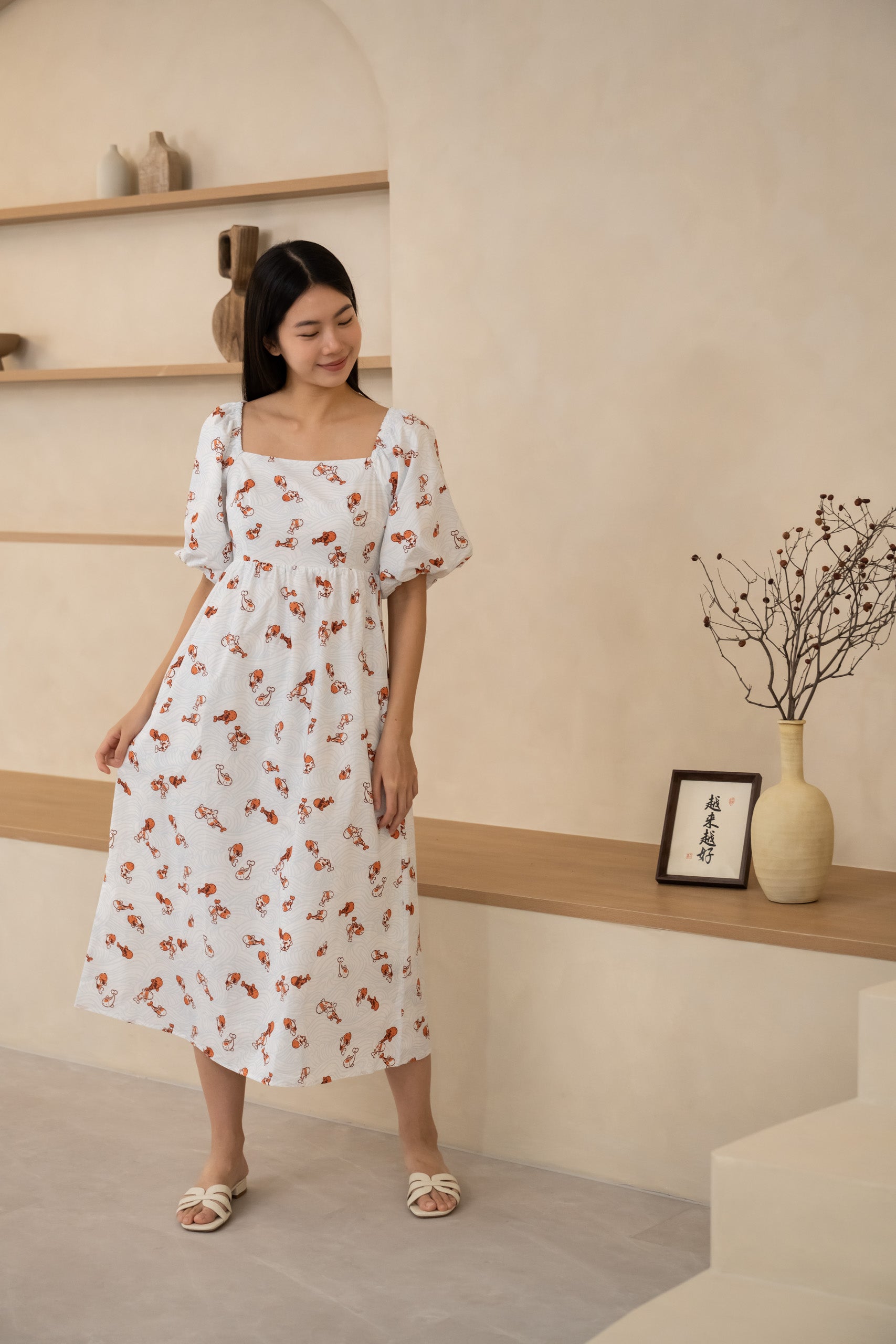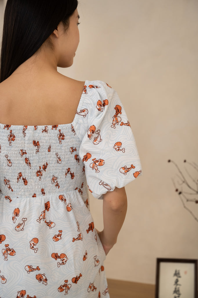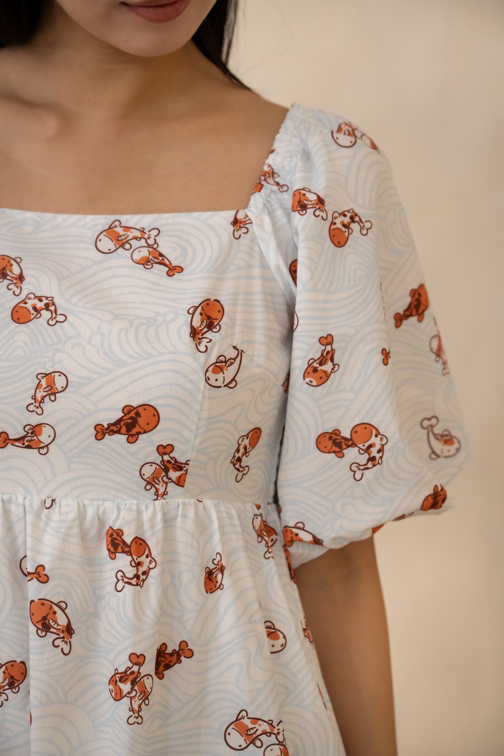 A feminine silhouette designed for modern celebrations. Features a square neckline, soft puff sleeves, smocked back for comfort, and our exclusive Koi Serenade print inspired by Japanese koi and flowing waves. Made with crisp 100% cotton that softens beautifully after wash.