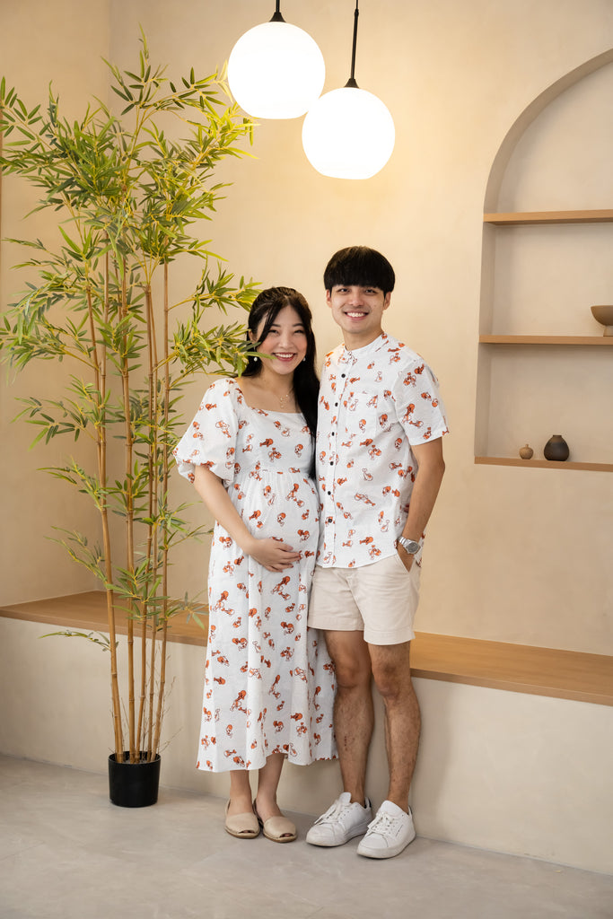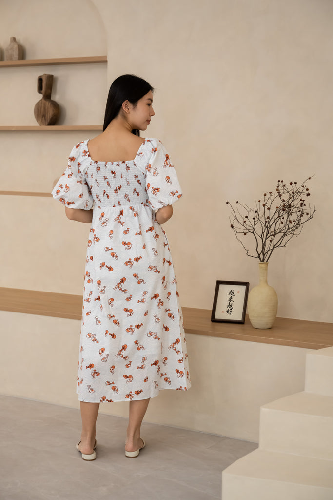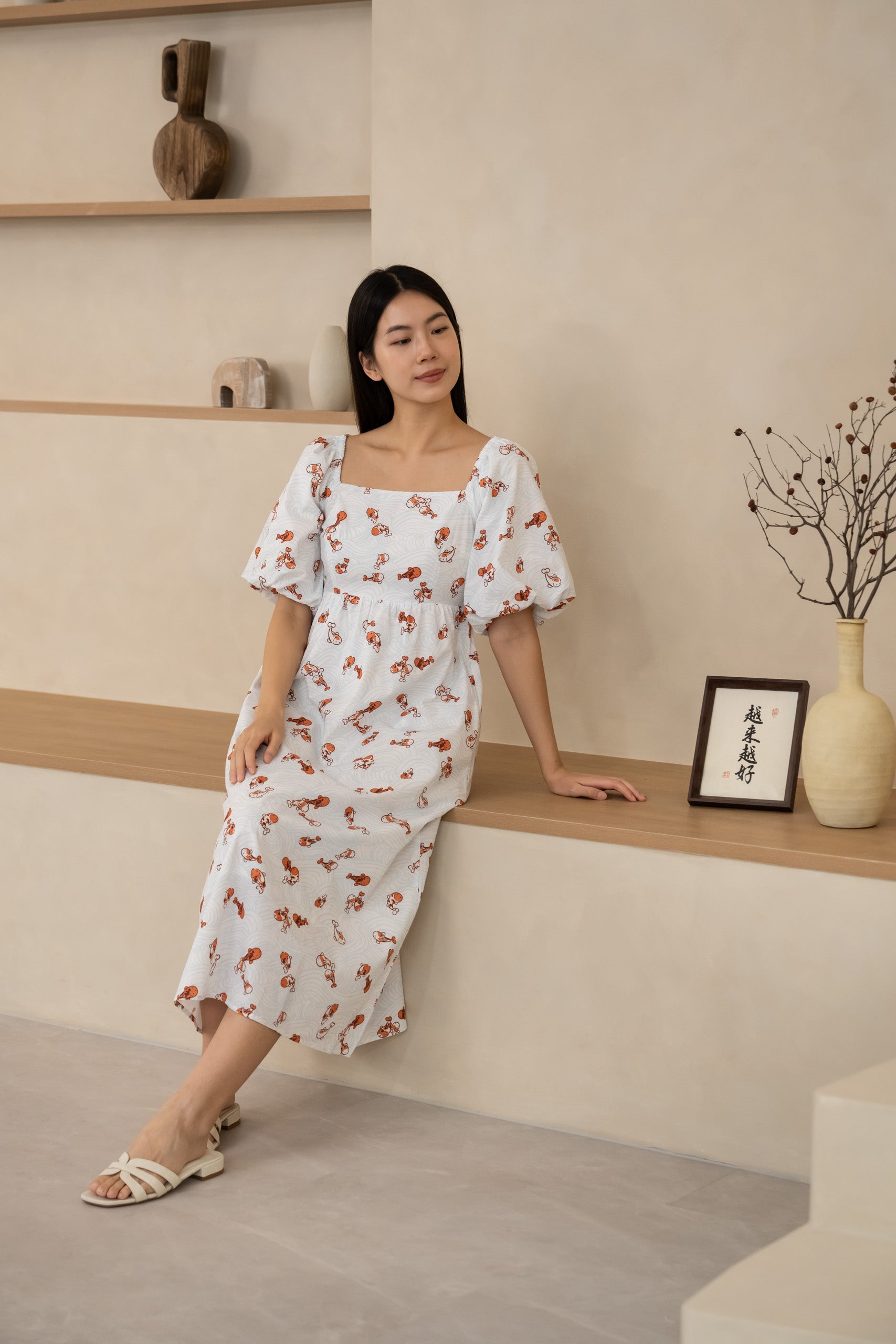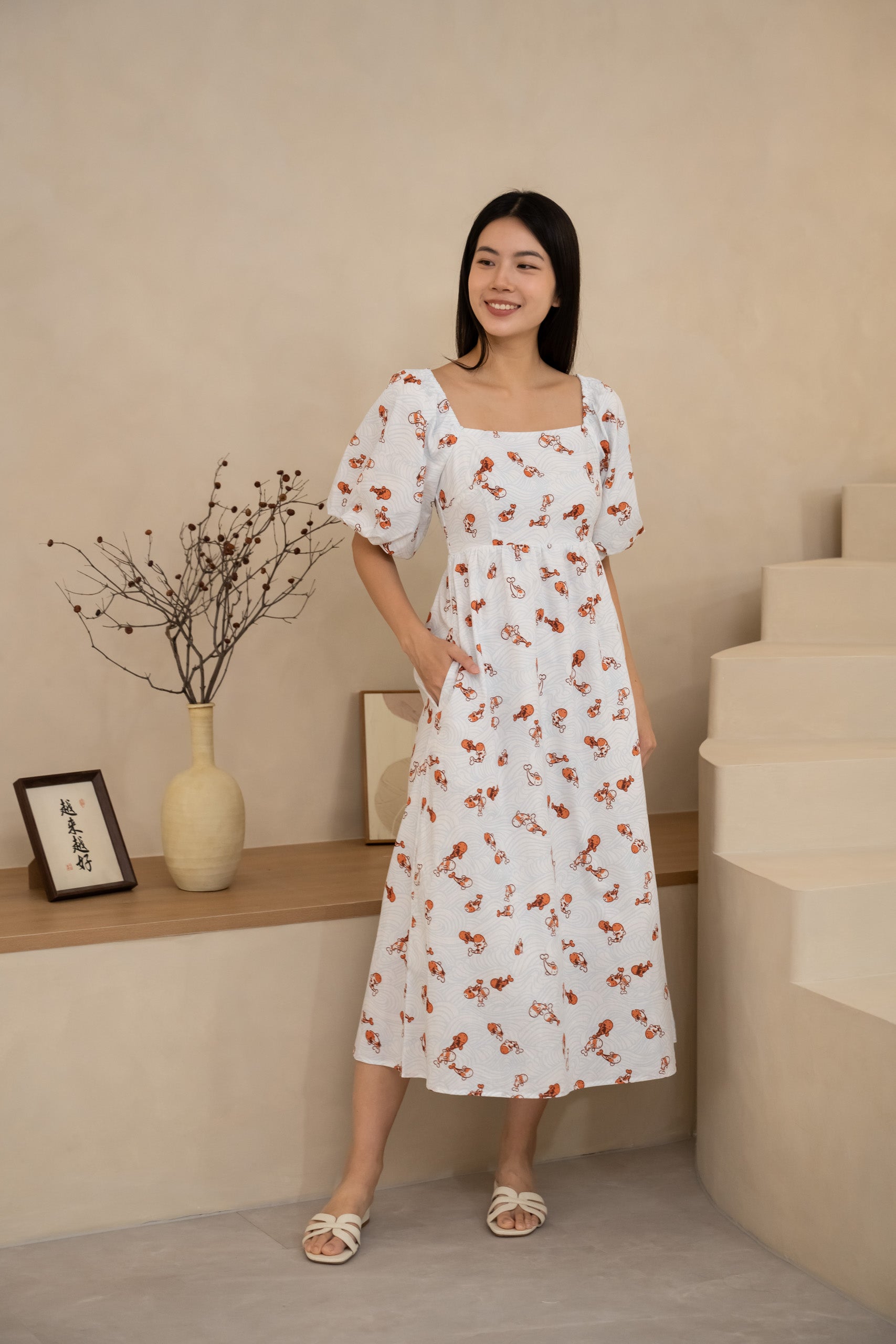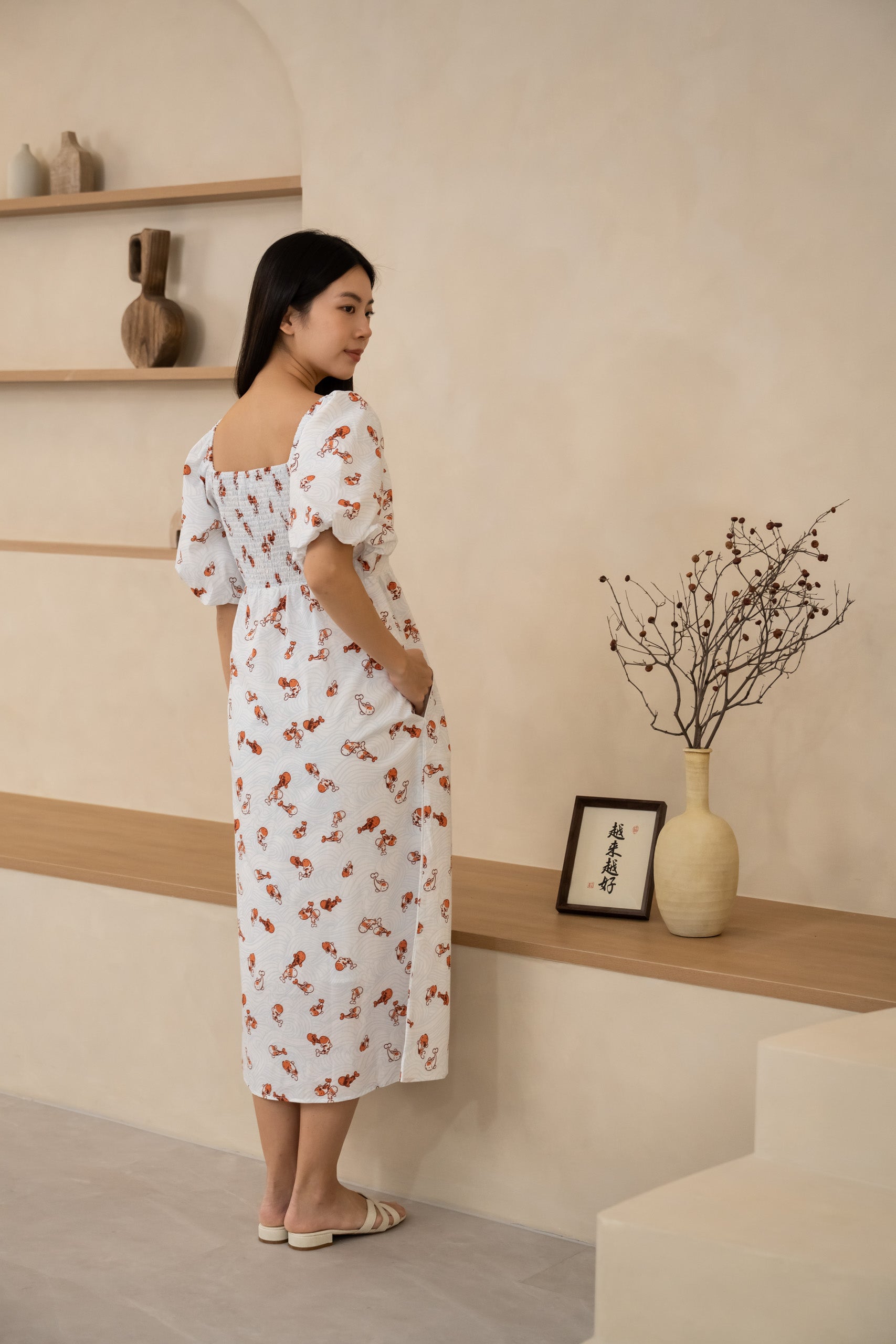 A feminine silhouette designed for modern celebrations. Features a square neckline, soft puff sleeves, smocked back for comfort, and our exclusive Koi Serenade print inspired by Japanese koi and flowing waves. Made with crisp 100% cotton that softens beautifully after wash.