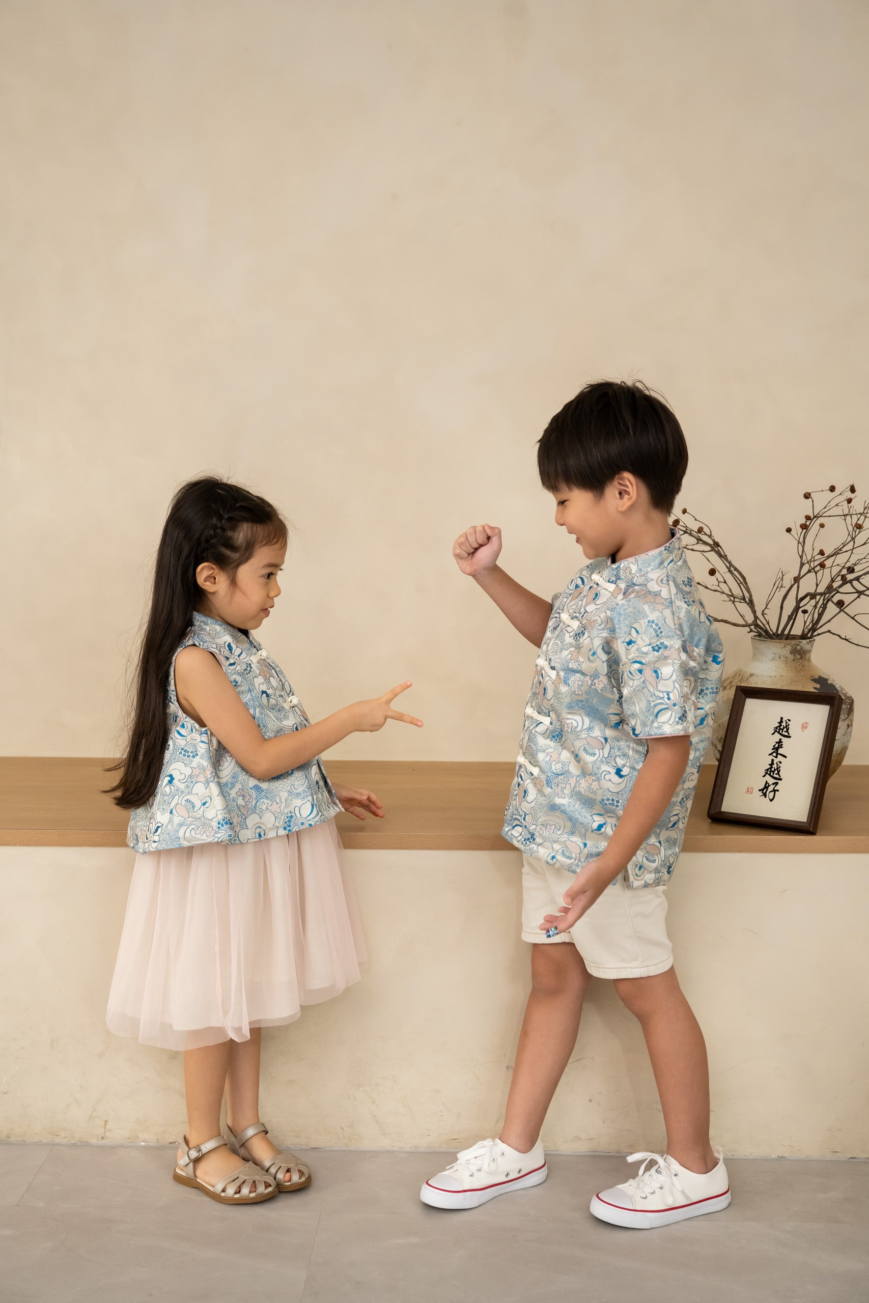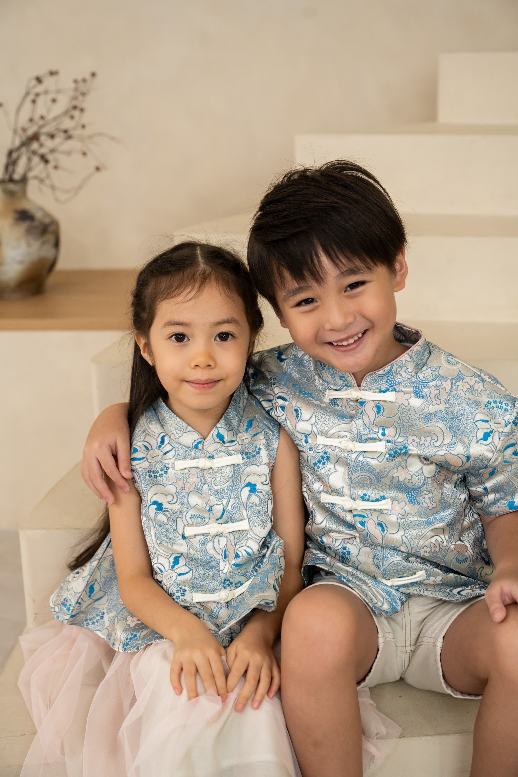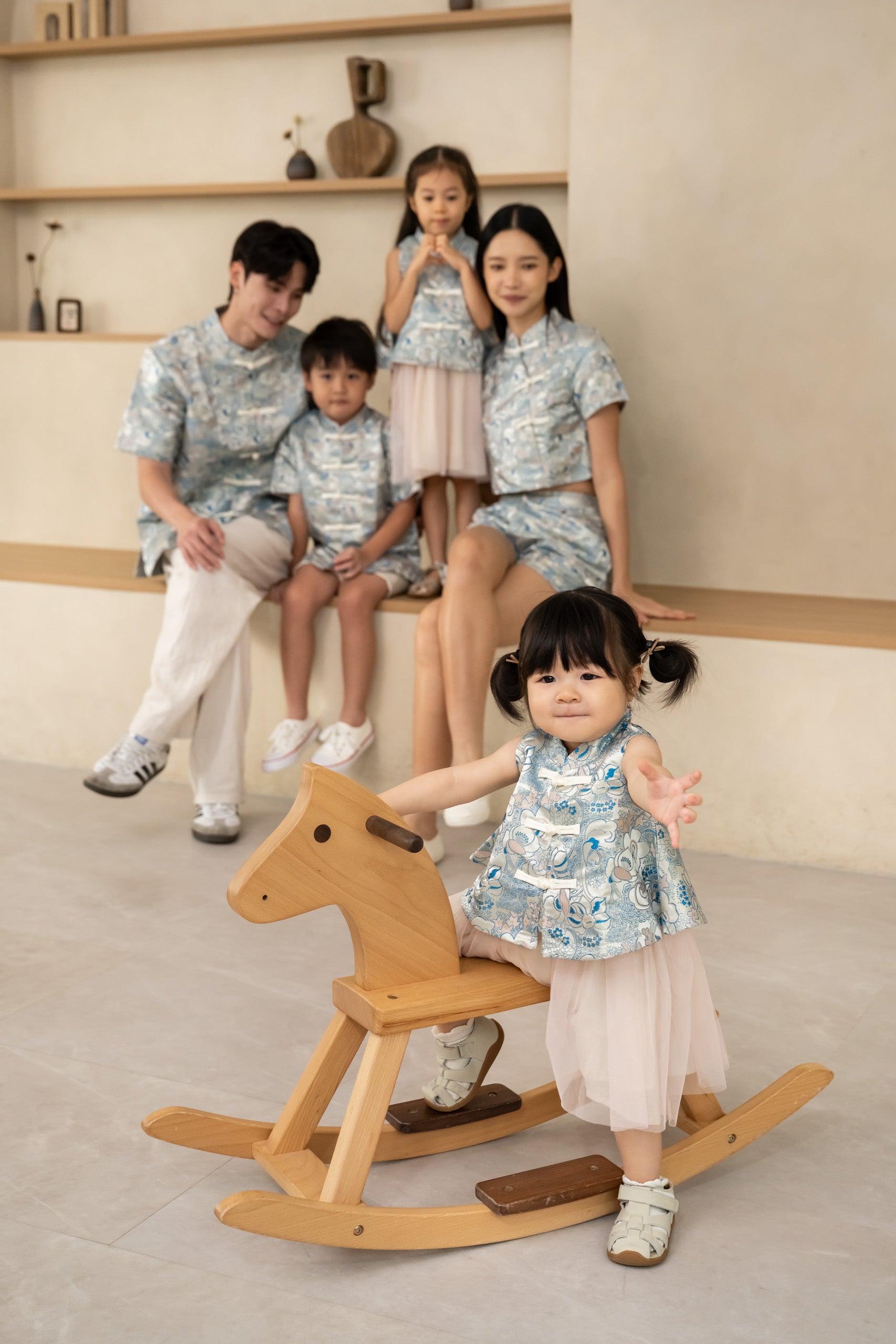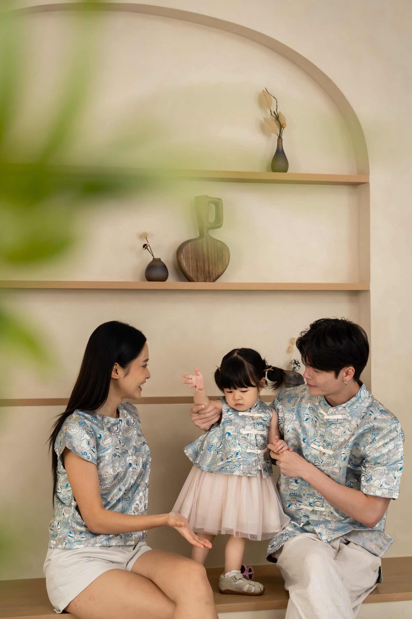 The Porcelain Blue Tulle Duo Set features a cheongsam top layered over a soft tulle skirt, creating a light and elegant silhouette for little girls. Designed for comfort and movement, it’s perfect for festive photos and family gatherings.