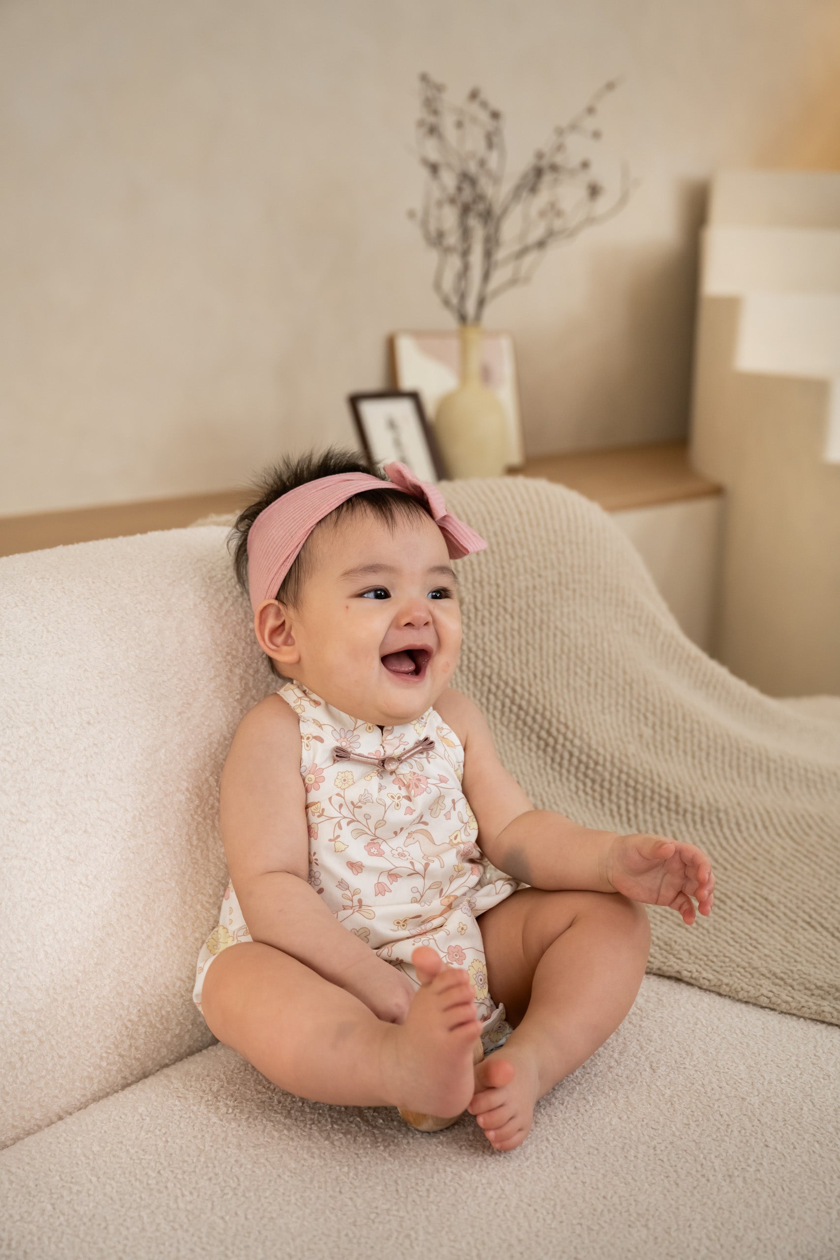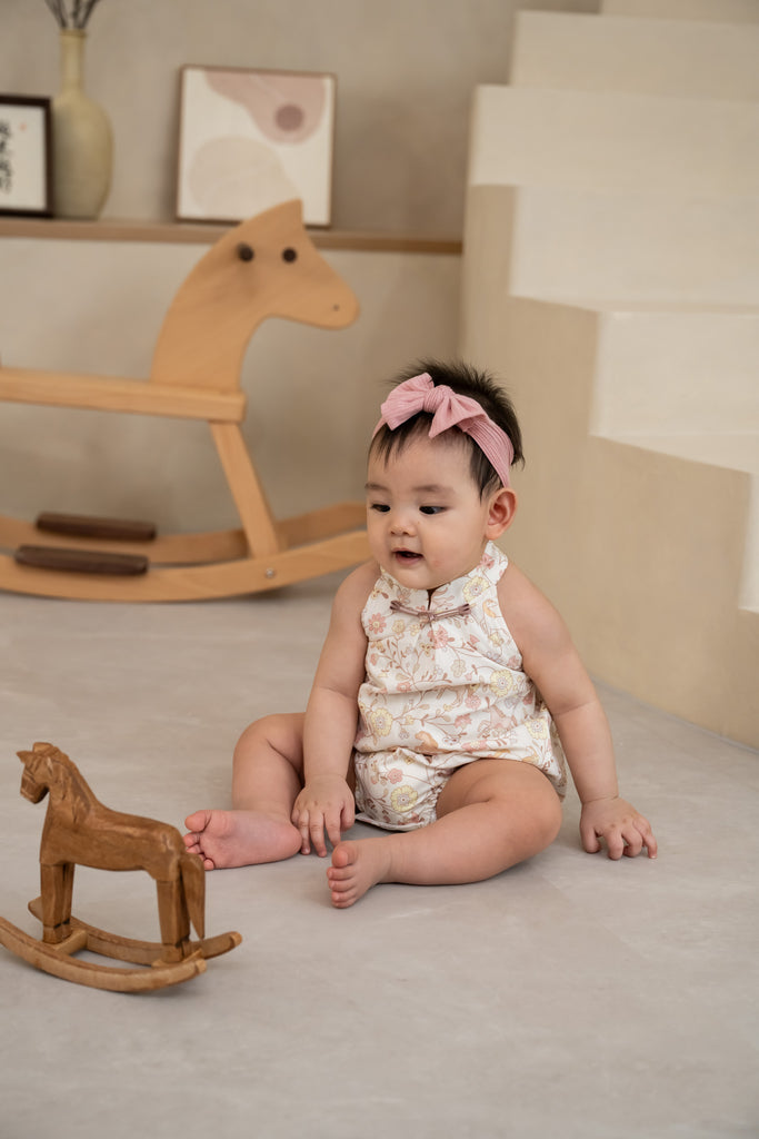 Designed with a sweet oriental-inspired collar and finished with a delicate pearl-tipped oriental button, this romper brings a mini heritage touch to baby’s first (or second!) New Year. The halter-style neckline keeps the look clean and modern, while the soft elastic back ensures a comfortable fit that moves with your baby.