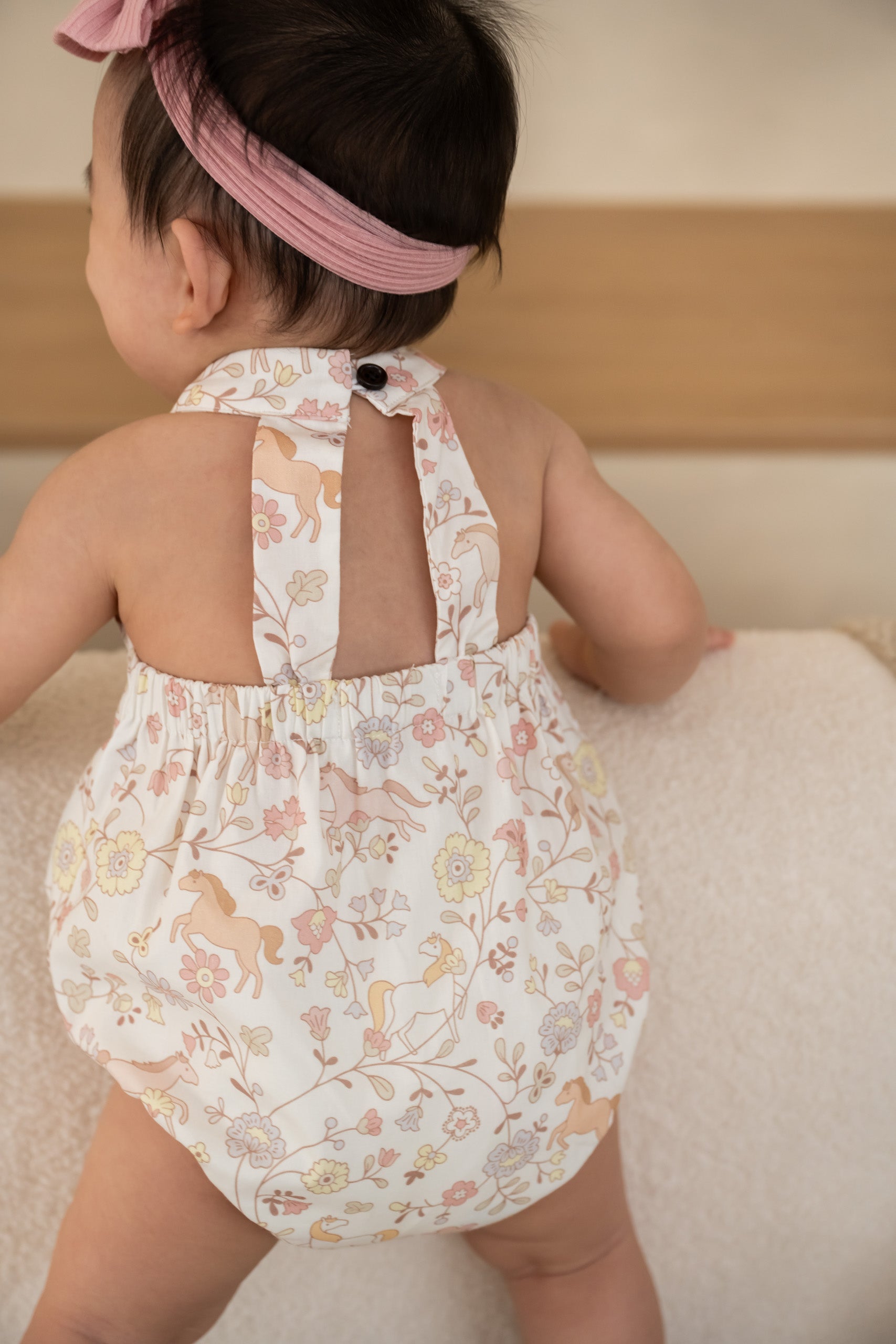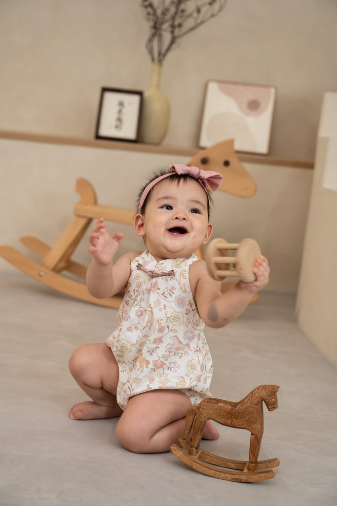 Dress your little one in festive charm with our Springwood Meadow Baby Oriental Romper (Red) — an exclusive in-house print featuring gentle prancing horses and soft florals over a warm, CNY-perfect shade of red.