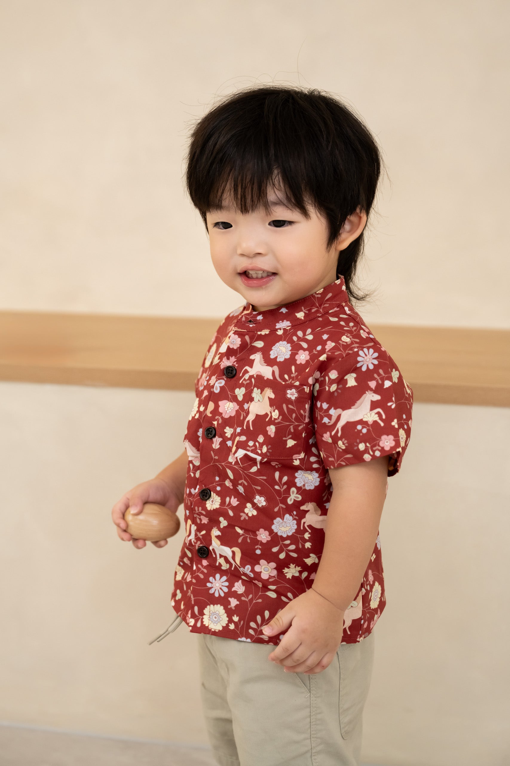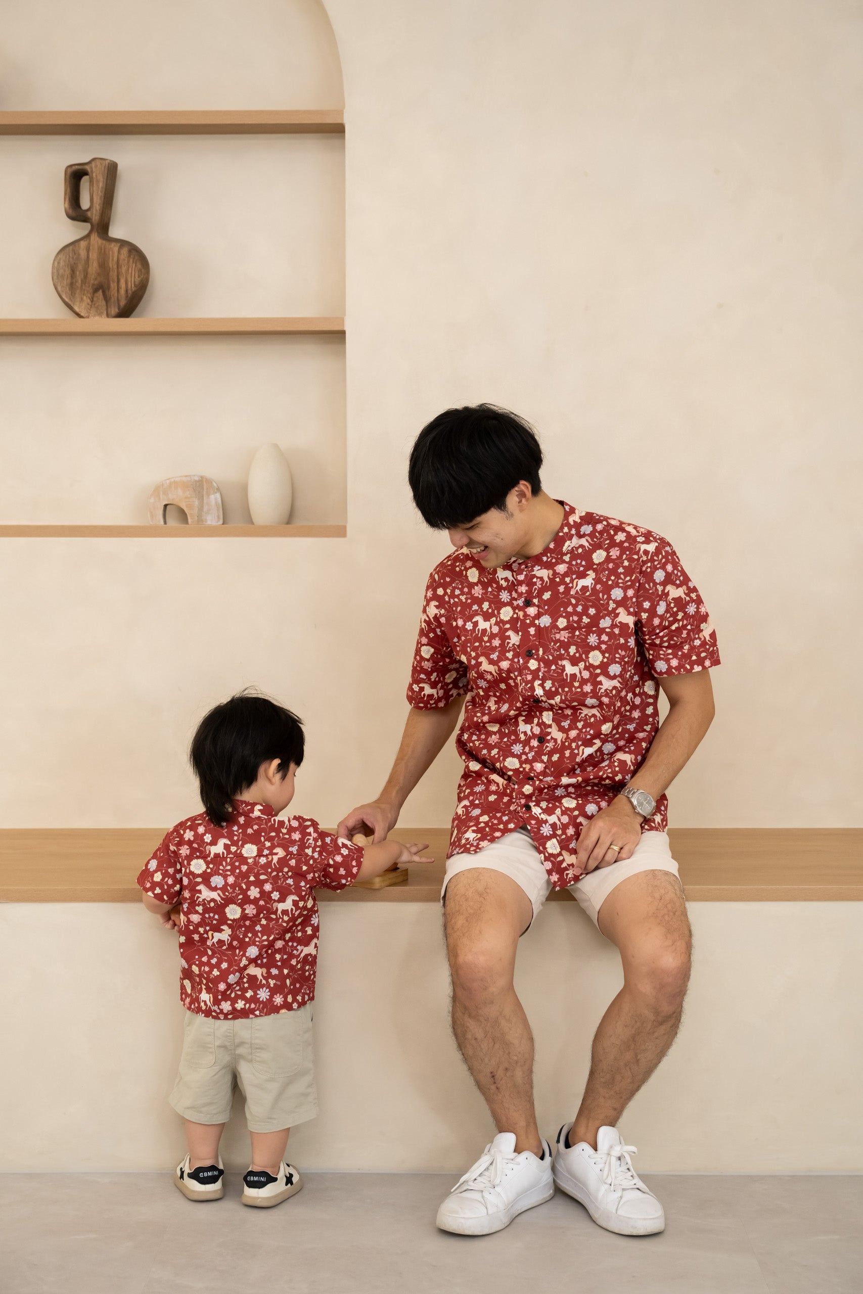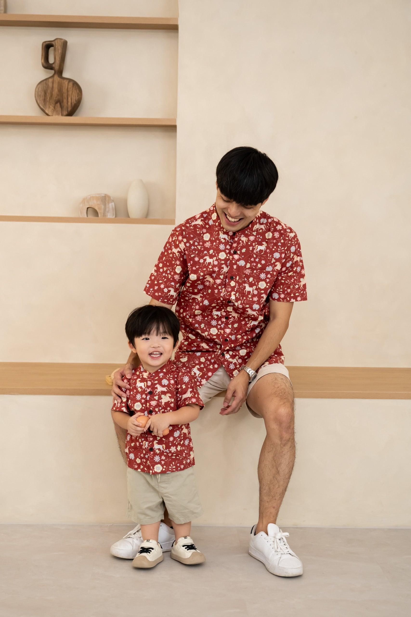 Our Springwood Meadow Boys’ Mandarin Collar Shirt is designed for little ones who love to look just like Daddy. Featuring the same exclusive horse-and-floral print in festive red, this shirt brings a charming oriental touch while staying comfortable for everyday play.