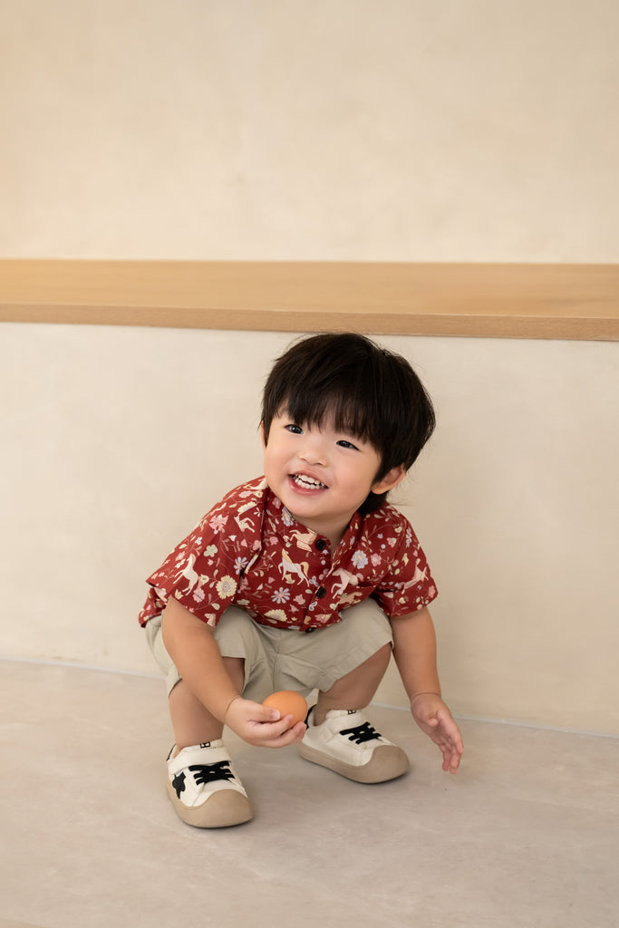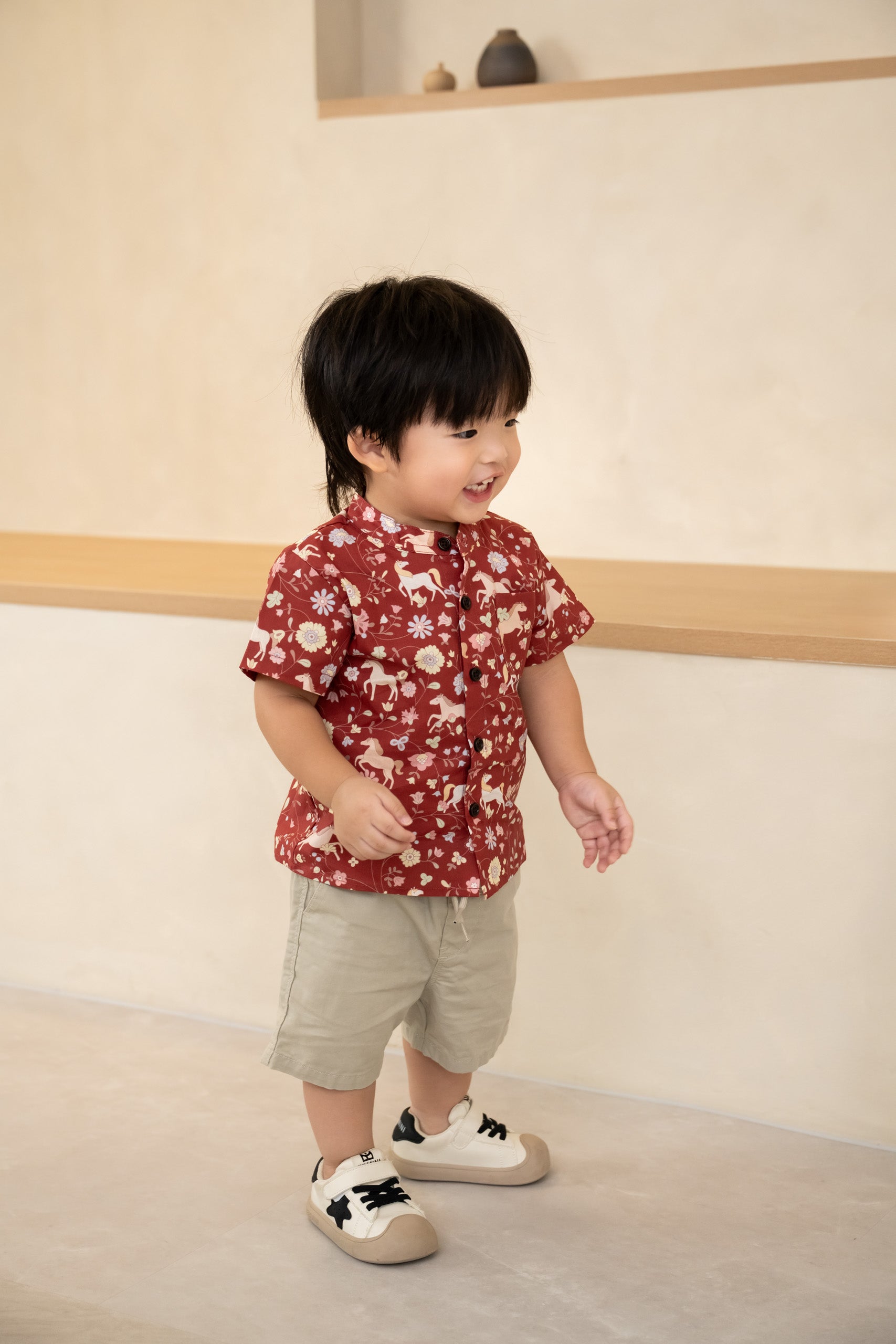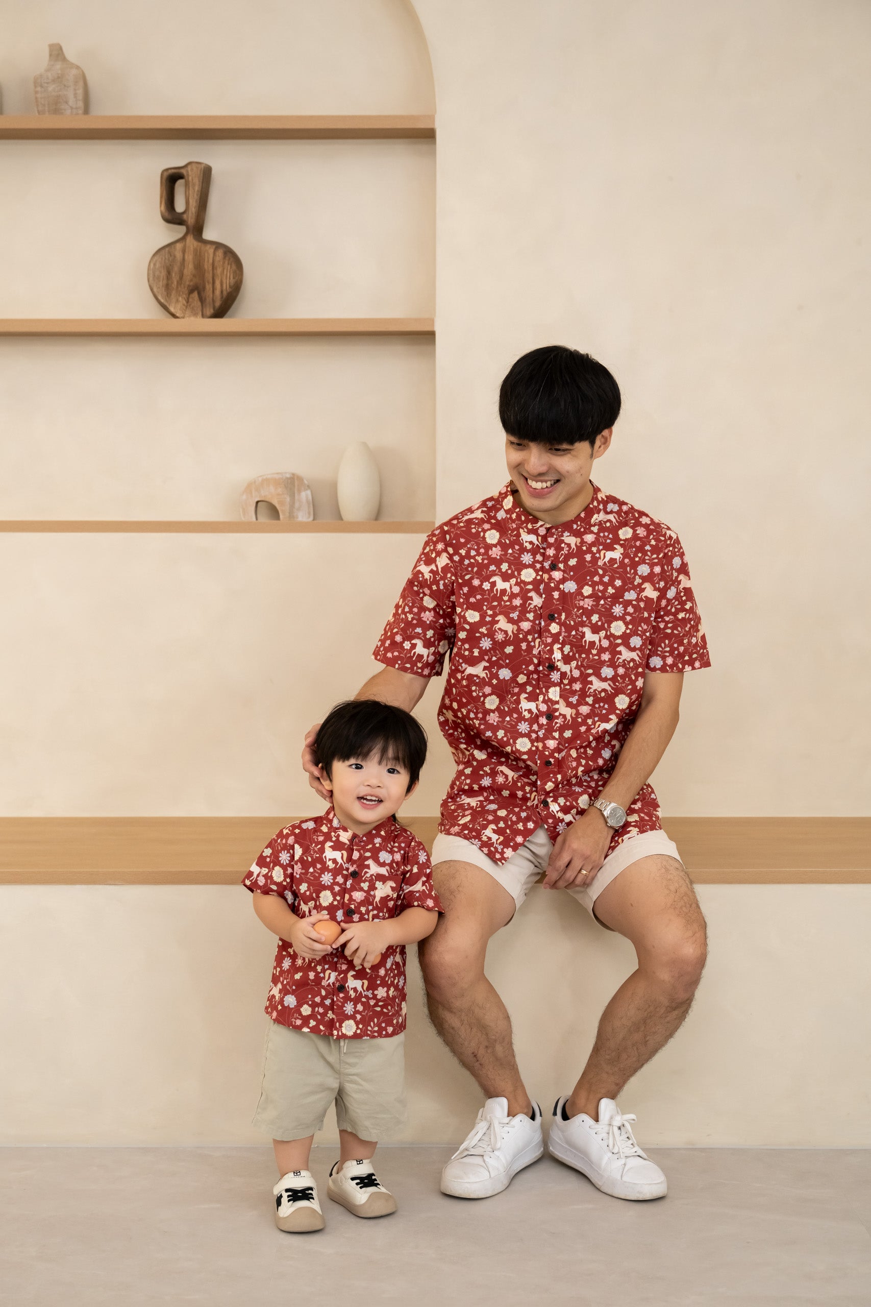 Our Springwood Meadow Boys’ Mandarin Collar Shirt is designed for little ones who love to look just like Daddy. Featuring the same exclusive horse-and-floral print in festive red, this shirt brings a charming oriental touch while staying comfortable for everyday play.