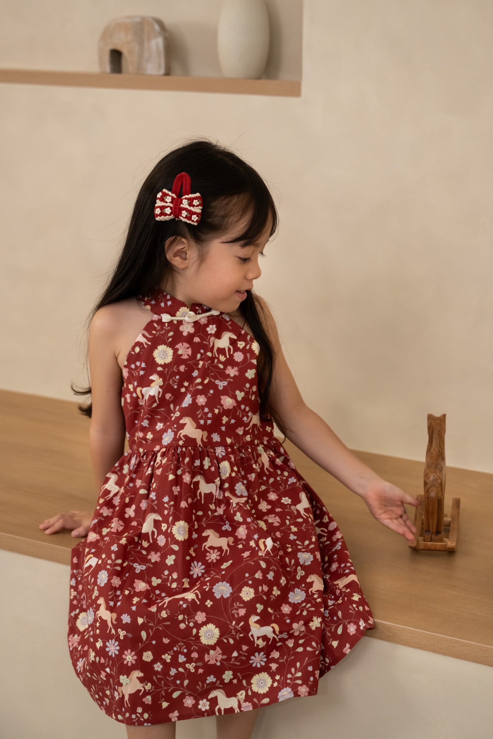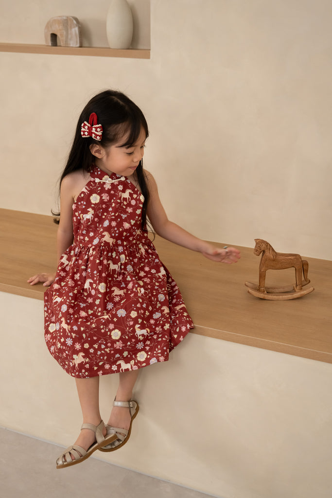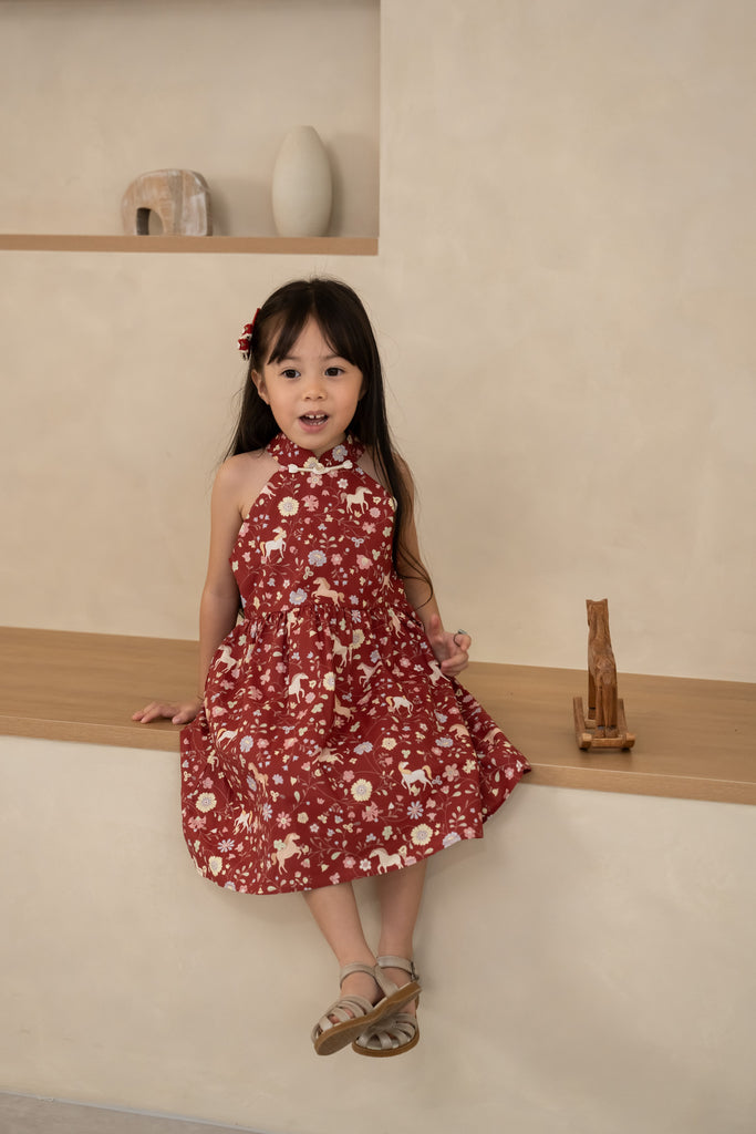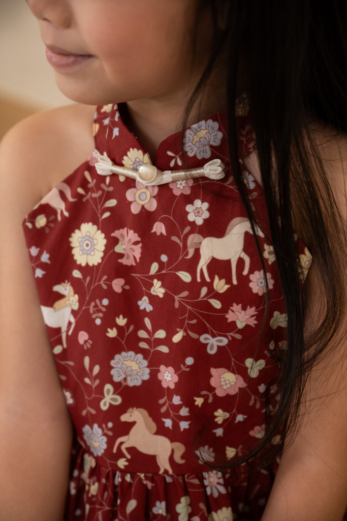 Introducing our Springwood Meadow Oriental Halter Dress (Girls) in a rich festive red, featuring an exclusive in-house print of prancing horses and blooming florals. This elegant halter silhouette is thoughtfully designed with a modern oriental collar, finished with a delicate pearl-tipped oriental button for a soft, heritage-inspired touch.