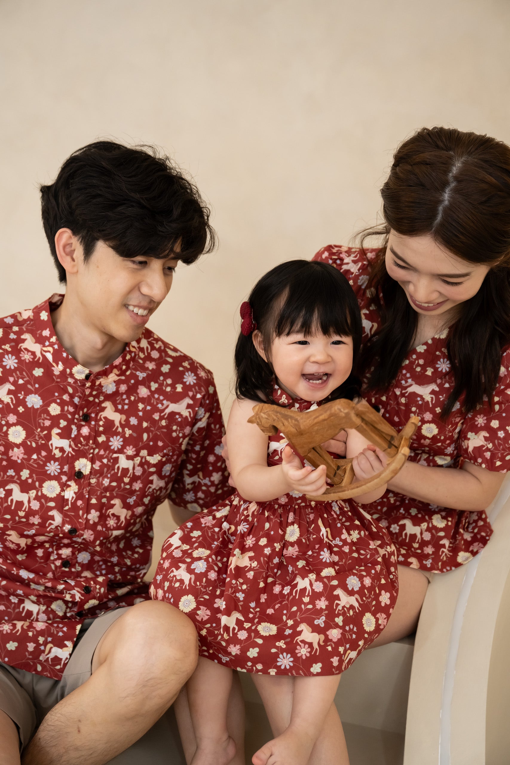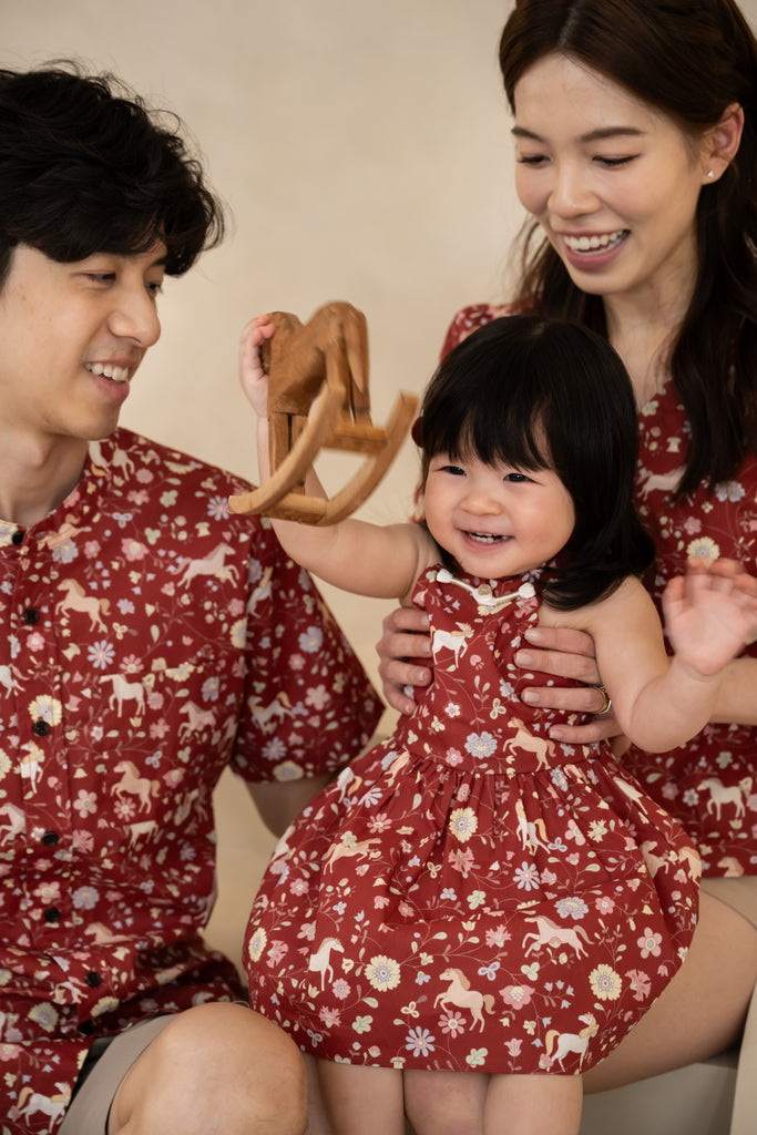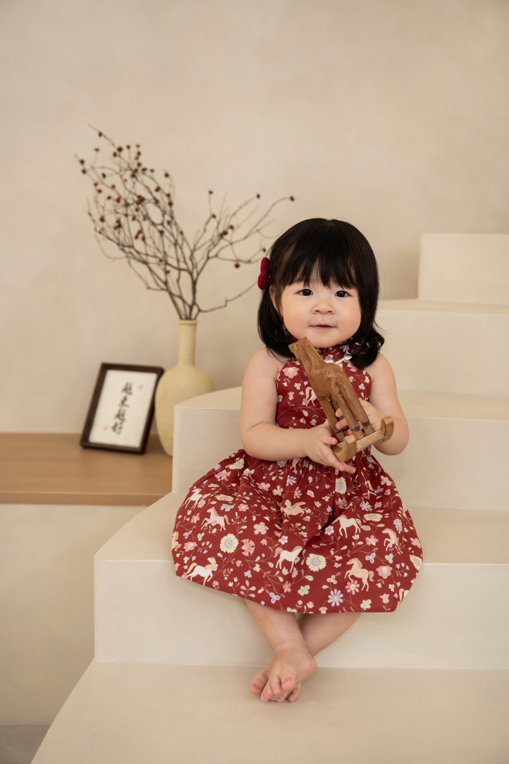 Introducing our Springwood Meadow Oriental Halter Dress (Girls) in a rich festive red, featuring an exclusive in-house print of prancing horses and blooming florals. This elegant halter silhouette is thoughtfully designed with a modern oriental collar, finished with a delicate pearl-tipped oriental button for a soft, heritage-inspired touch.