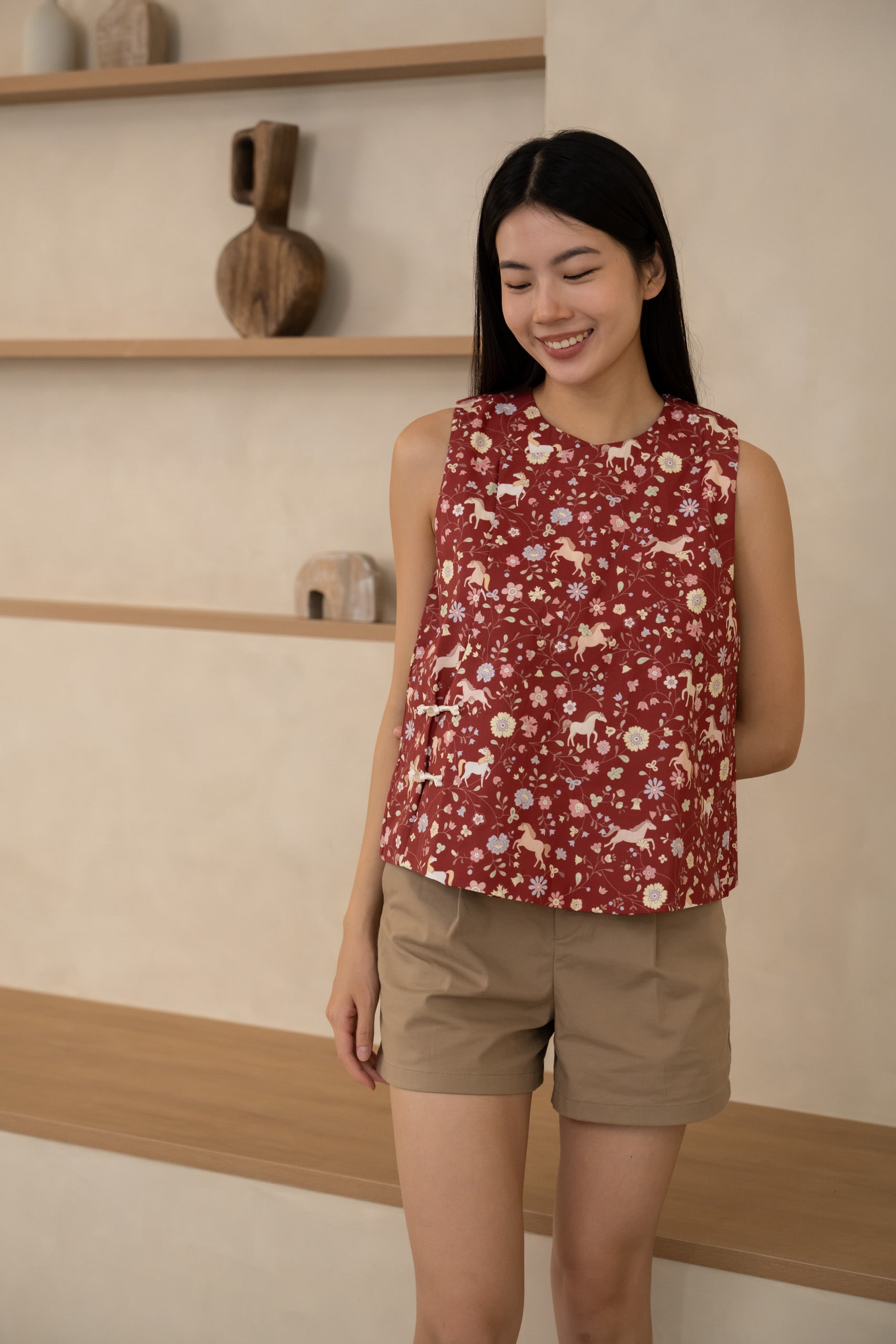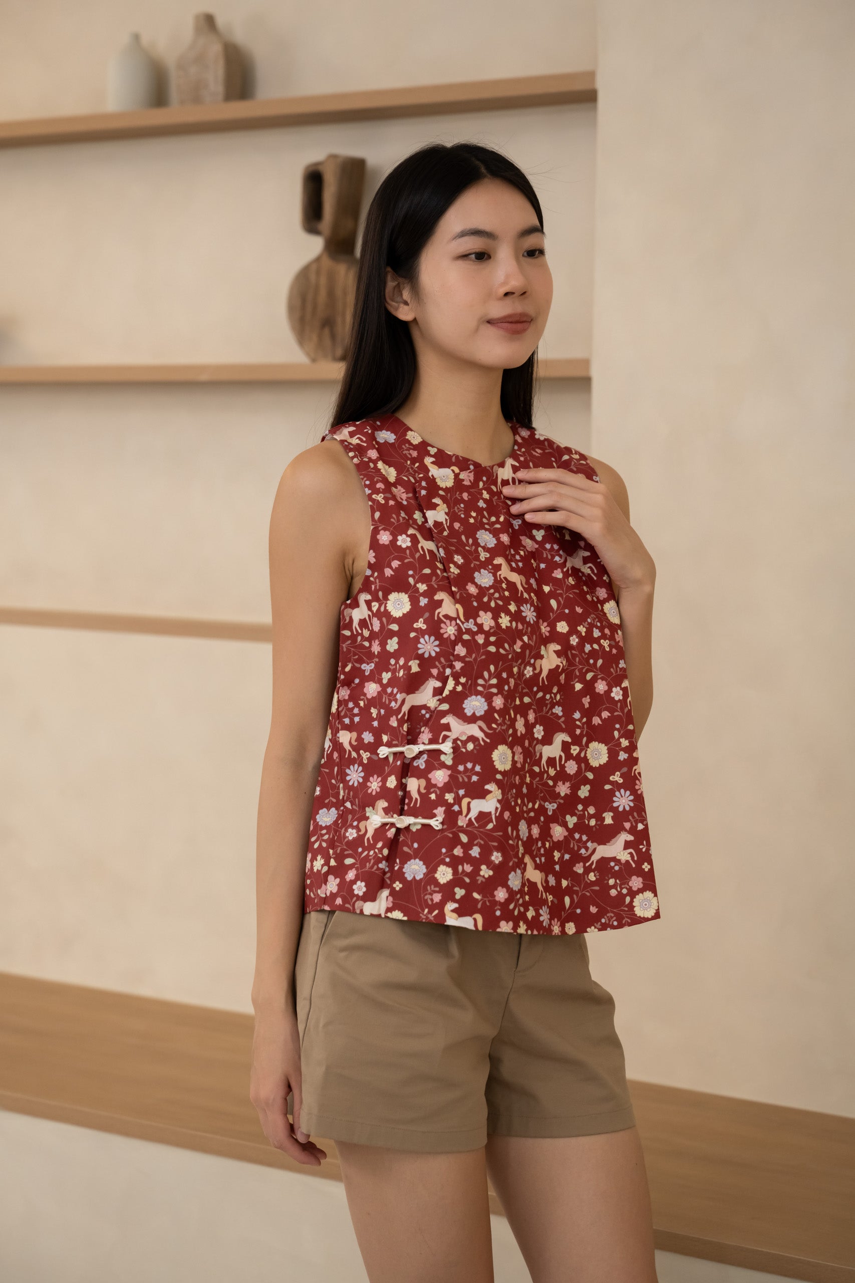 Inspired by timeless oriental elegance, our Springwood Meadow Oriental Nursing Top features an exclusive in-house print of prancing horses and blooming florals over a rich festive red palette. Designed with a sleek oriental button closure at the side panel and a clean sleeveless silhouette, this top blends culture, comfort, and modern femininity seamlessly.