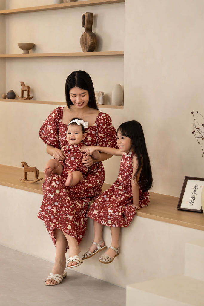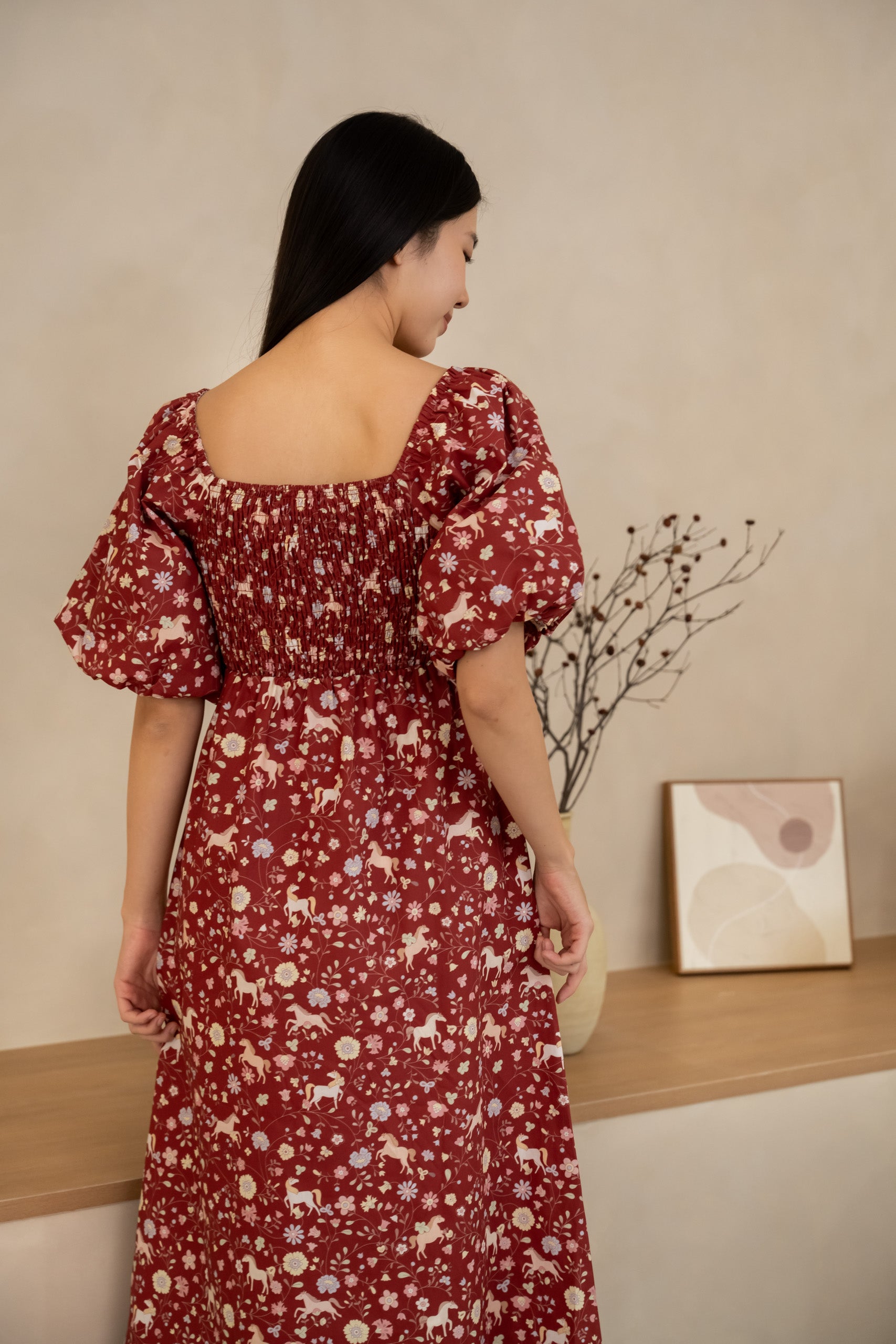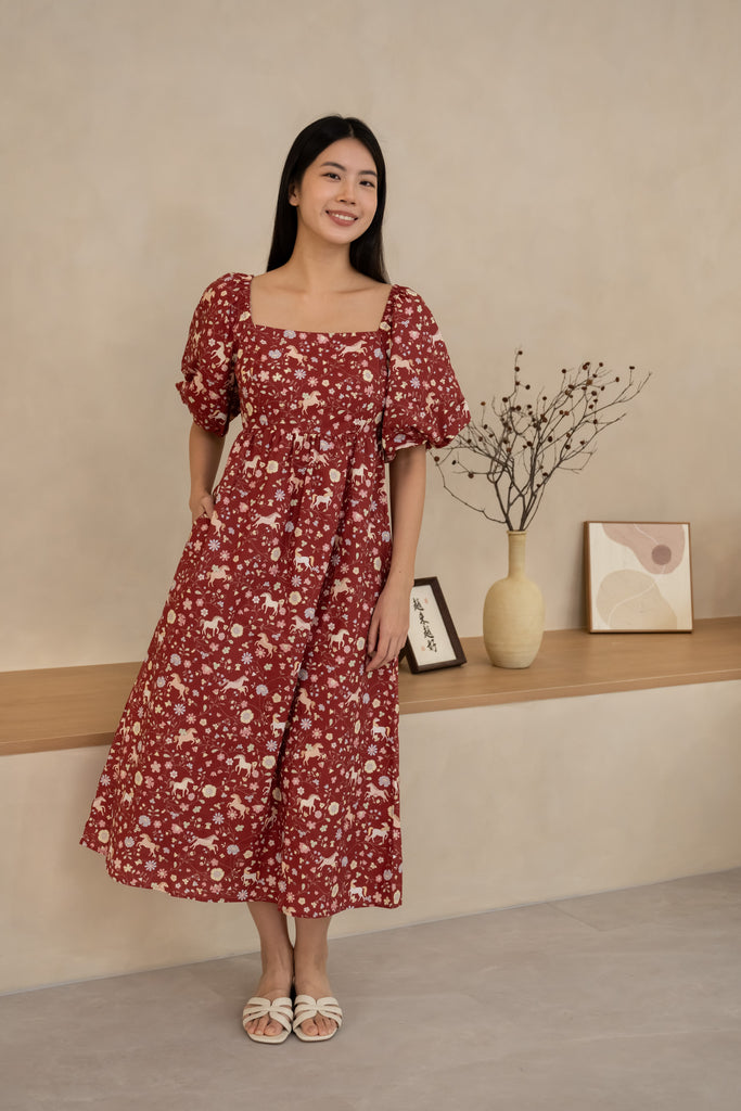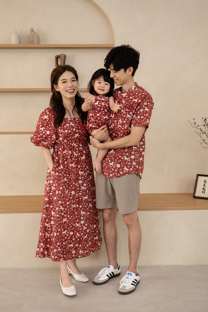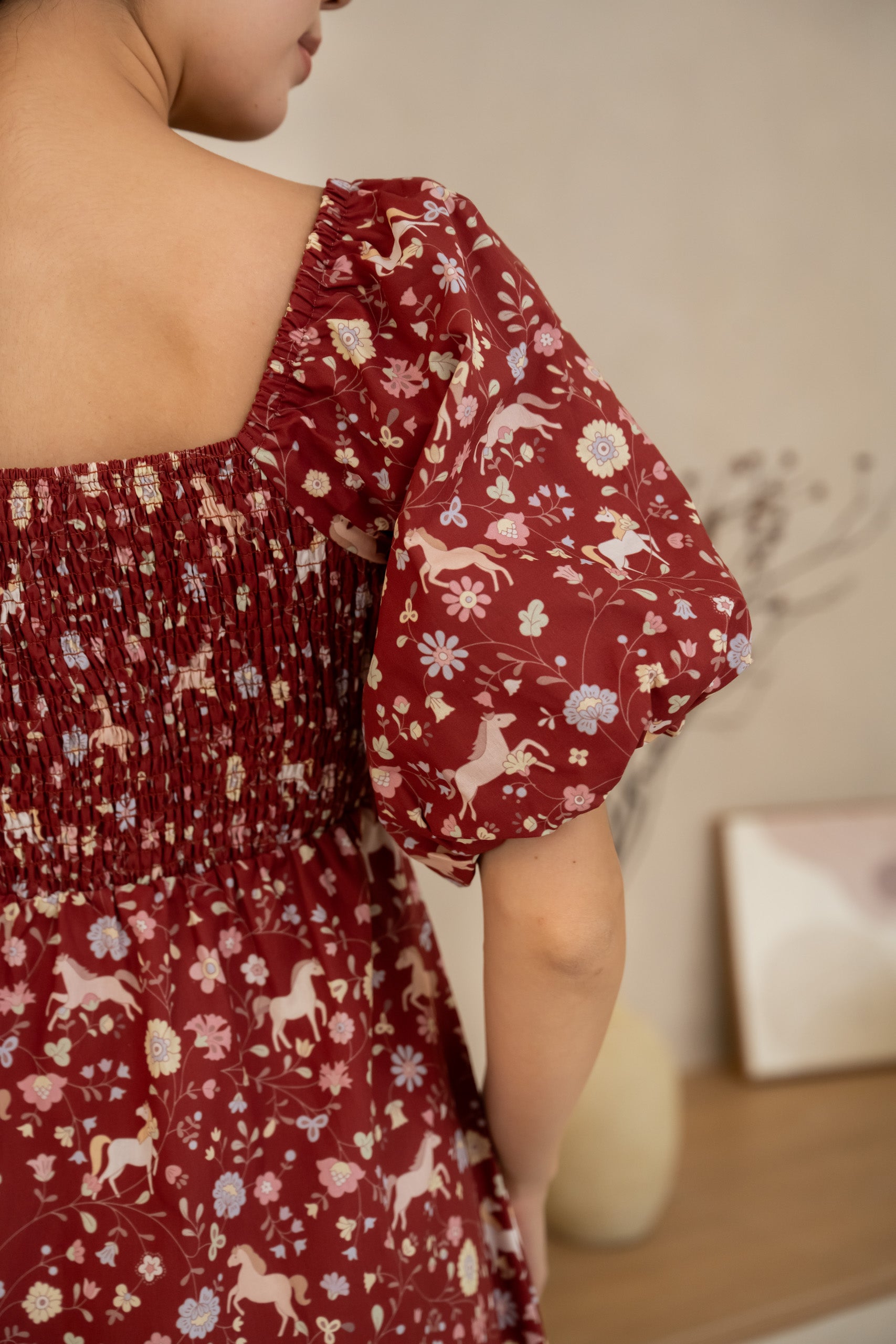 Step into the season with the Springwood Meadow Puff-Sleeve Maxi Dress, featuring our exclusive in-house Springwood Meadow print — a dreamy blend of prancing horses, soft florals, and whimsical meadow elements designed specially for CNY and family shoots.