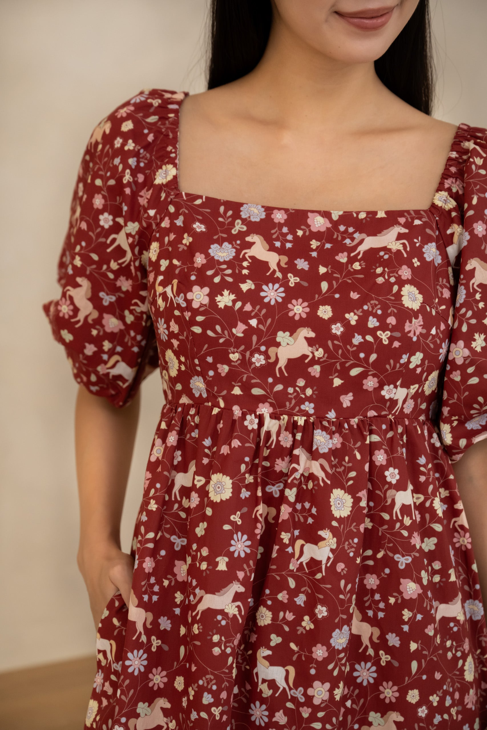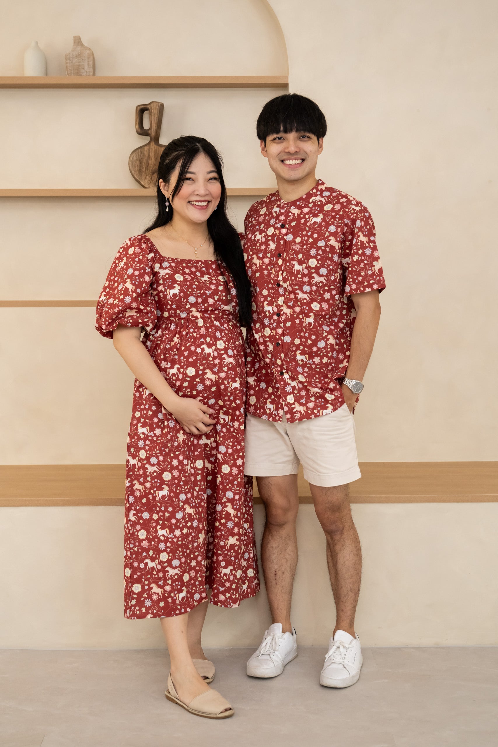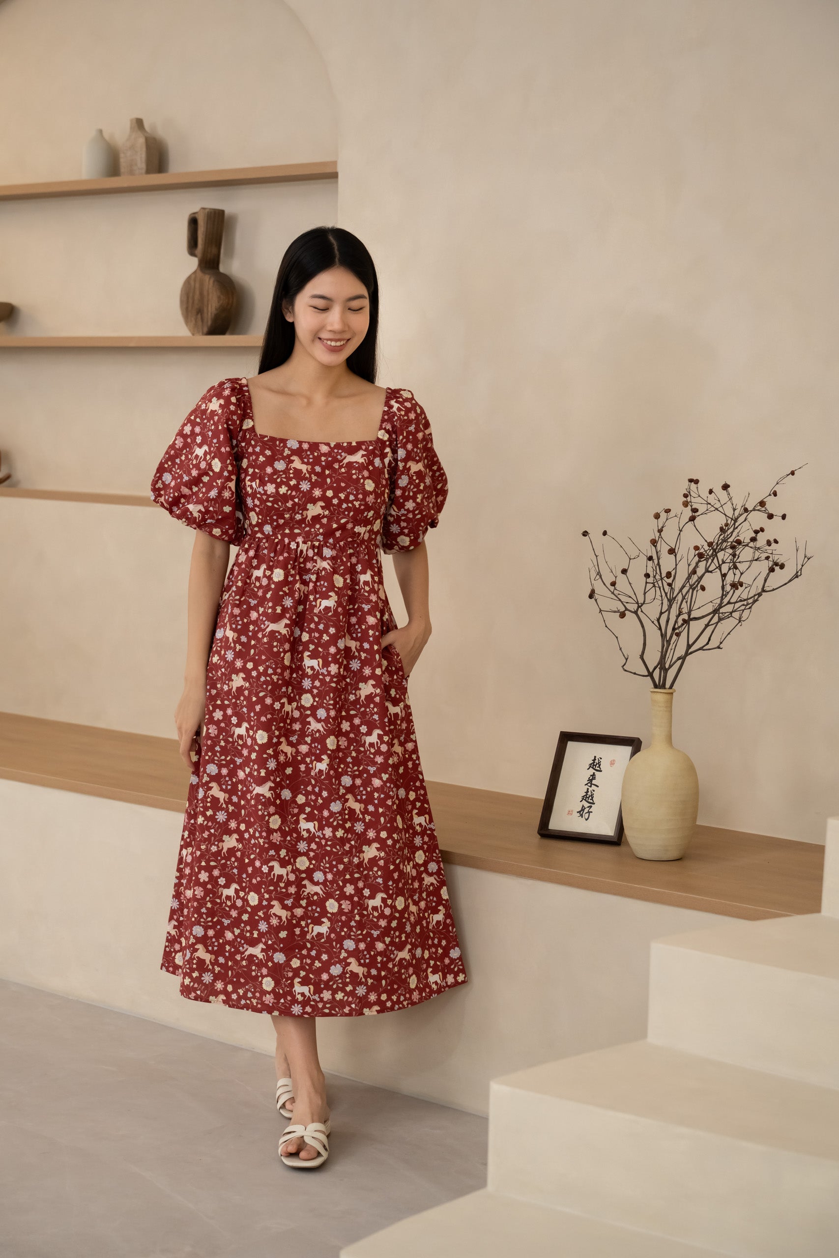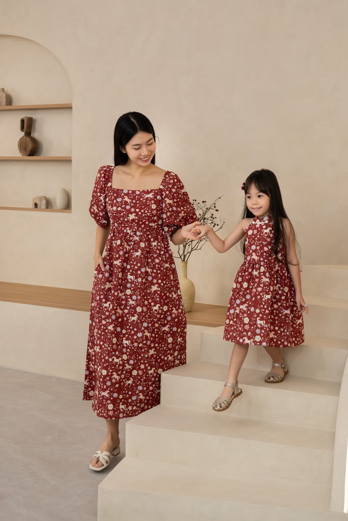 Step into the season with the Springwood Meadow Puff-Sleeve Maxi Dress, featuring our exclusive in-house Springwood Meadow print — a dreamy blend of prancing horses, soft florals, and whimsical meadow elements designed specially for CNY and family shoots.